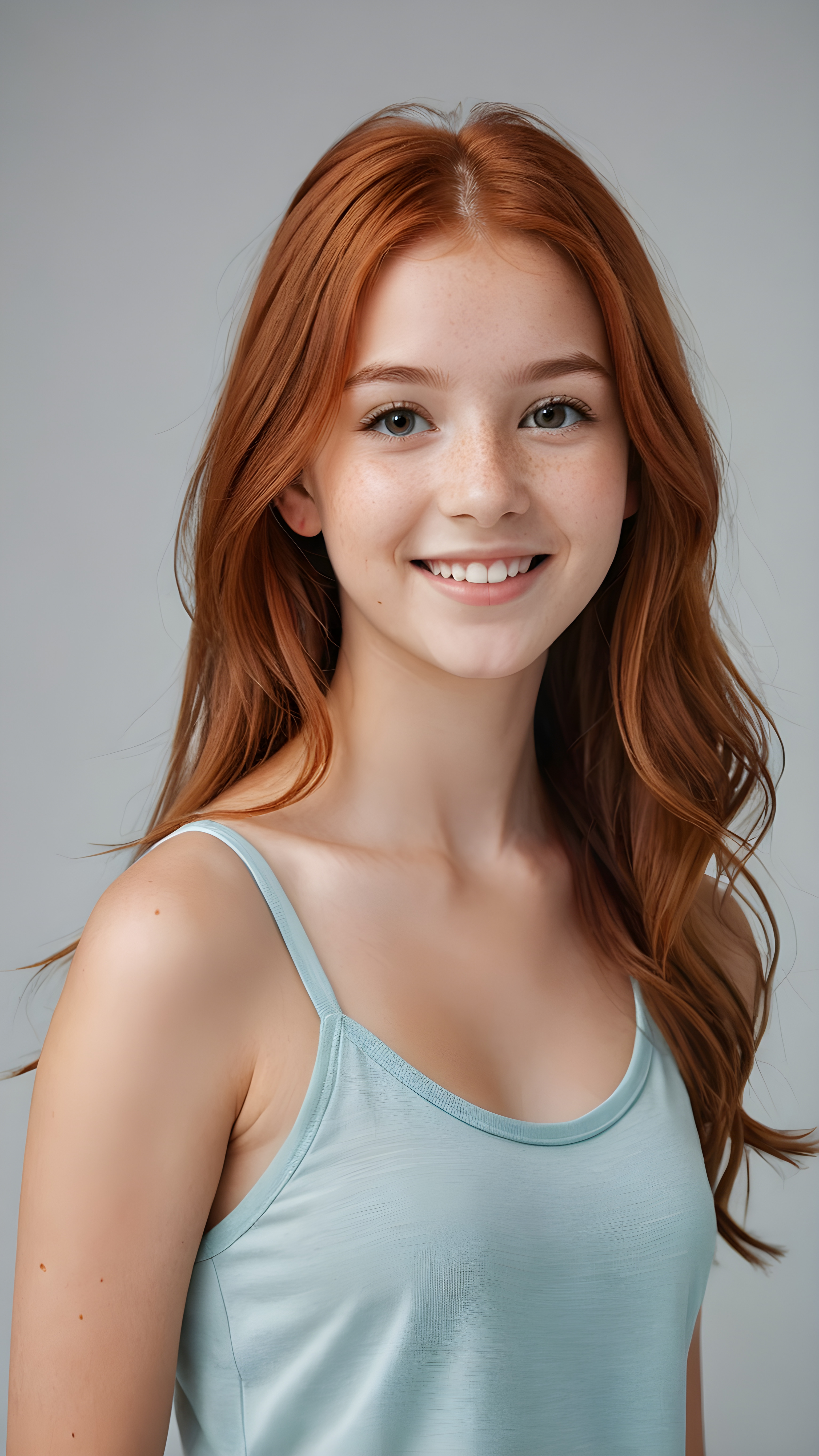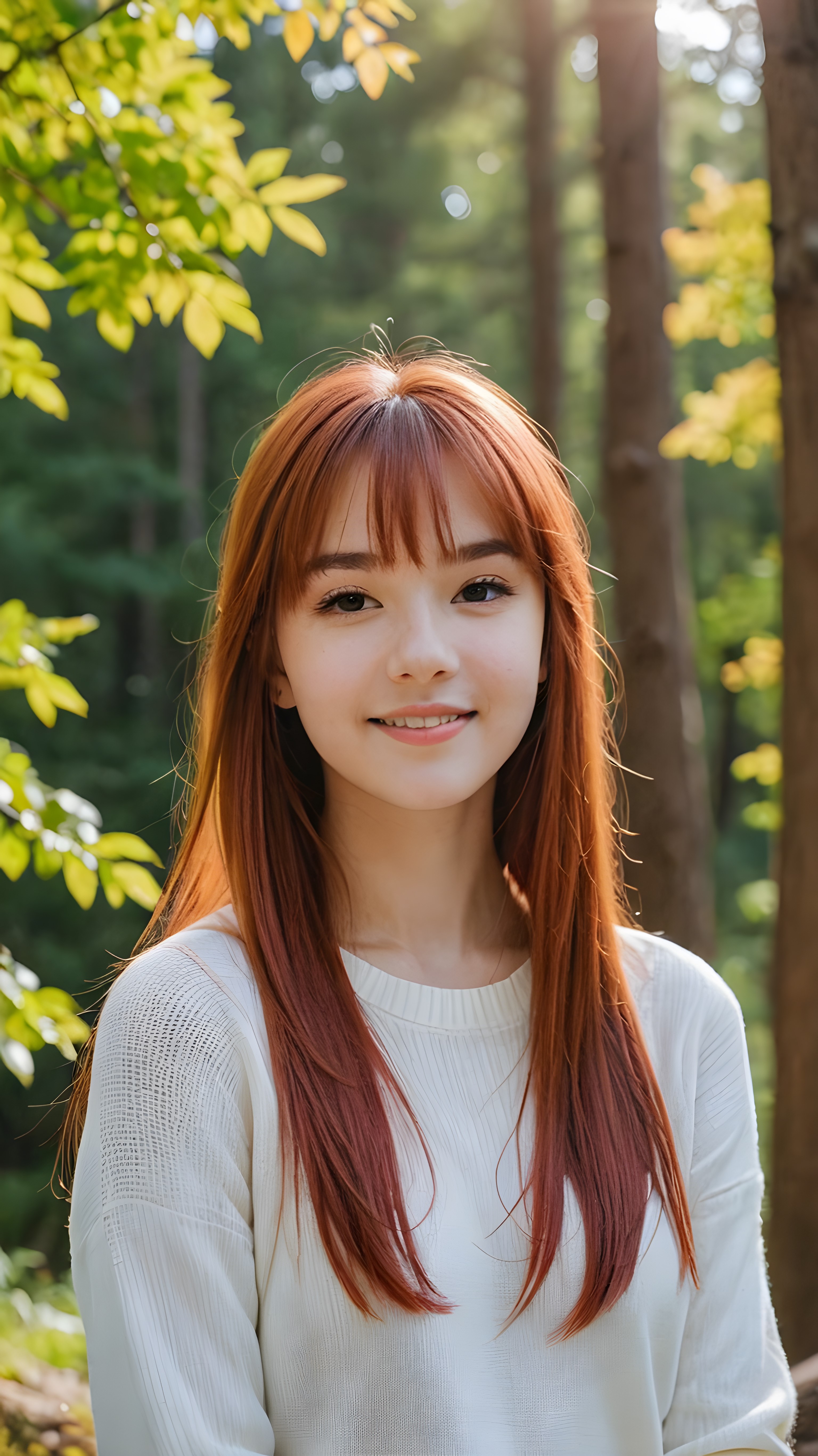 a beautiful (((pretty young teen girl))), with long, silky, shiny straight long neon red hair, bangs cut framing her found face, wearing a thin, white sweater, her hair extends beyond her shoulders, she looks cheerfully at the viewer, perfect curved body, natural backdrop