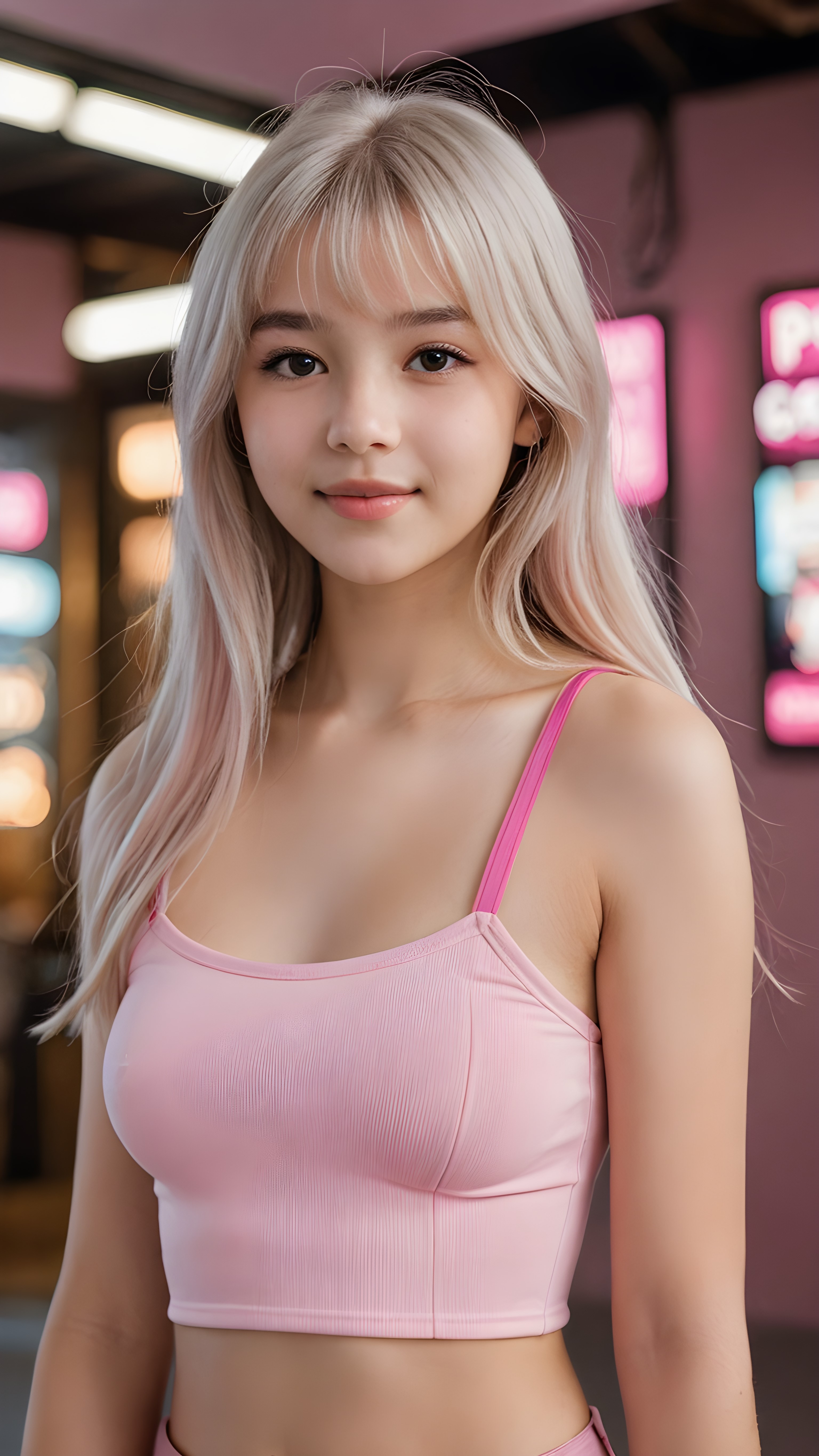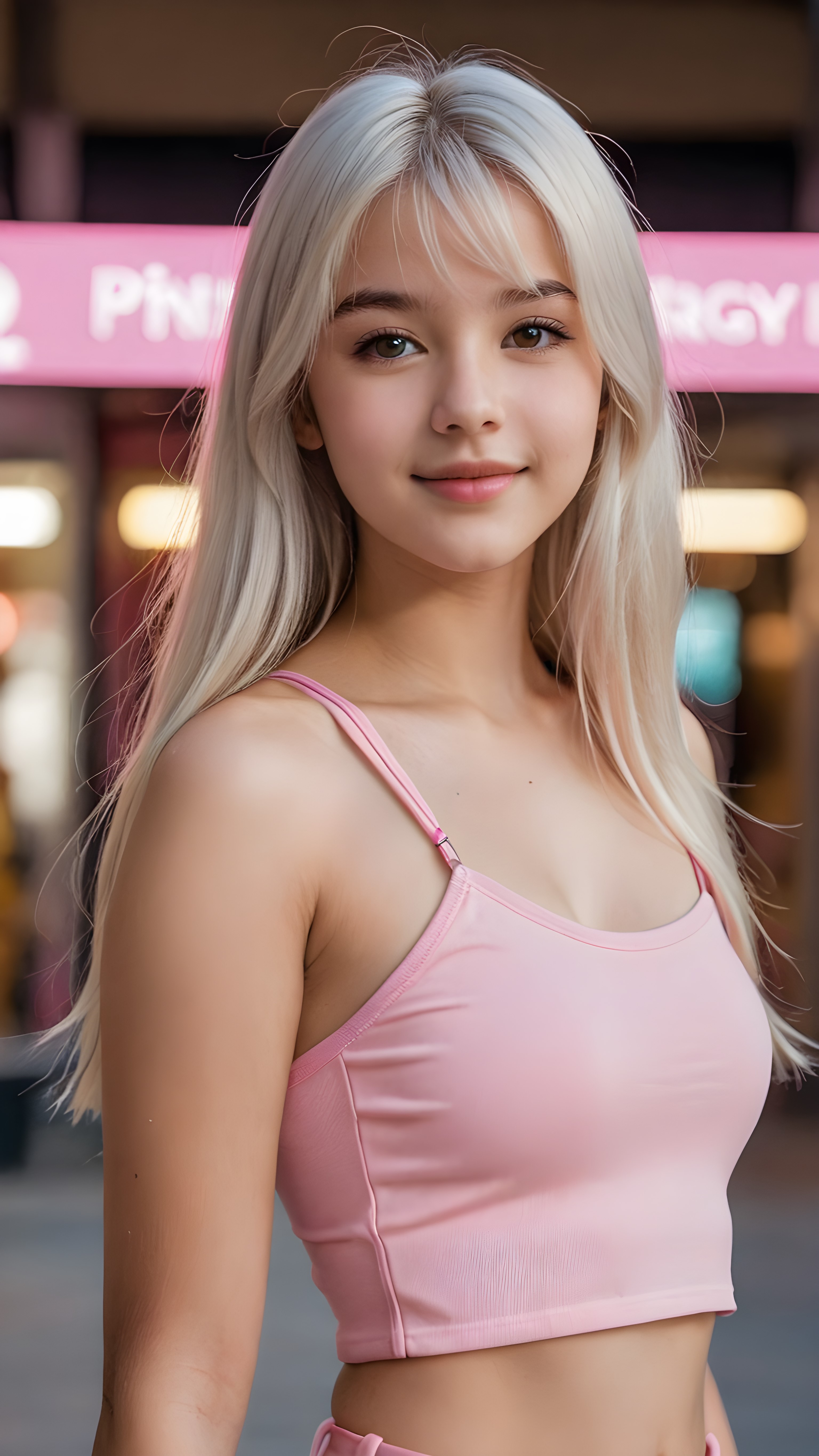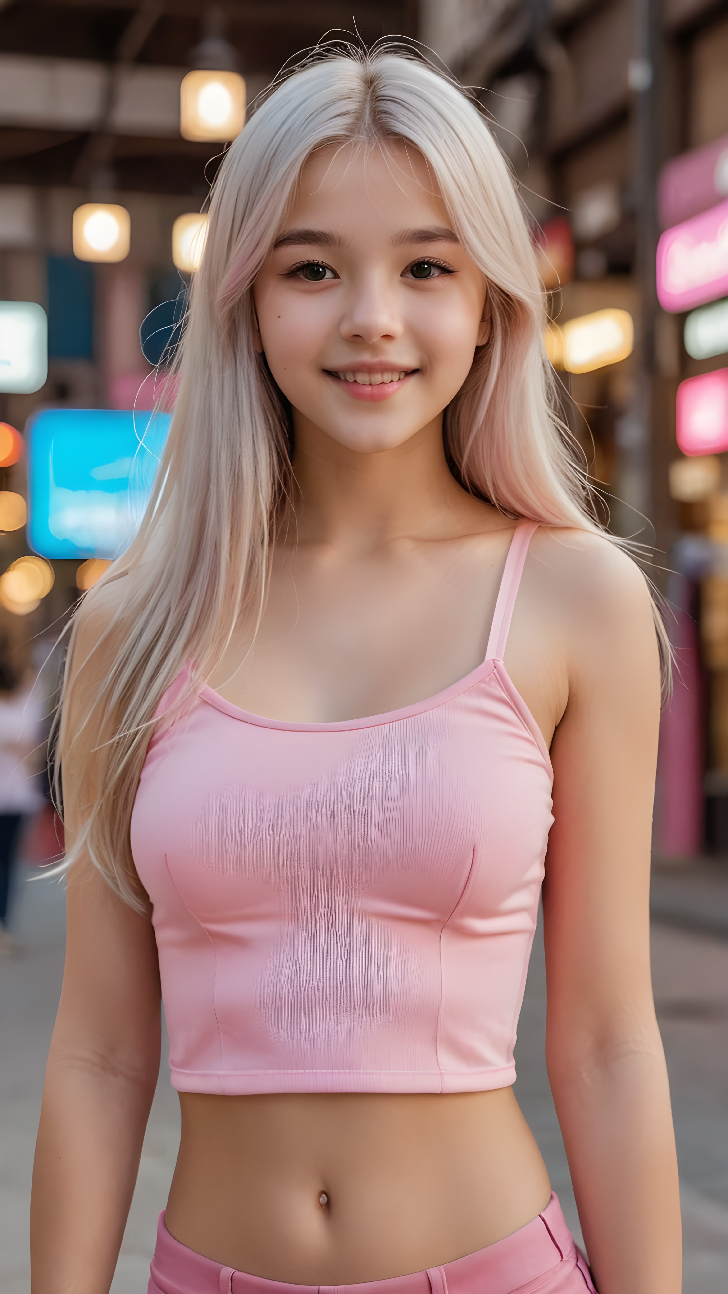 a beautiful realistic photo from a (((pretty young teen girl, 14 years old))), with long, silky, shiny straight long white hair, bangs cut framing her found face, her hair extends beyond her shoulders, she looks cheerfully at the viewer, perfect curved body, (((she is wearing a pink strap crop tube top))) against natural backdrop