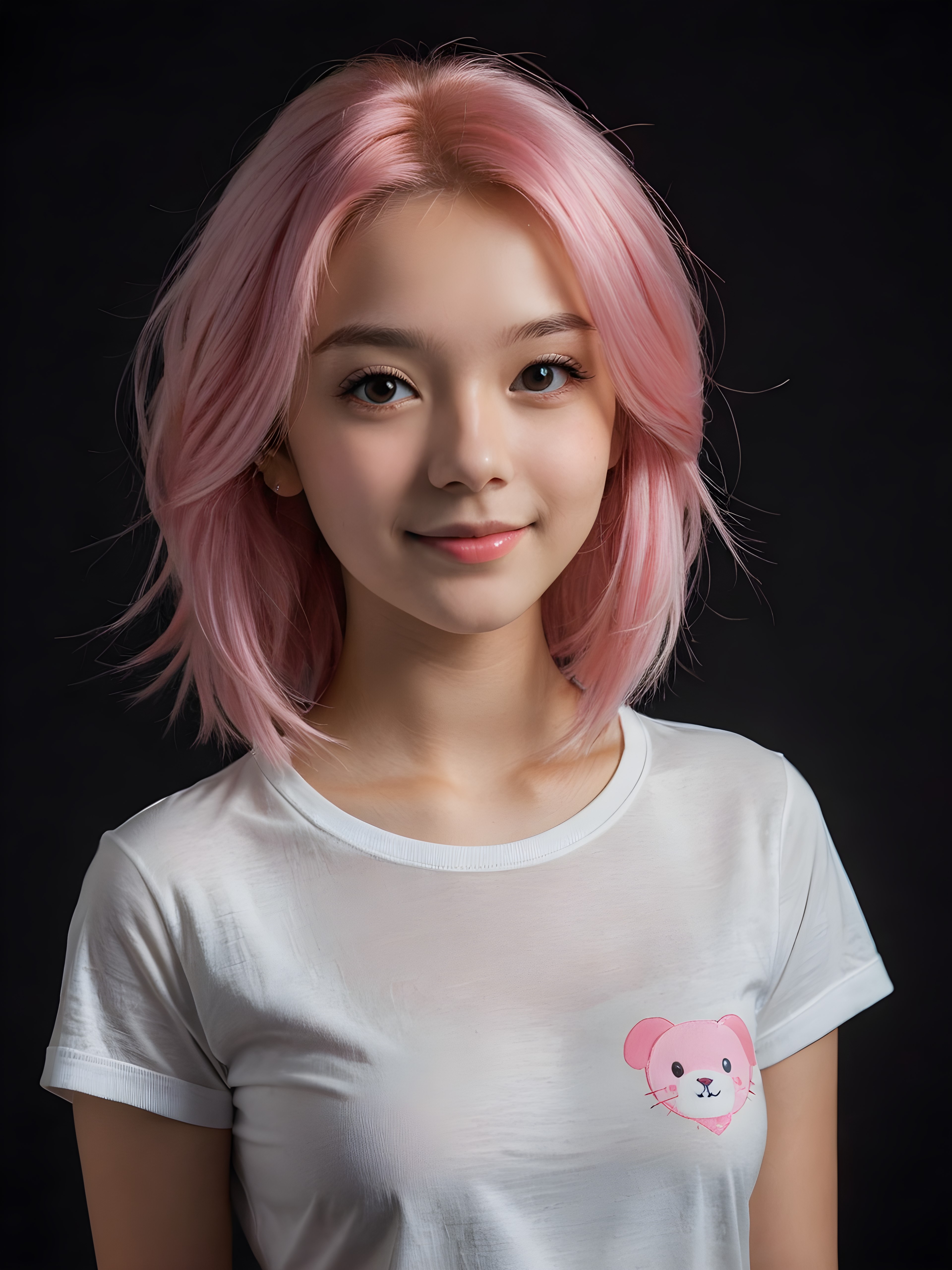 a pretty young girl with silky smooth pink hair wears a thin T-shirt and looks cheerfully at the viewer, ((dark backdrop)), ((perfect light and shadows support the pictures))