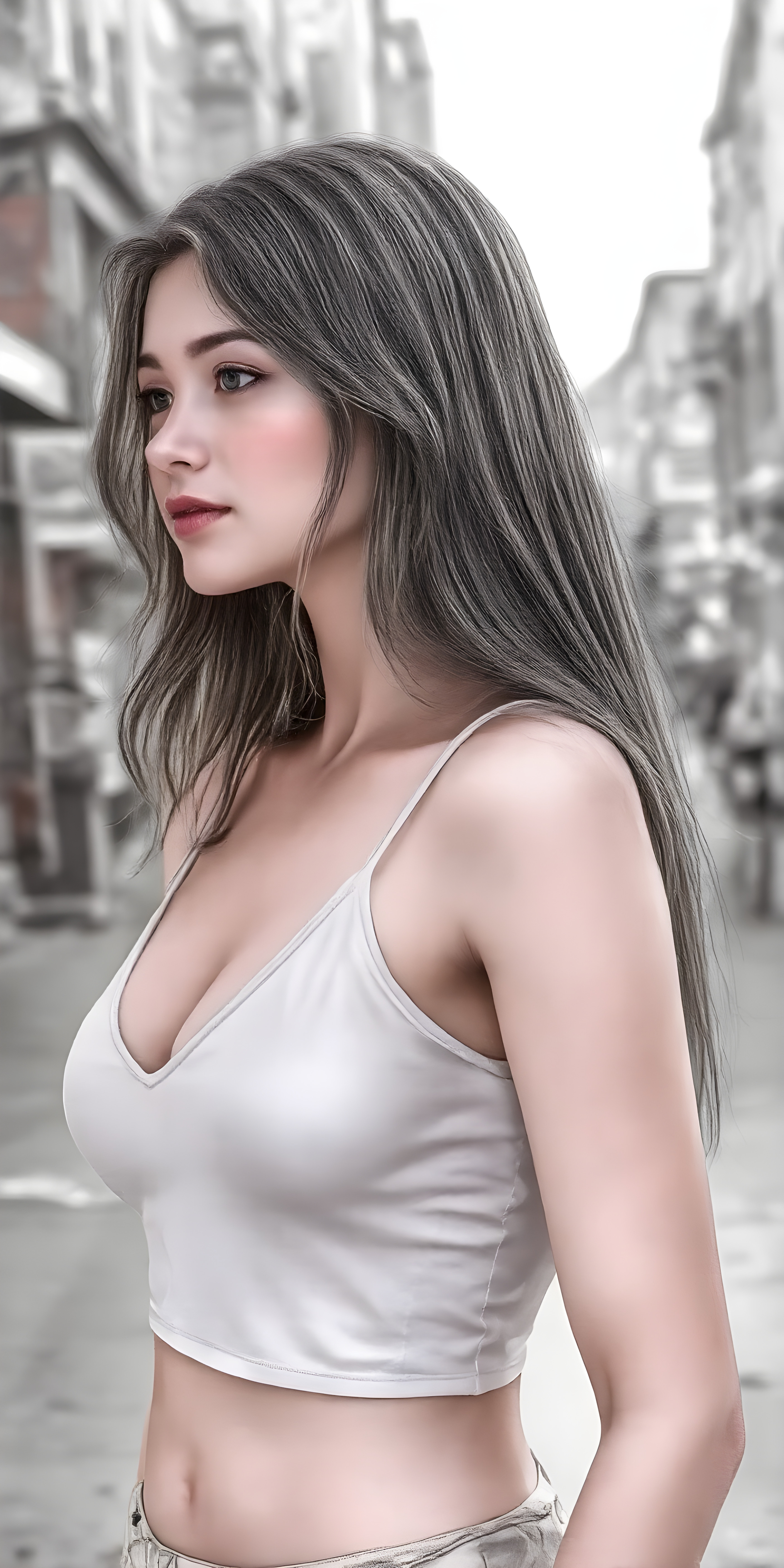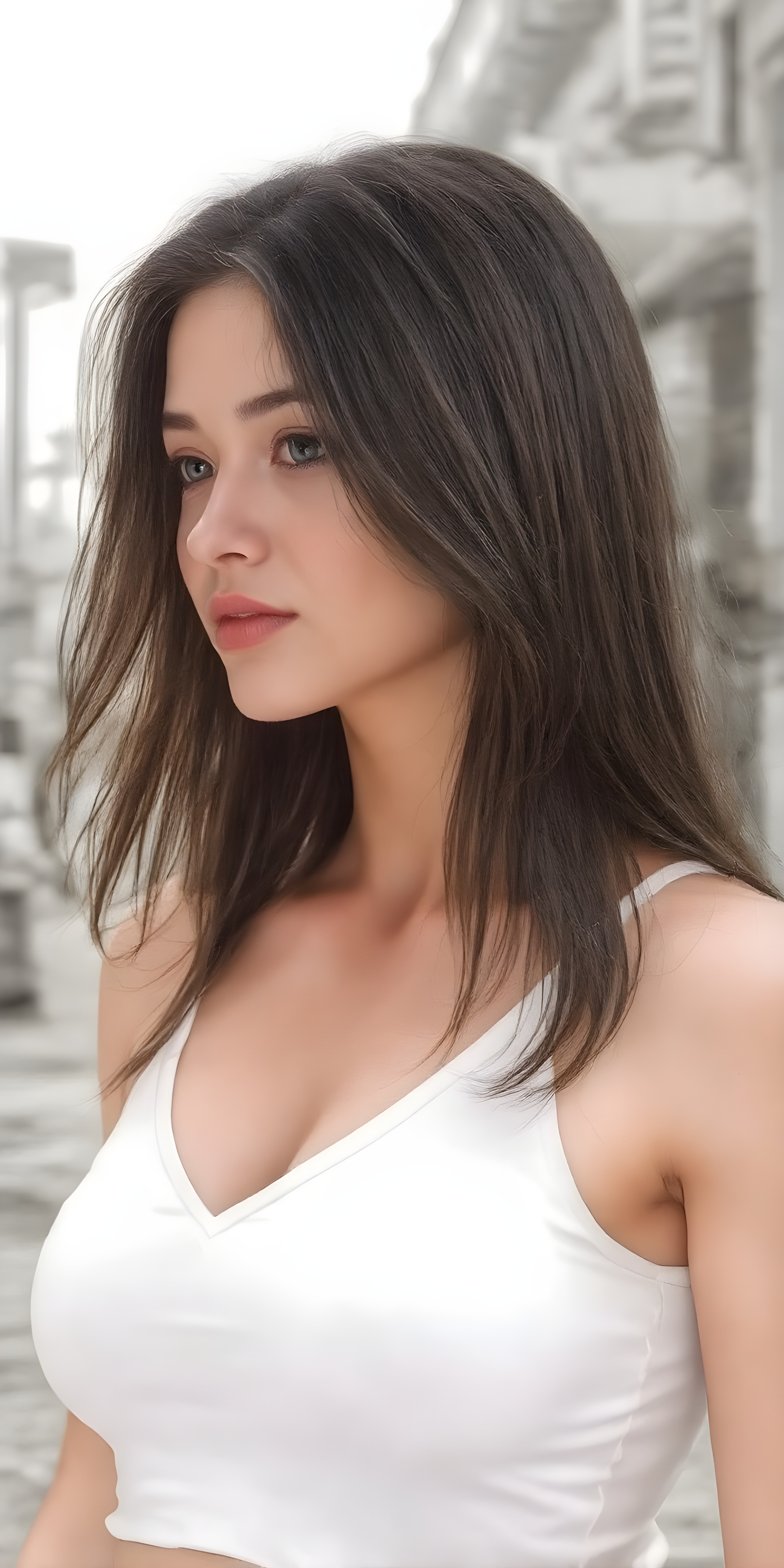 a (((beautiful young well busty girl, perfect curved body))), with flowing, (((soft long straight brown hair))). She is dressed in a sleek, (white cropped short tank top, deep v-neck), photograph, stands in the street, side view