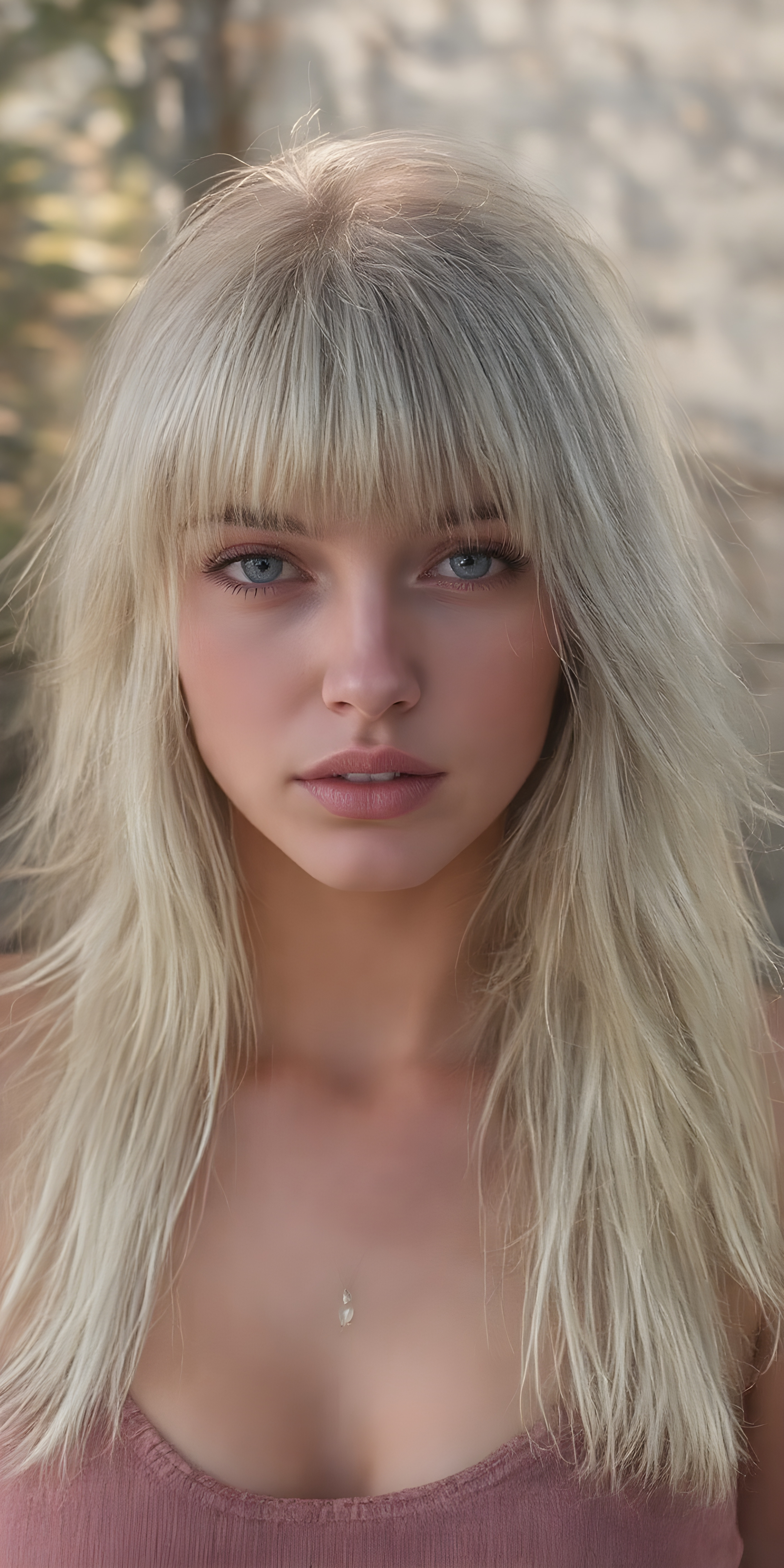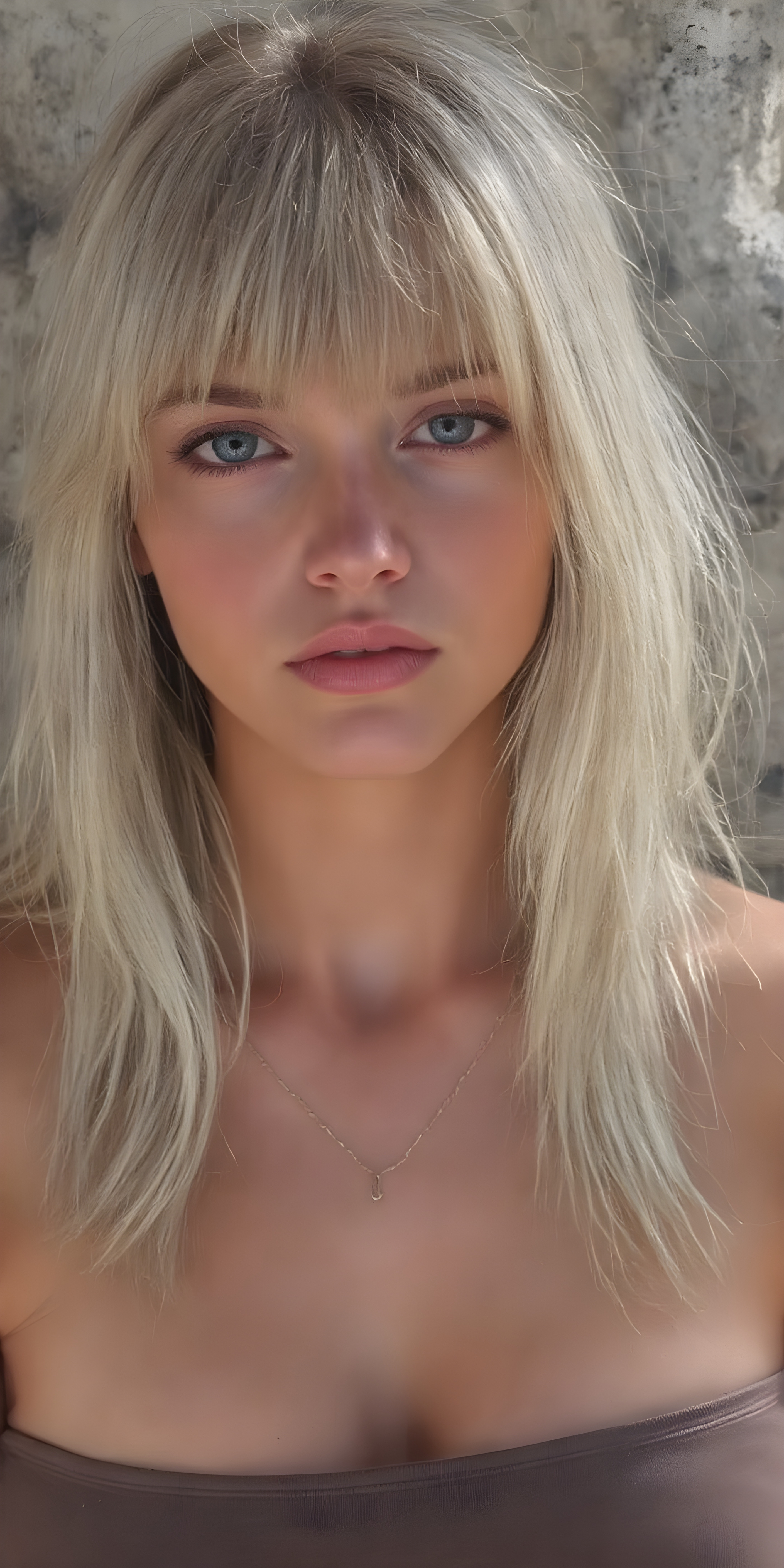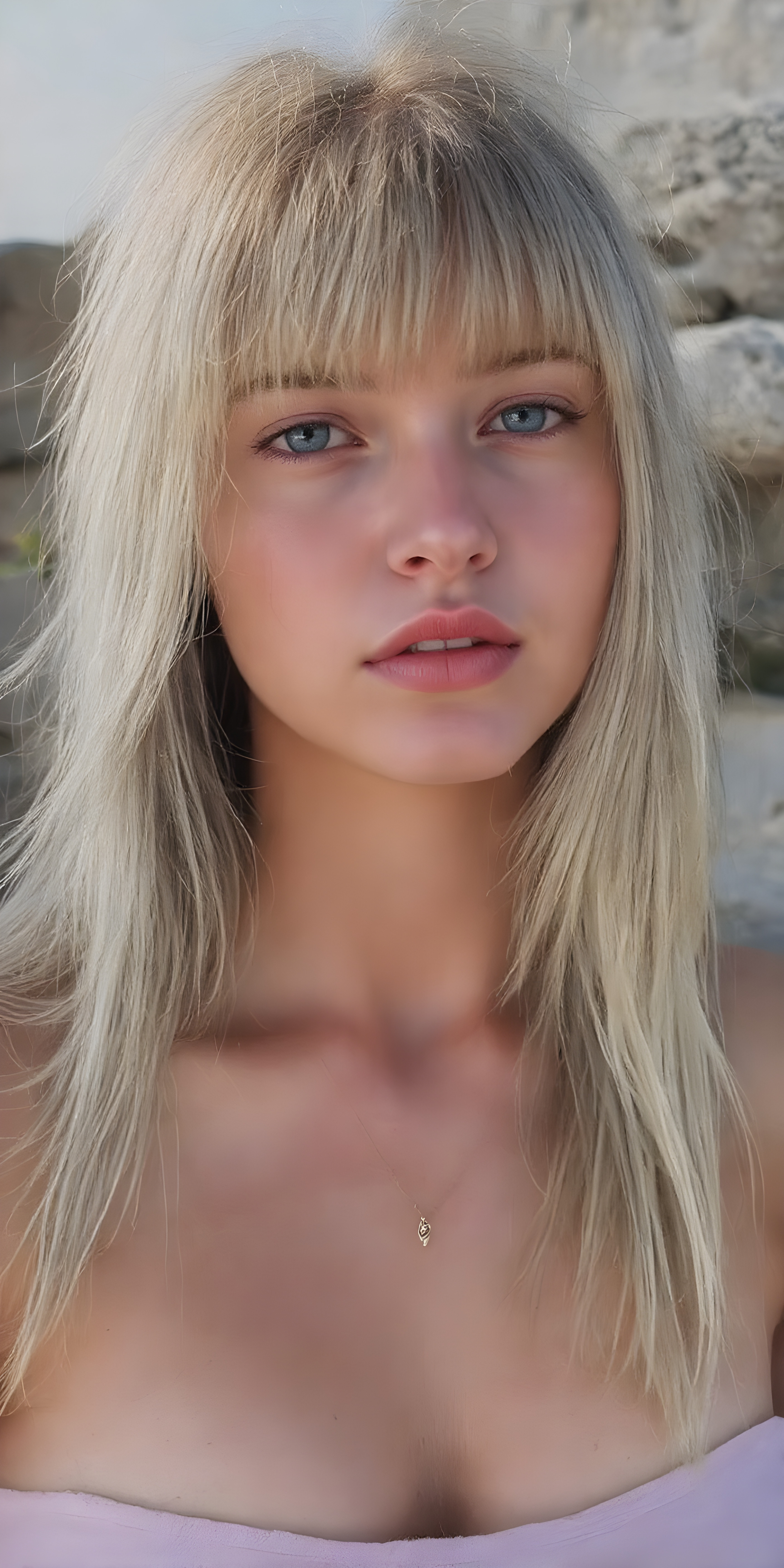 a (((very beautiful young well busty girl))), with (((platinum blond soft long hair, bangs, frame her face))), she wears a (((super short, tight tank top))), round face, full lips, perfect curved body, the sun-kissed scene sets the stage for her breathtaking beauty