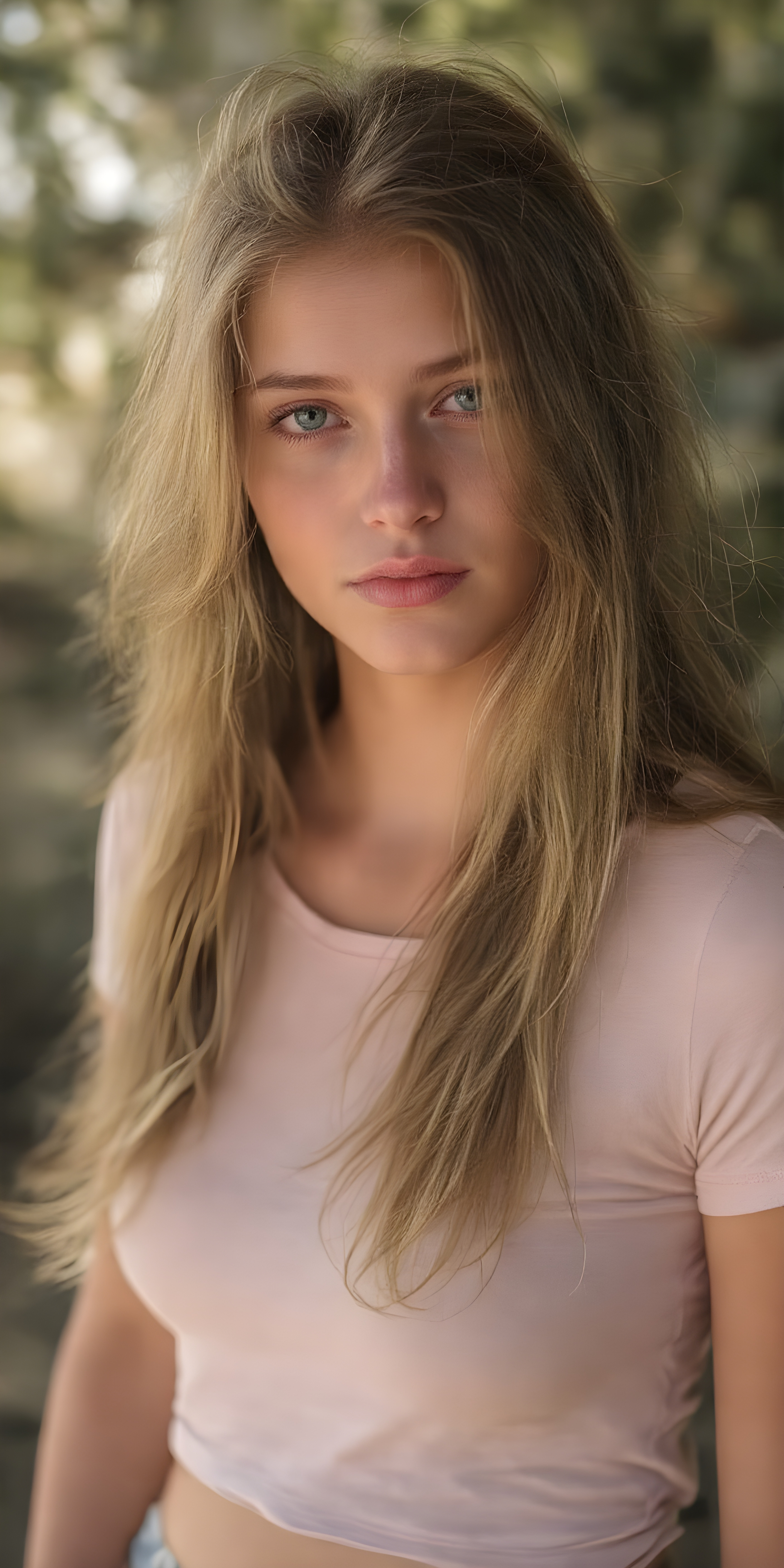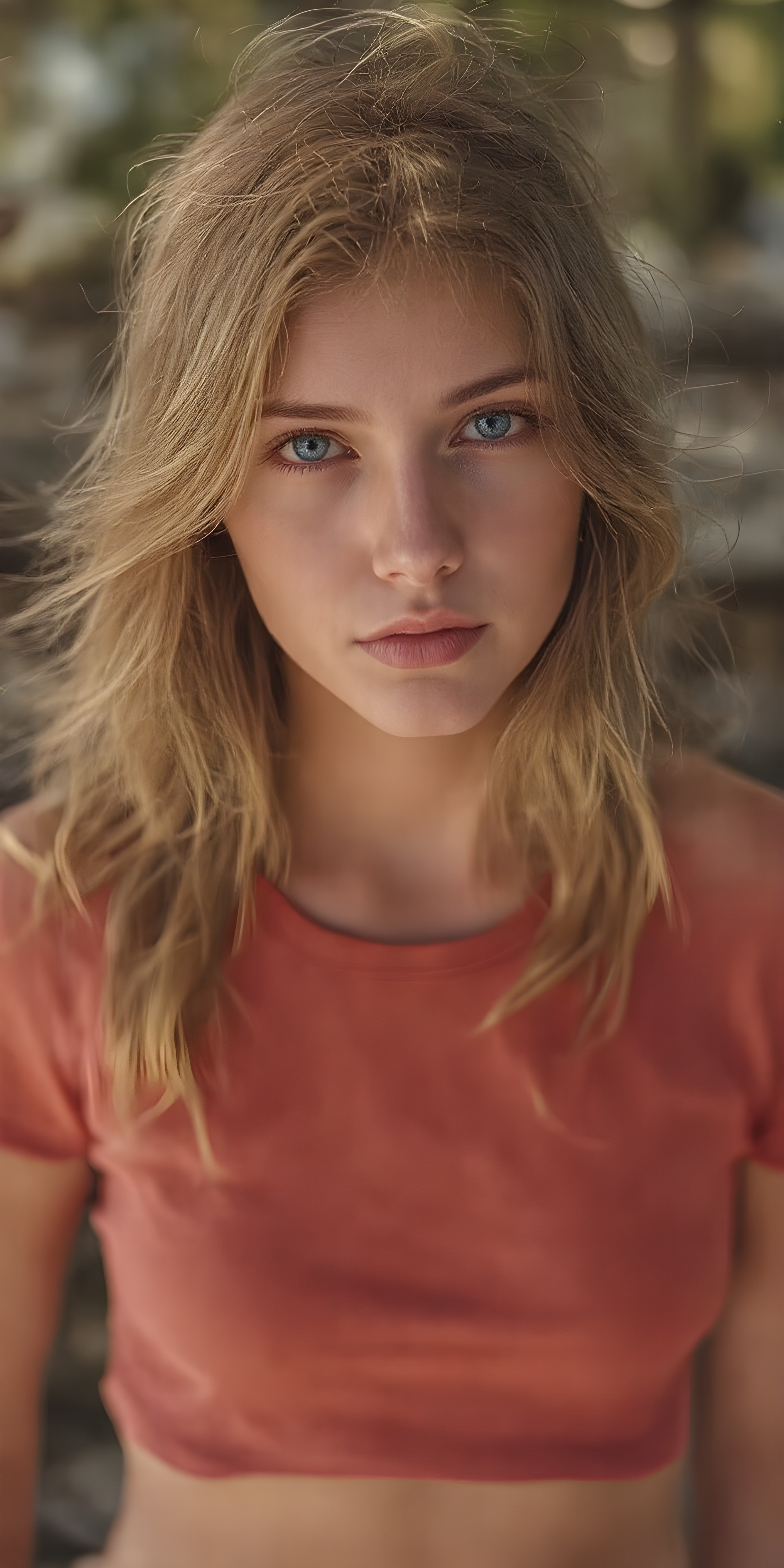 a (((very beautiful 18 year old girl))), with (((ginger soft long hair))), she wears a (((super short, tight t-shirt))), the sun-kissed scene sets the stage for her breathtaking beauty, creating a truly unforgettable visual spectacle