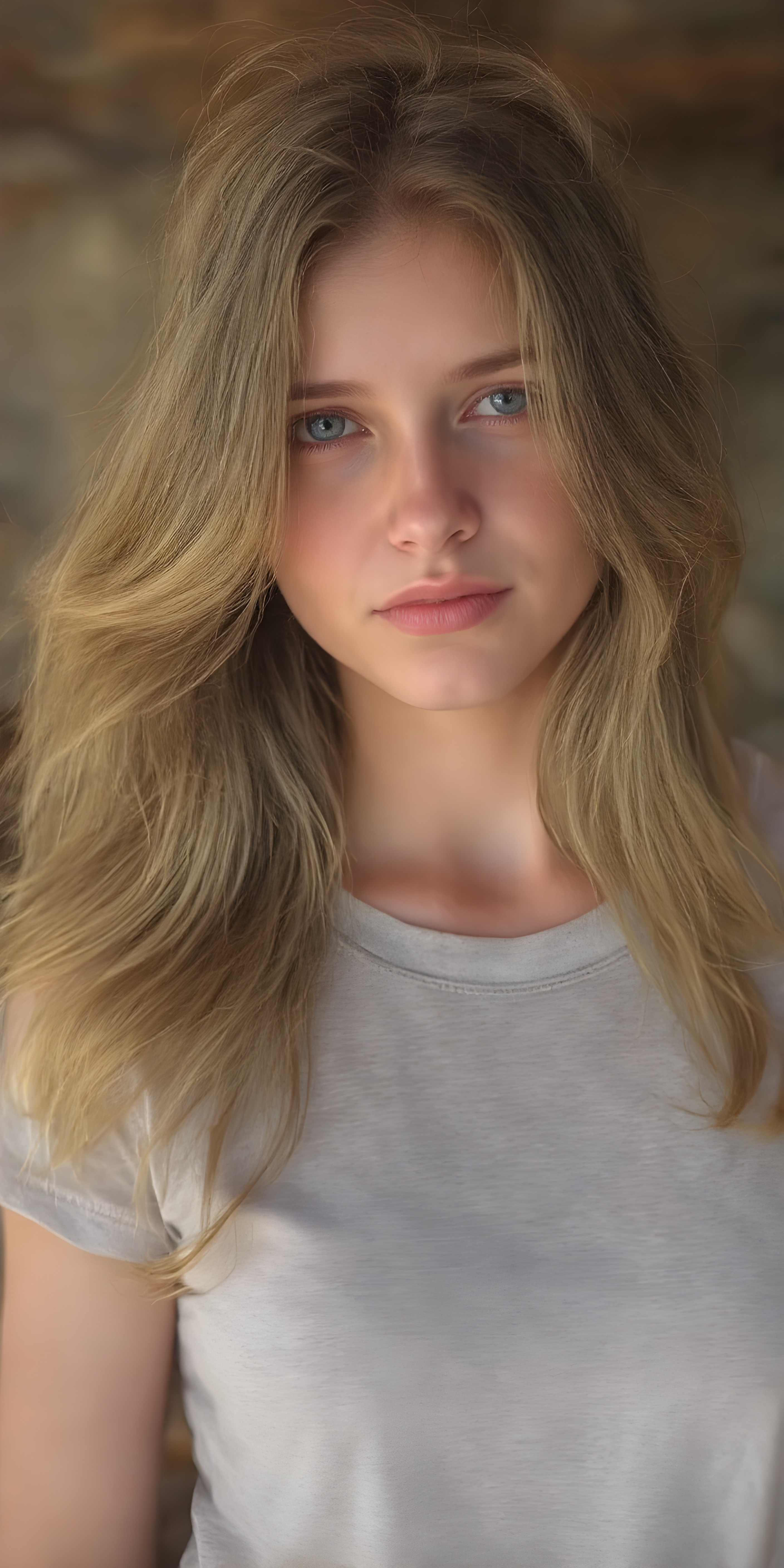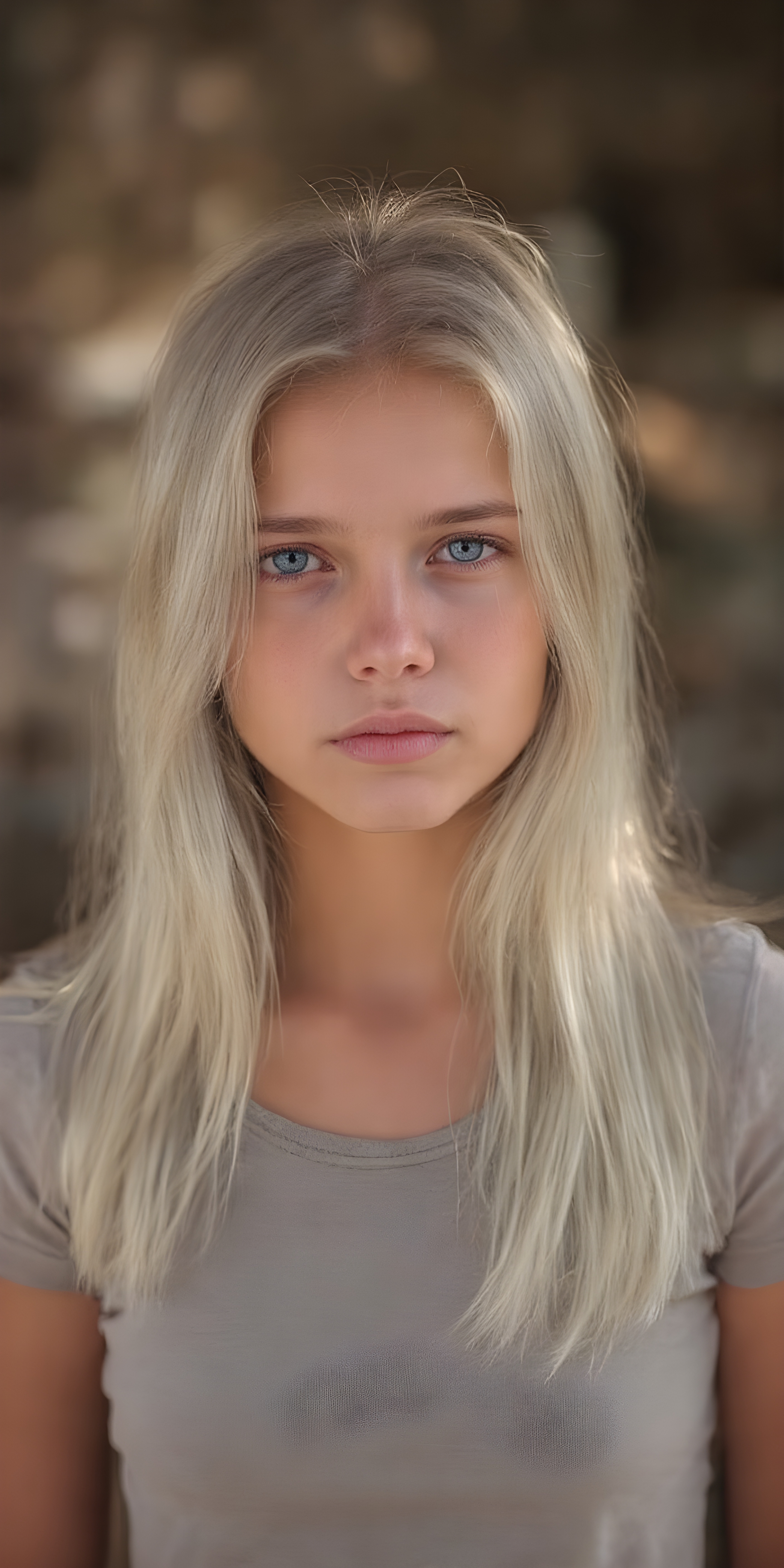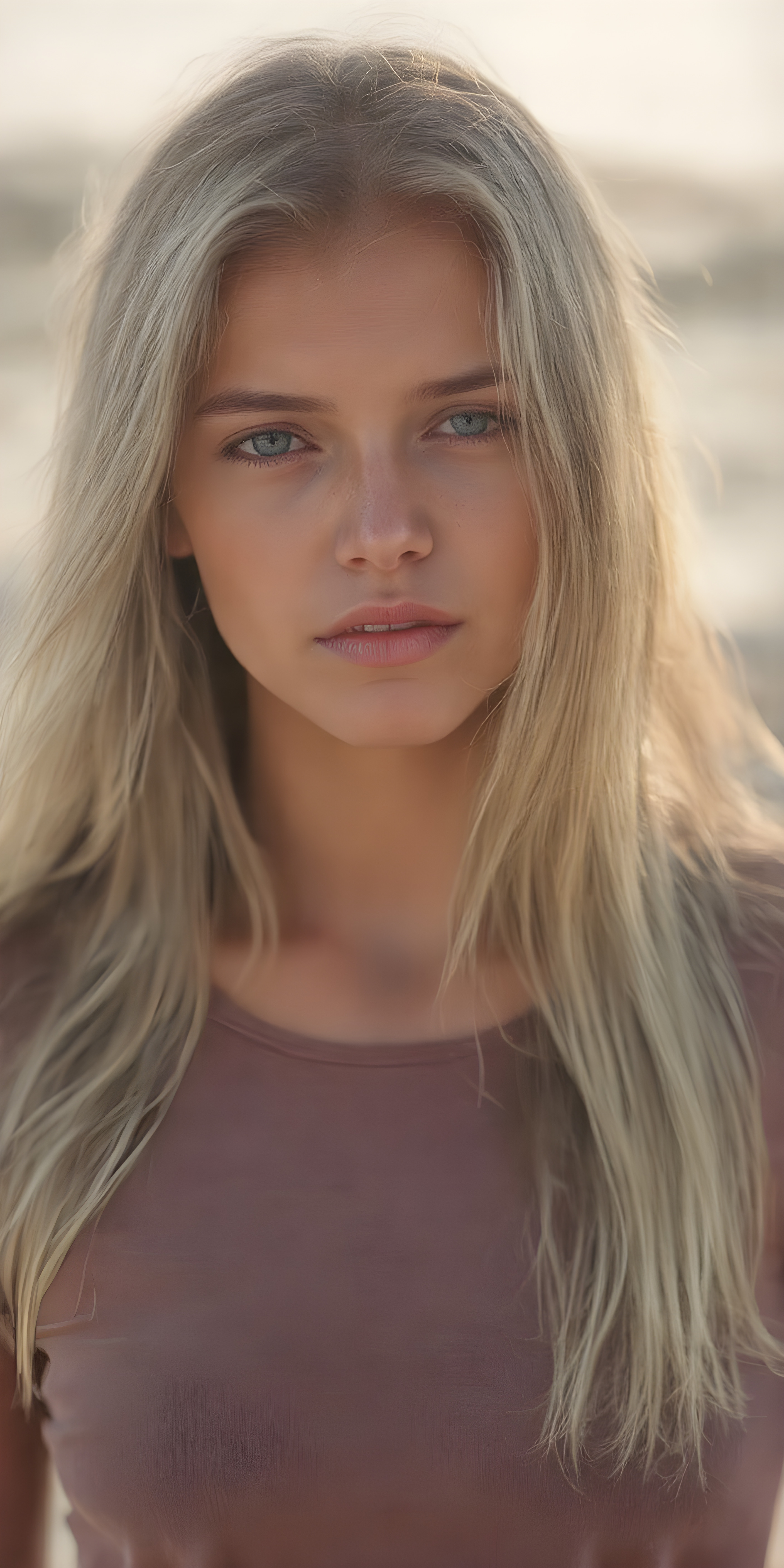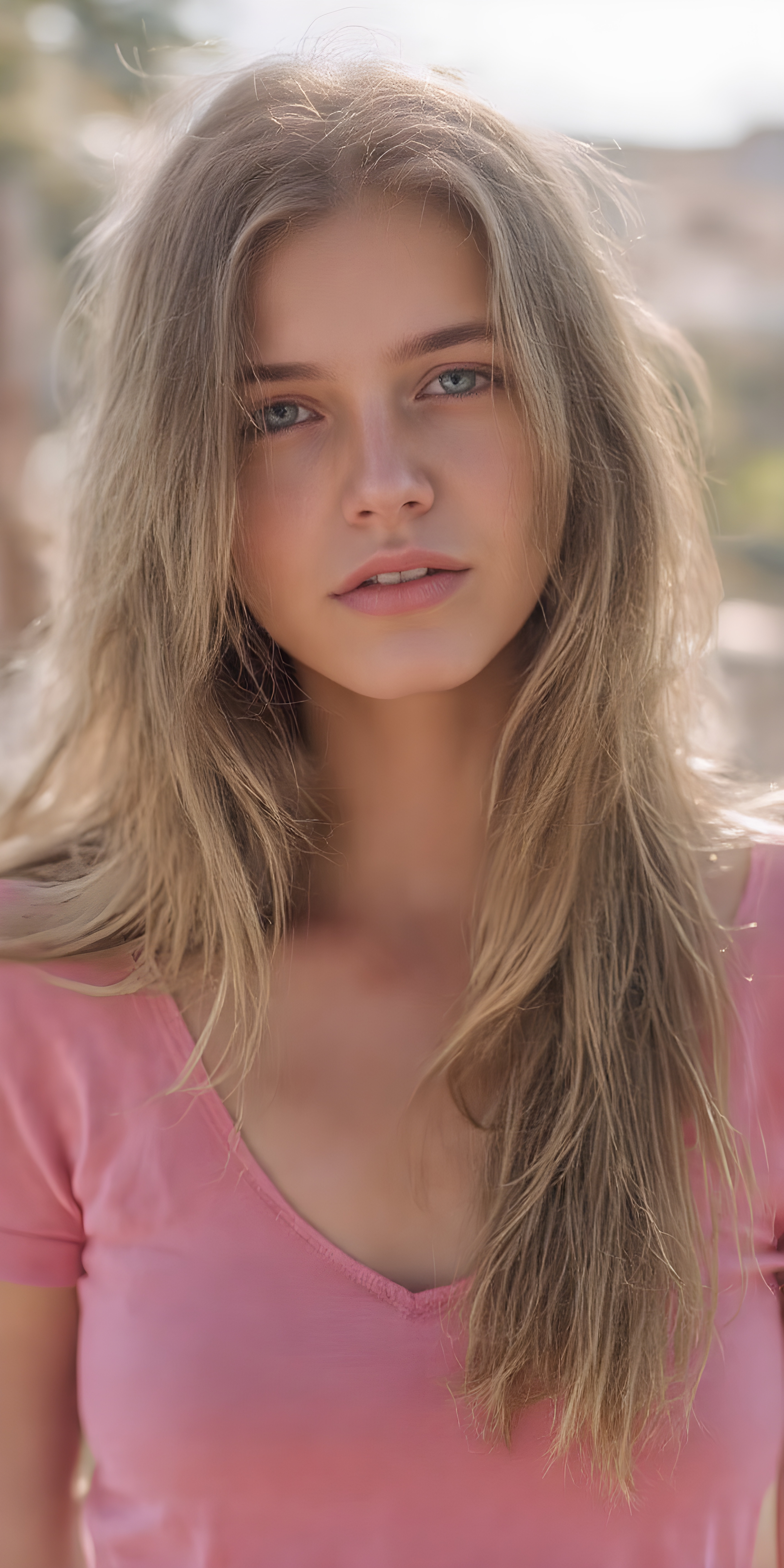a (((very beautiful young girl))), with (((platinum blond soft long hair))), she wears a (((super short, tight t-shirt))), round face, full lips, perfect curved body, the sun-kissed scene sets the stage for her breathtaking beauty, creating a truly unforgettable visual spectacle