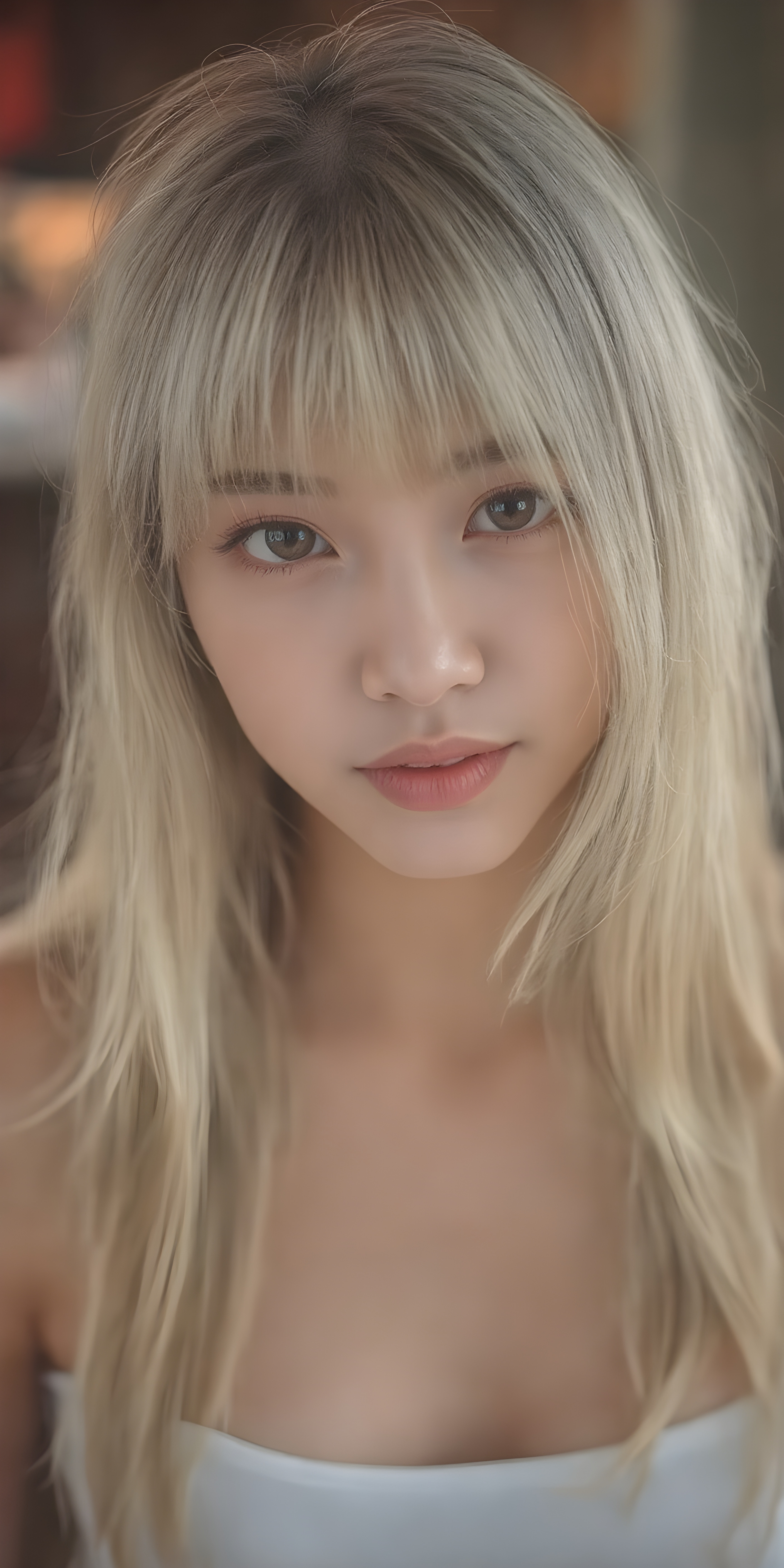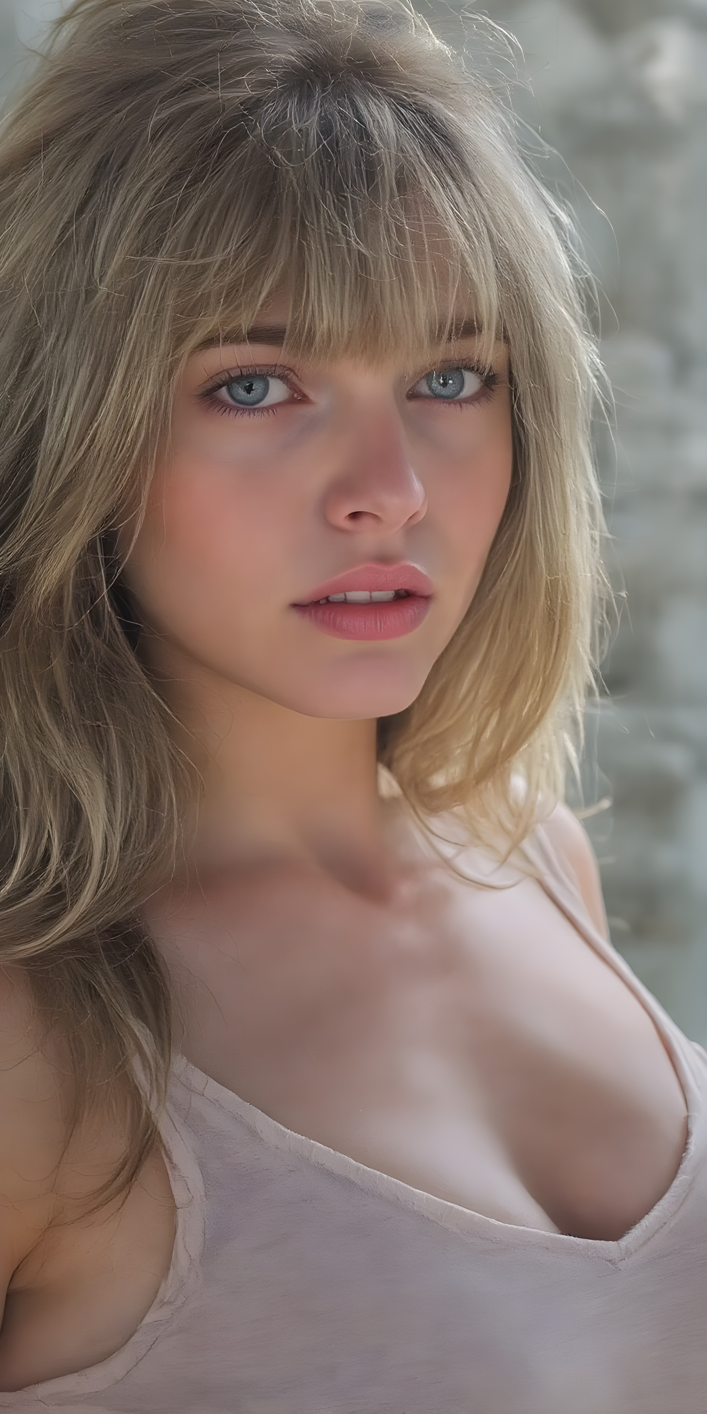 super realistic, 4k, detailed face, perfect curved body, cute ATTRIBUT teen girl, long blonde straight soft hair, styled bangs, wear only a white short tight crop tank top, looks at the camera, perfect body, portrait shot