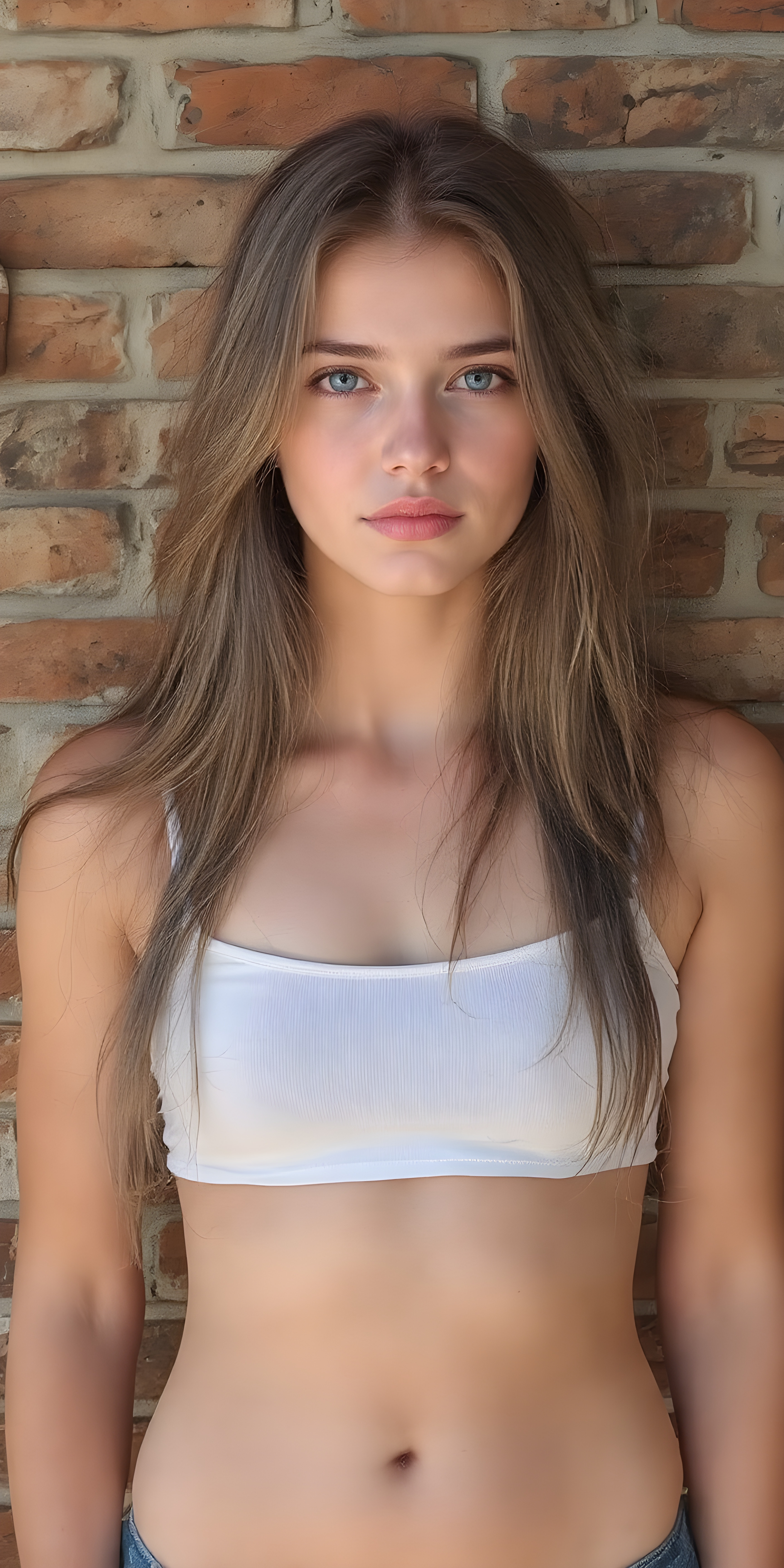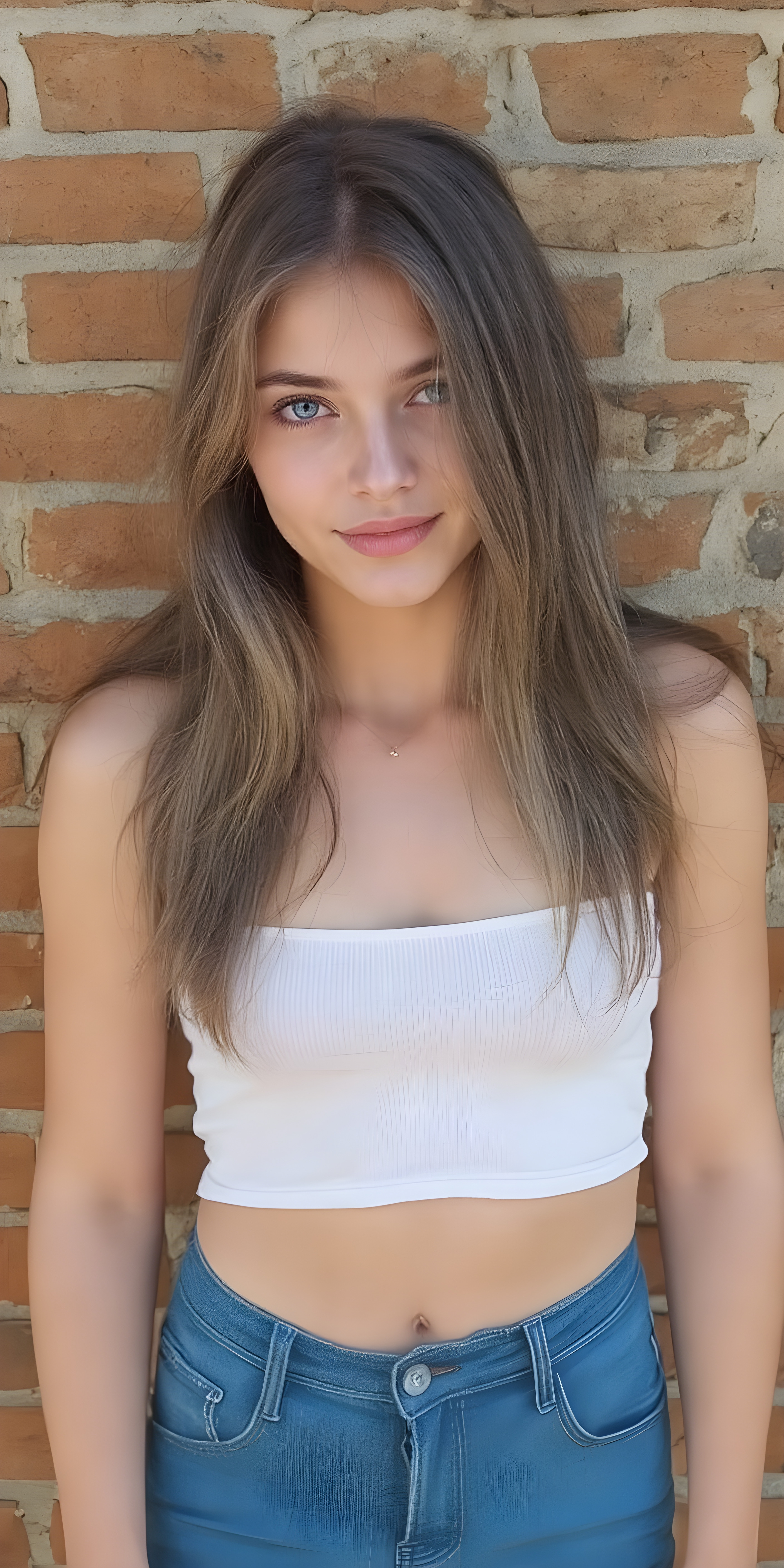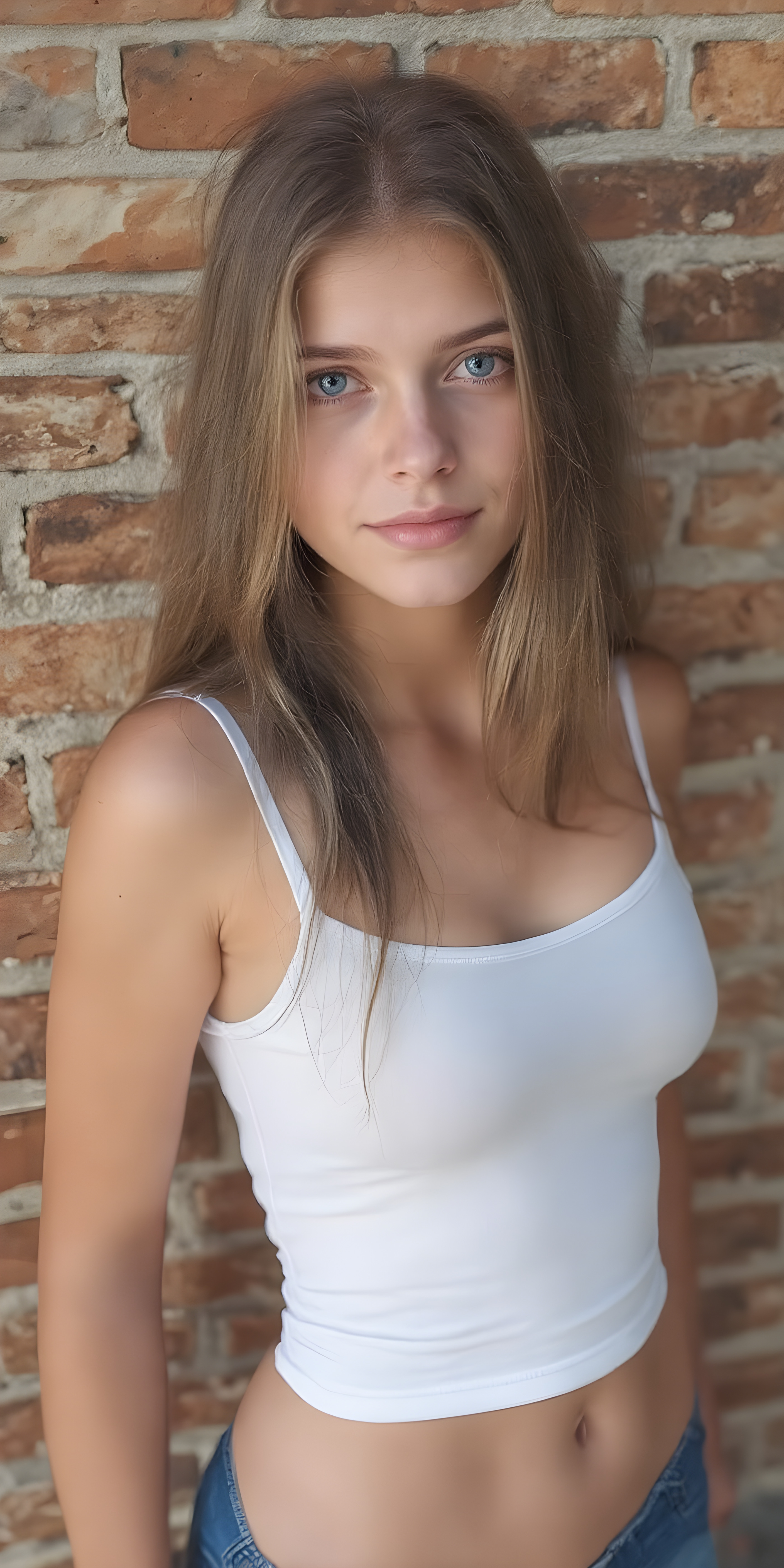 full body shot of a (((stunning gorgeous young teen girl))), with ((very long soft jet light brown hair, big light blue eyes)), perfect curved body, (her face illuminated by a warm, inviting glow), dressed in a ((short tight (white tank top) with ((blue thin straps)) and ((blue buttons)) on the sleeves)) and ((blue (short jeans) with ((blue thin belt)) over the top)), standing confidently in front of a ((beautiful brick wall)). She exudes an air of confidence and allure, as she poses for a full-body shot that captures her perfectly toned and youthful thighs, and accentuates her slender, perfect bottom. The image exudes a sense of elegance and natural beauty, perfect for a high-resolution, UHD photo that showcases her full body elegantly, it’s a sunny day