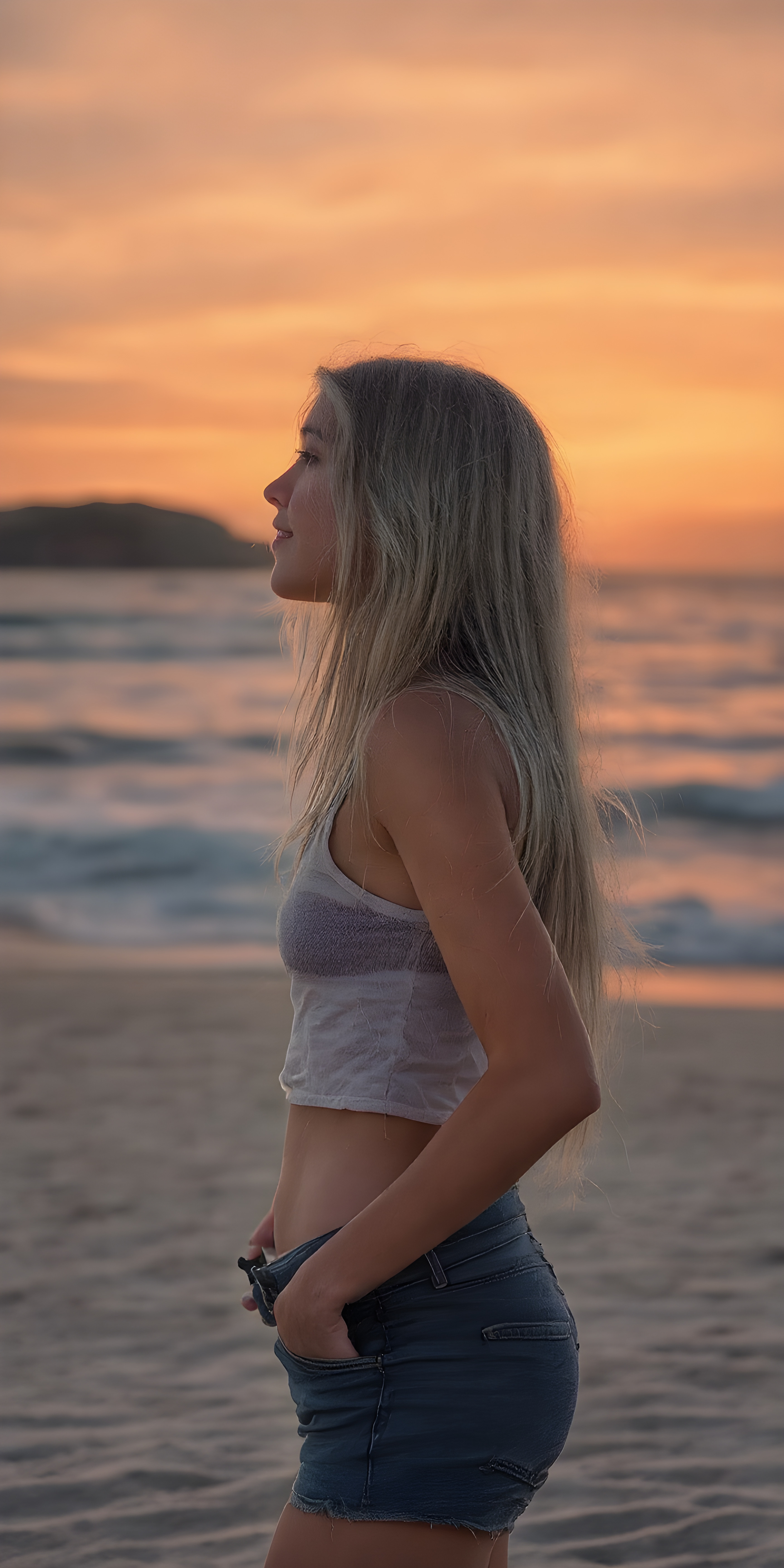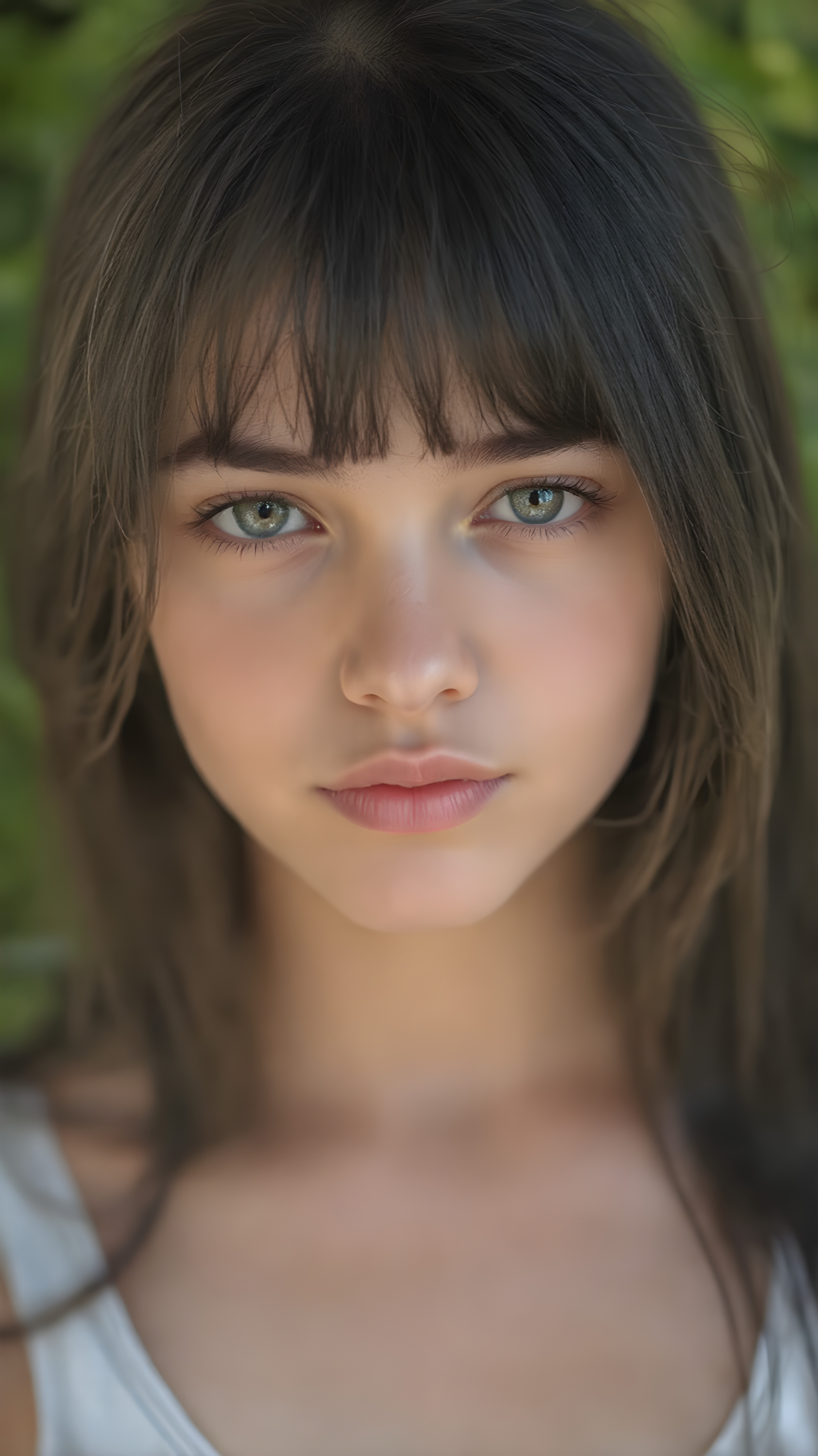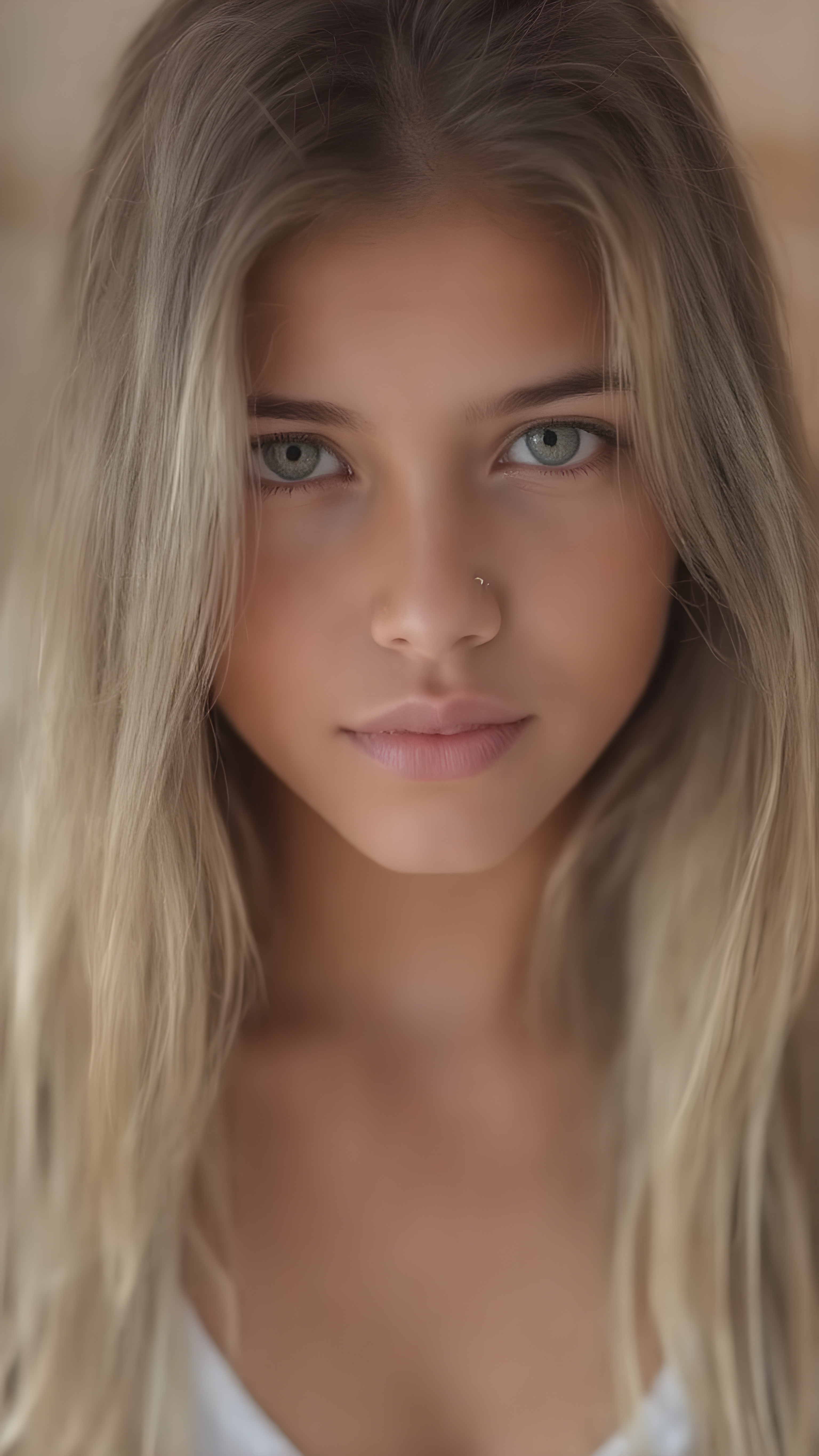 full body shot of a (((stunning gorgeous young teen girl))), with ((very long soft jet light brown hair, big light blue eyes)), perfect curved body, (her face illuminated by a warm, inviting glow), dressed in a ((short tight (white tank top) with ((blue thin straps)) and ((blue buttons)) on the sleeves)) and ((blue (short jeans) with ((blue thin belt)) over the top)), standing confidently in front of a ((beautiful brick wall)). She exudes an air of confidence and allure, as she poses for a full-body shot that captures her perfectly toned and youthful thighs, and accentuates her slender, perfect bottom. The image exudes a sense of elegance and natural beauty, perfect for a high-resolution, UHD photo that showcases her full body elegantly, it’s a sunny day