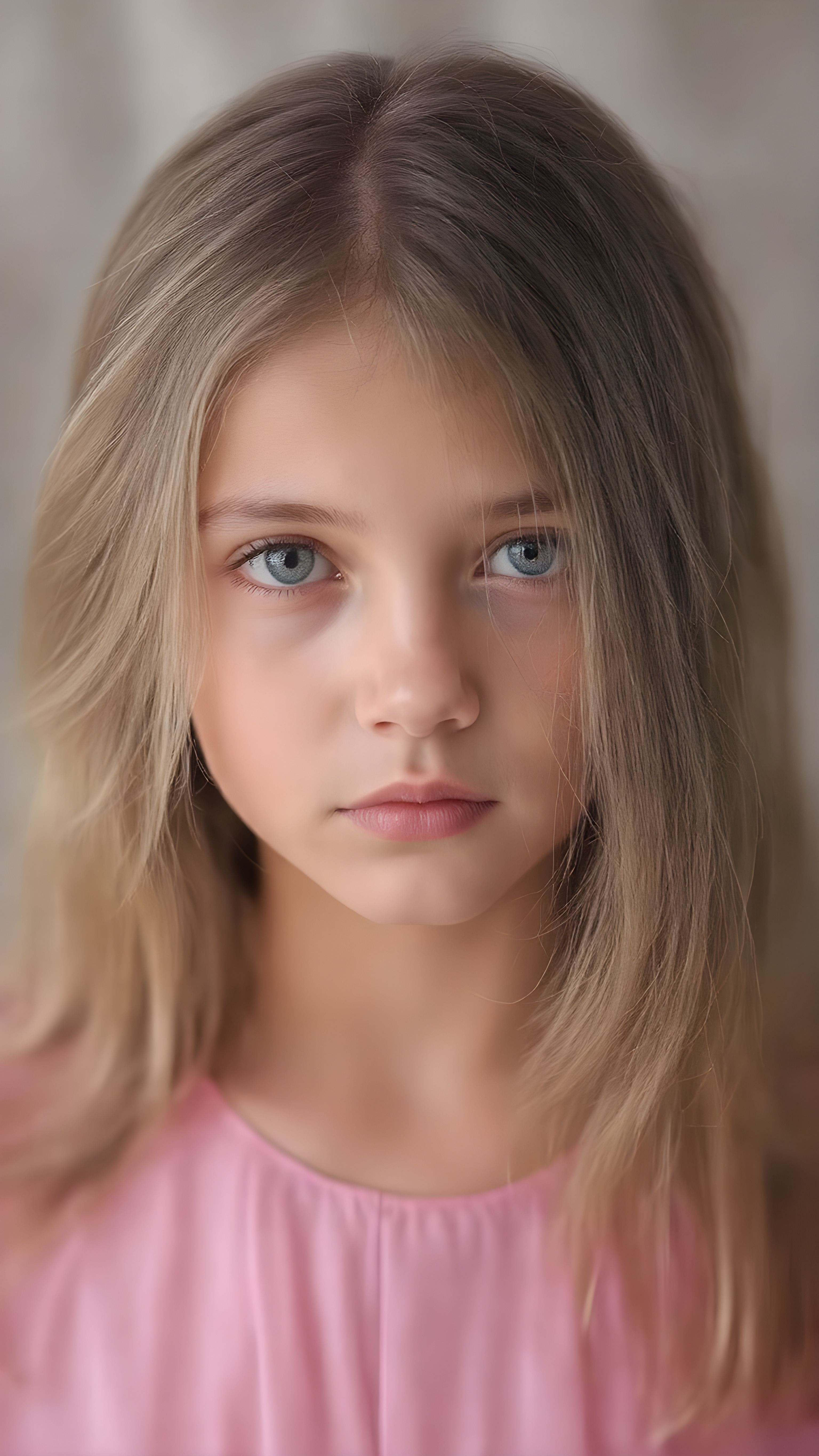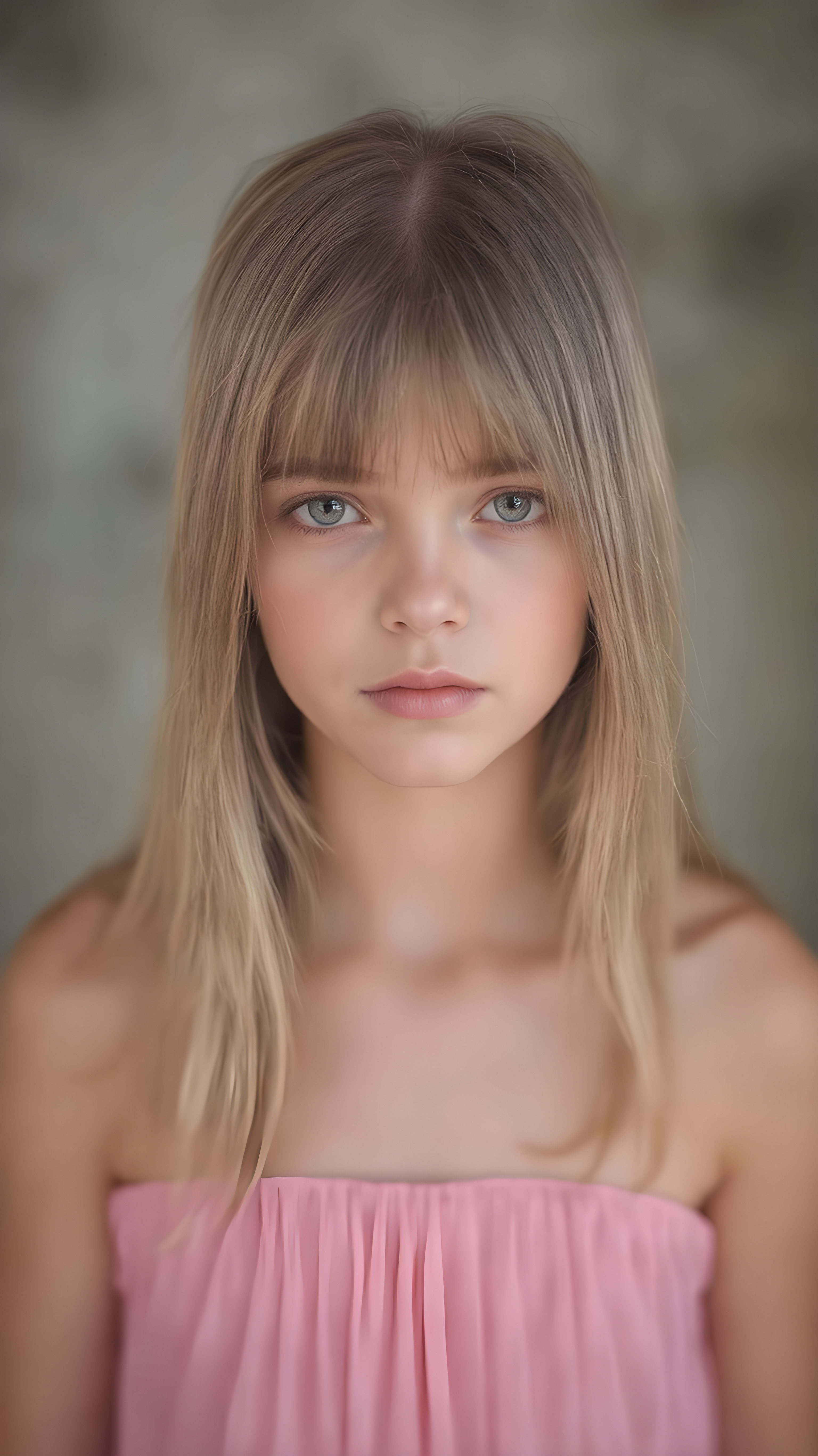 a breathtakingly beautiful (((full body portrait))), showcasing a young girl with luxuriously long, flowing straight jet soft ash pink color shiny hairs framing her face as she gazes into the camera, their ethereal tips creating a whimsical pop of color contrast to her overall look. She’s dressed in a (((violet pink chiffon haute couture floor length gown))), which add a hint of warmth and glamour to her ensemble