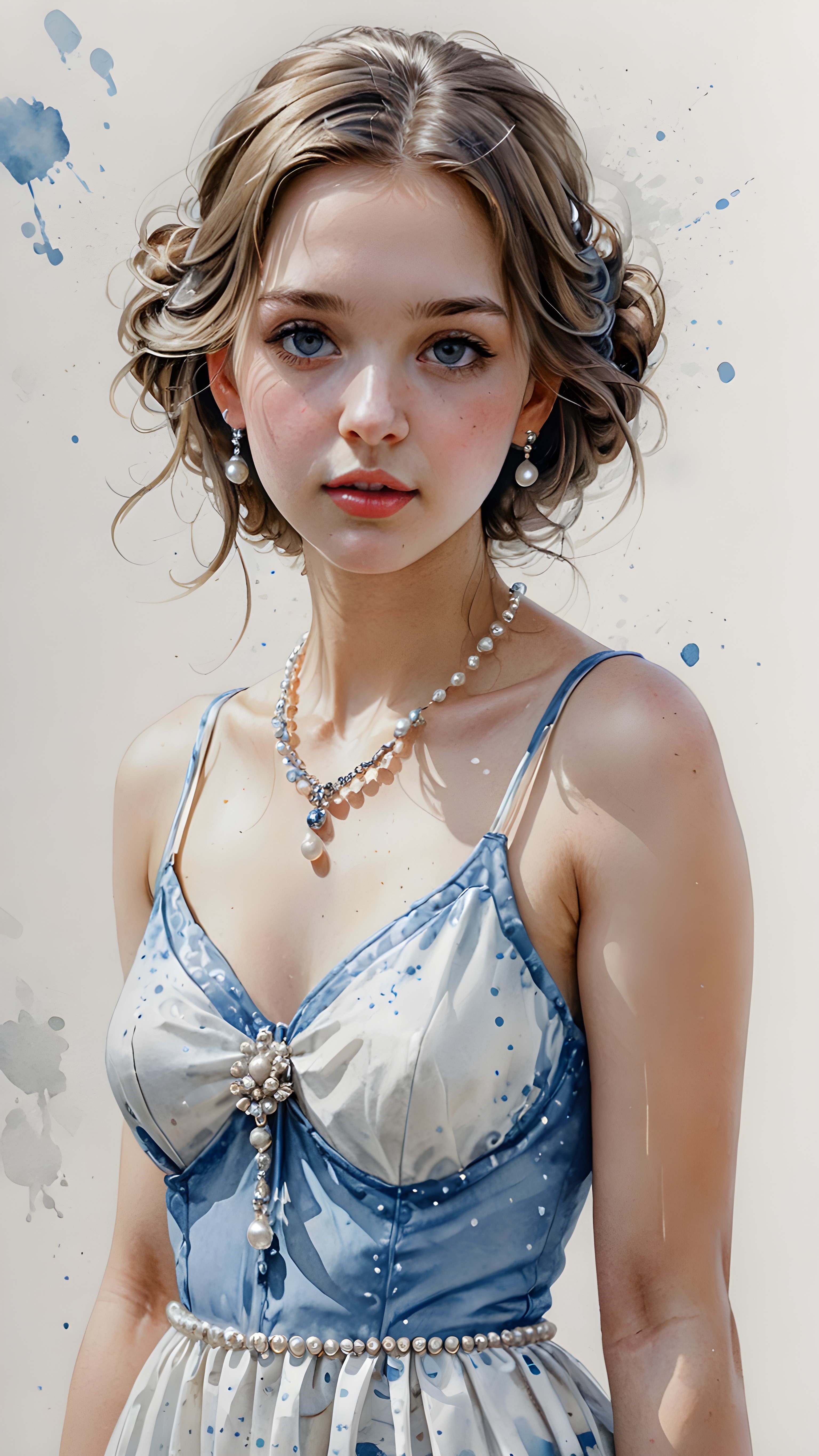 a beautiful girl in silver white and blue shade dress with pearl necklace, ((white background))