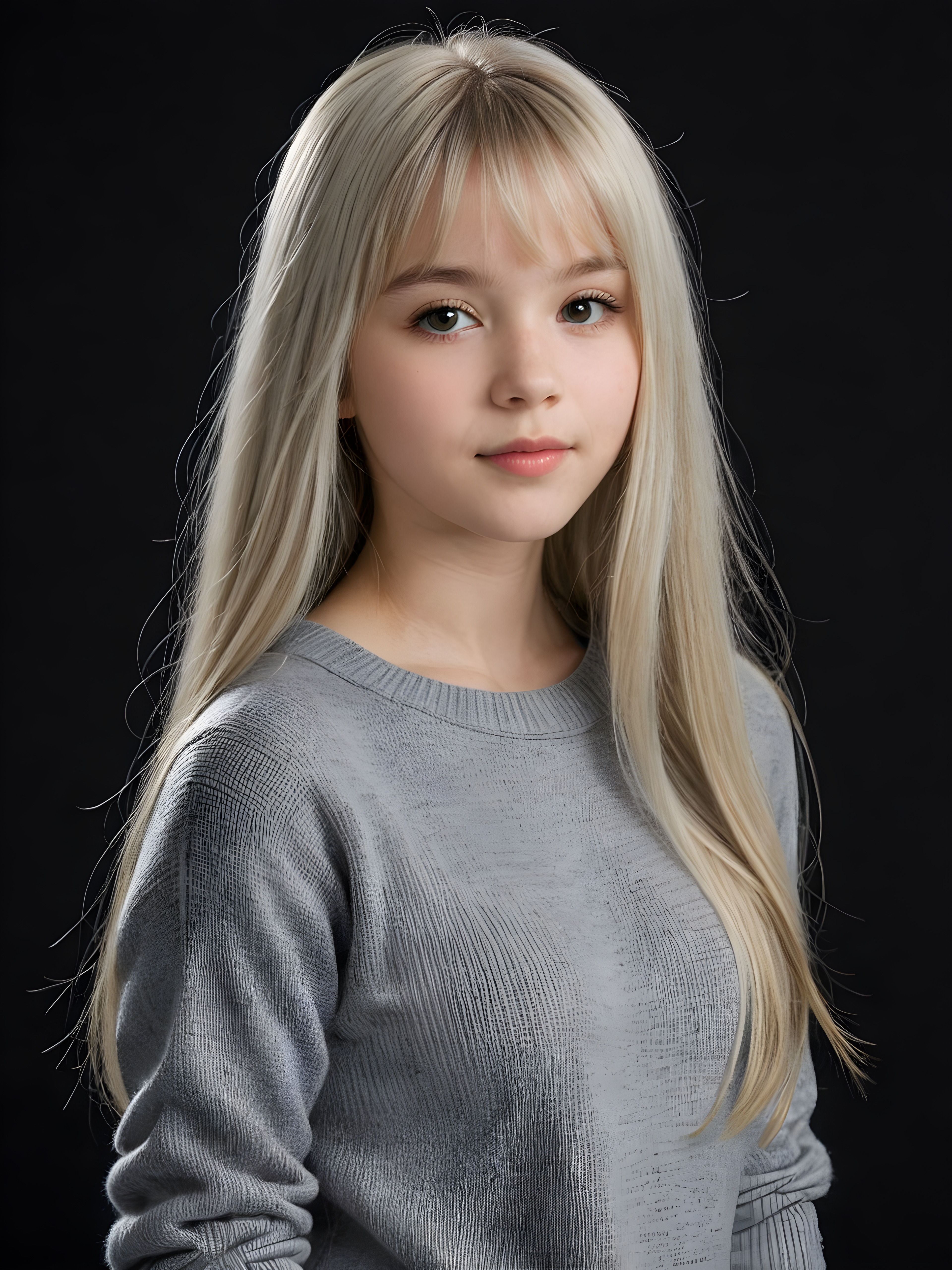 a detailed an realistic photo from a young teen girl, 13 years old, (((jet platinum-white thick straight long hair)) and bangs), ((wears a fine grey wool sweater)), ((stunning)), ((gorgeous)), ((black background)) ((side view))