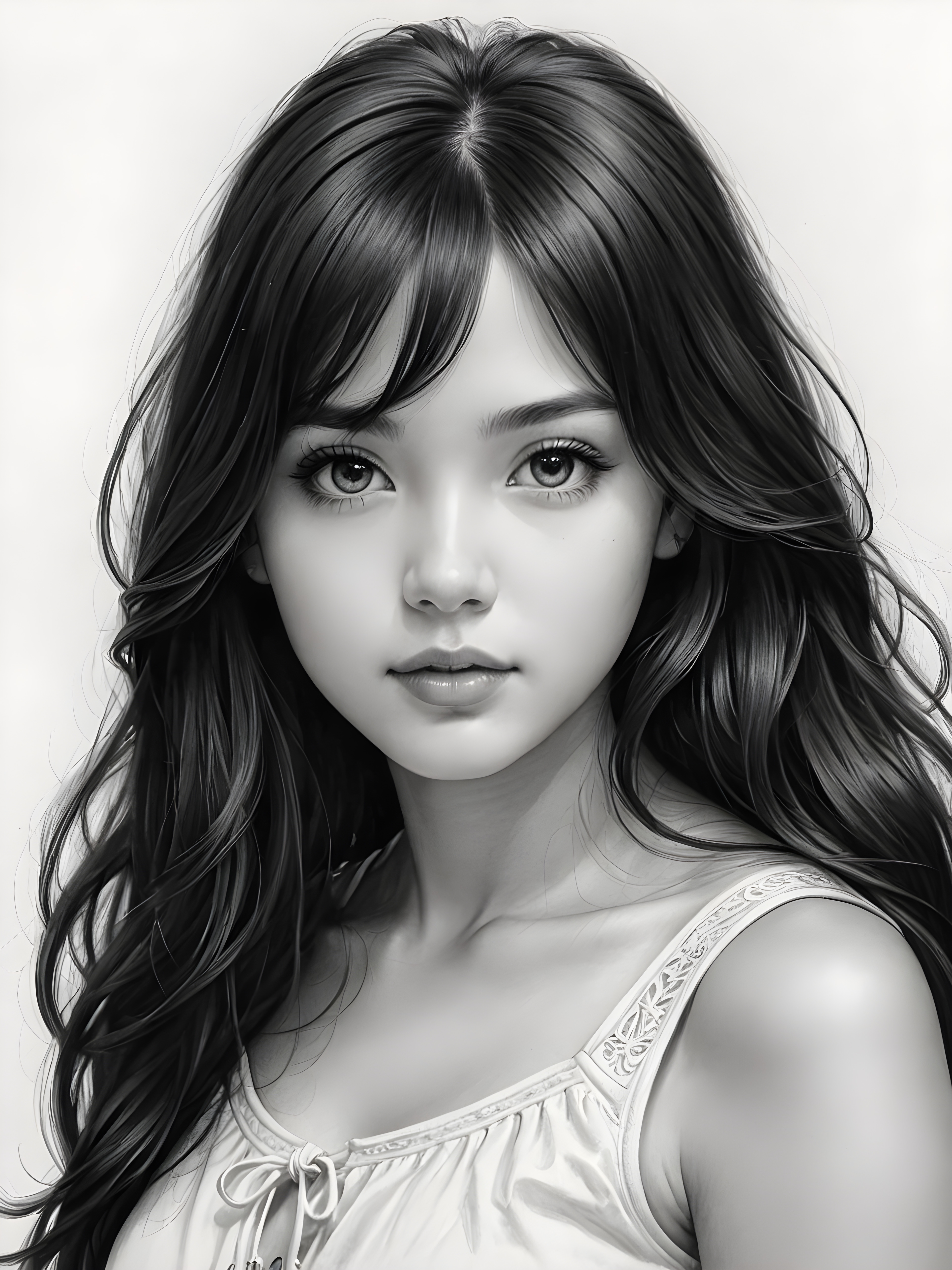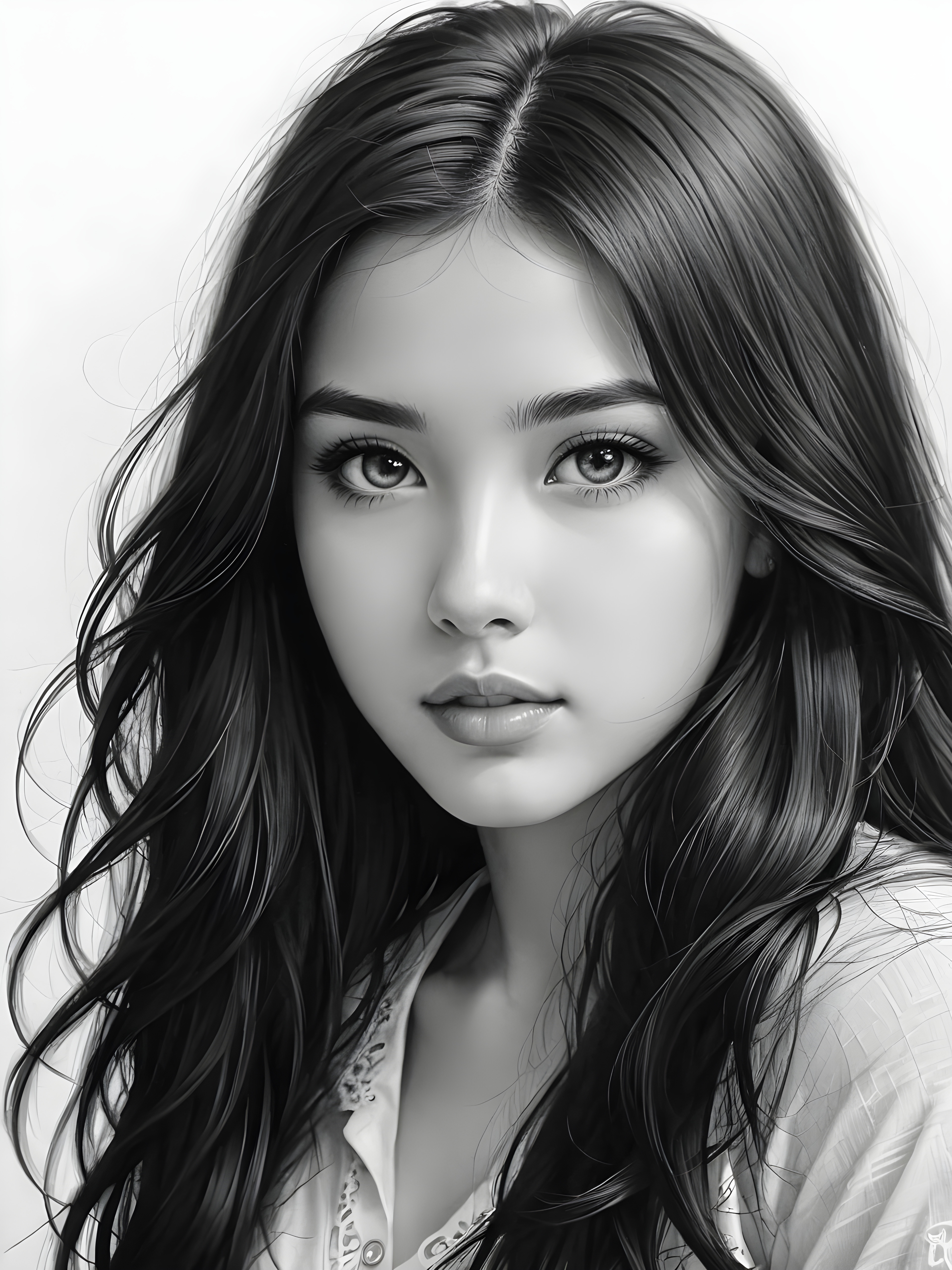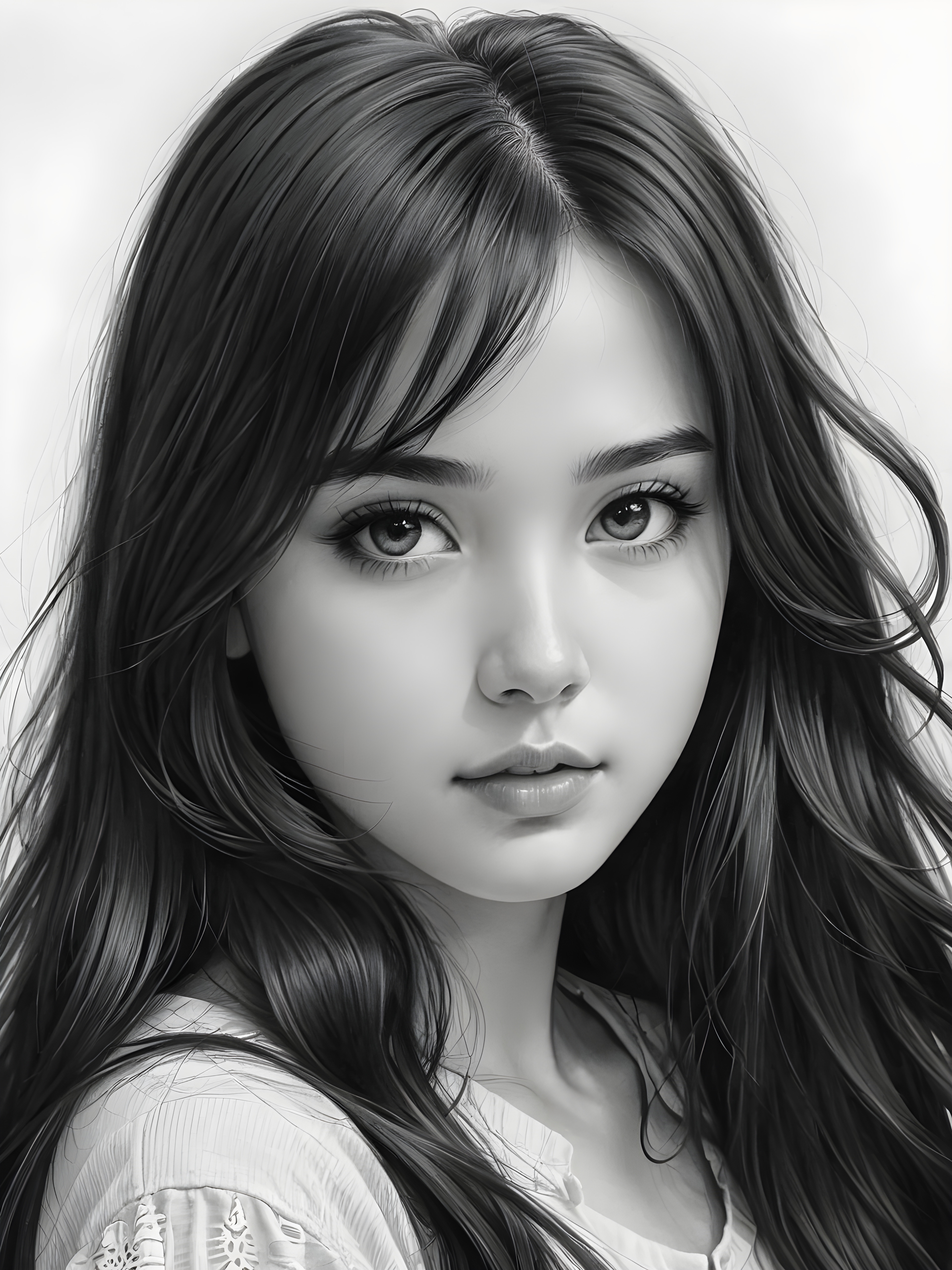 a pencil drawing ((black and white)), (((vividly drawn portrait))), capturing a young girl with long, flowing (((black hair))), her eyes sparkling and her skin radiant, embodying flawless beauty