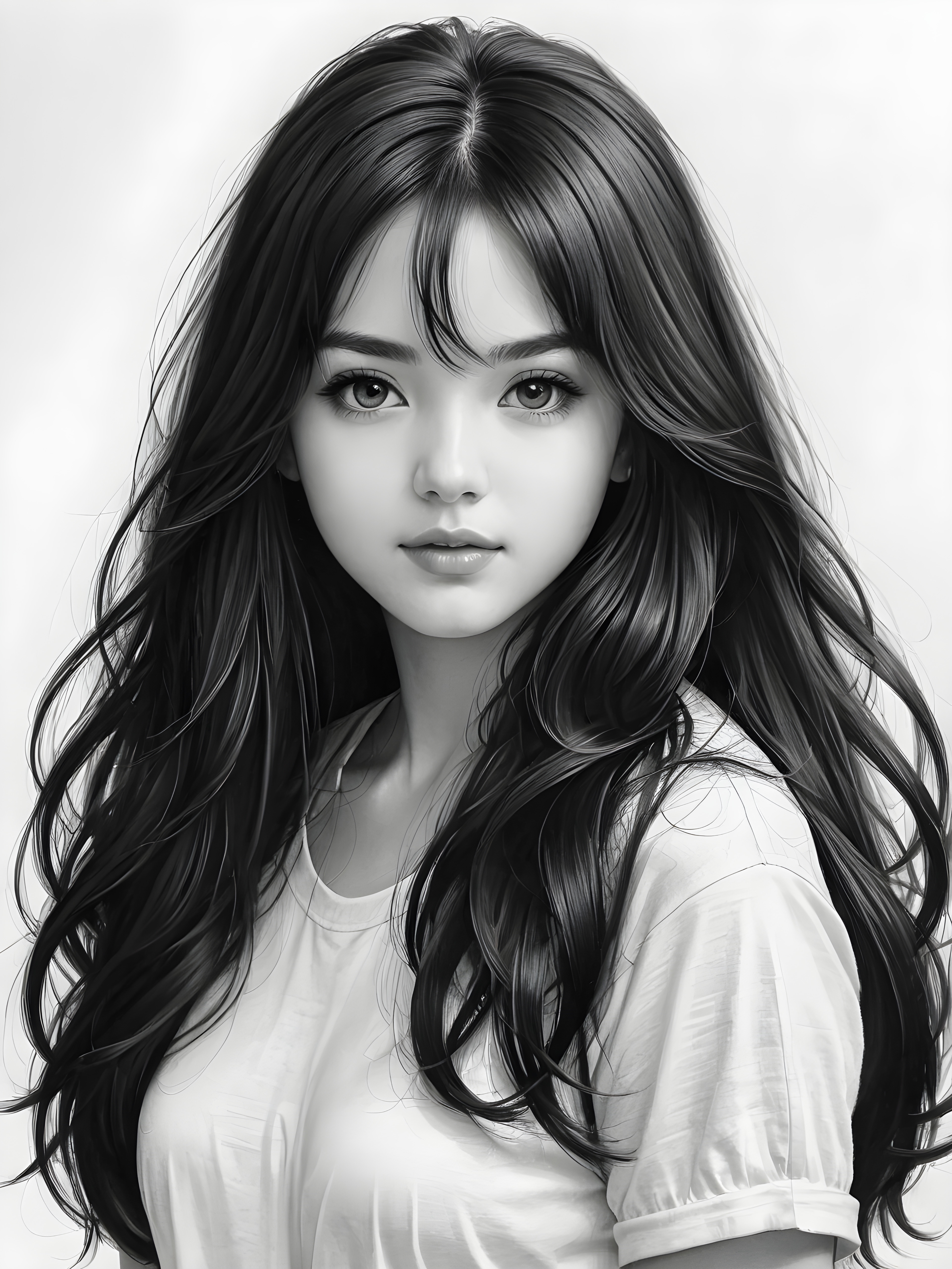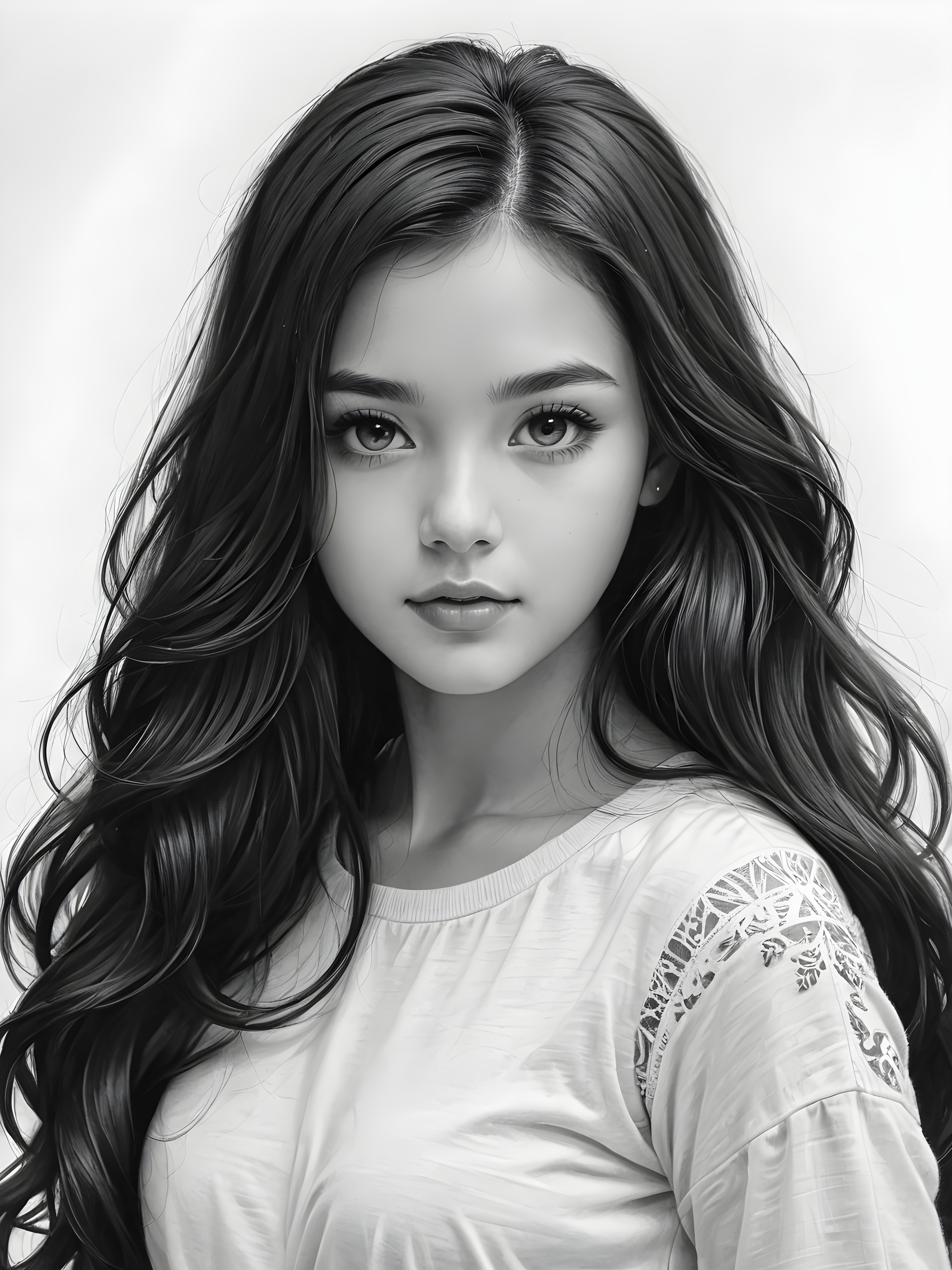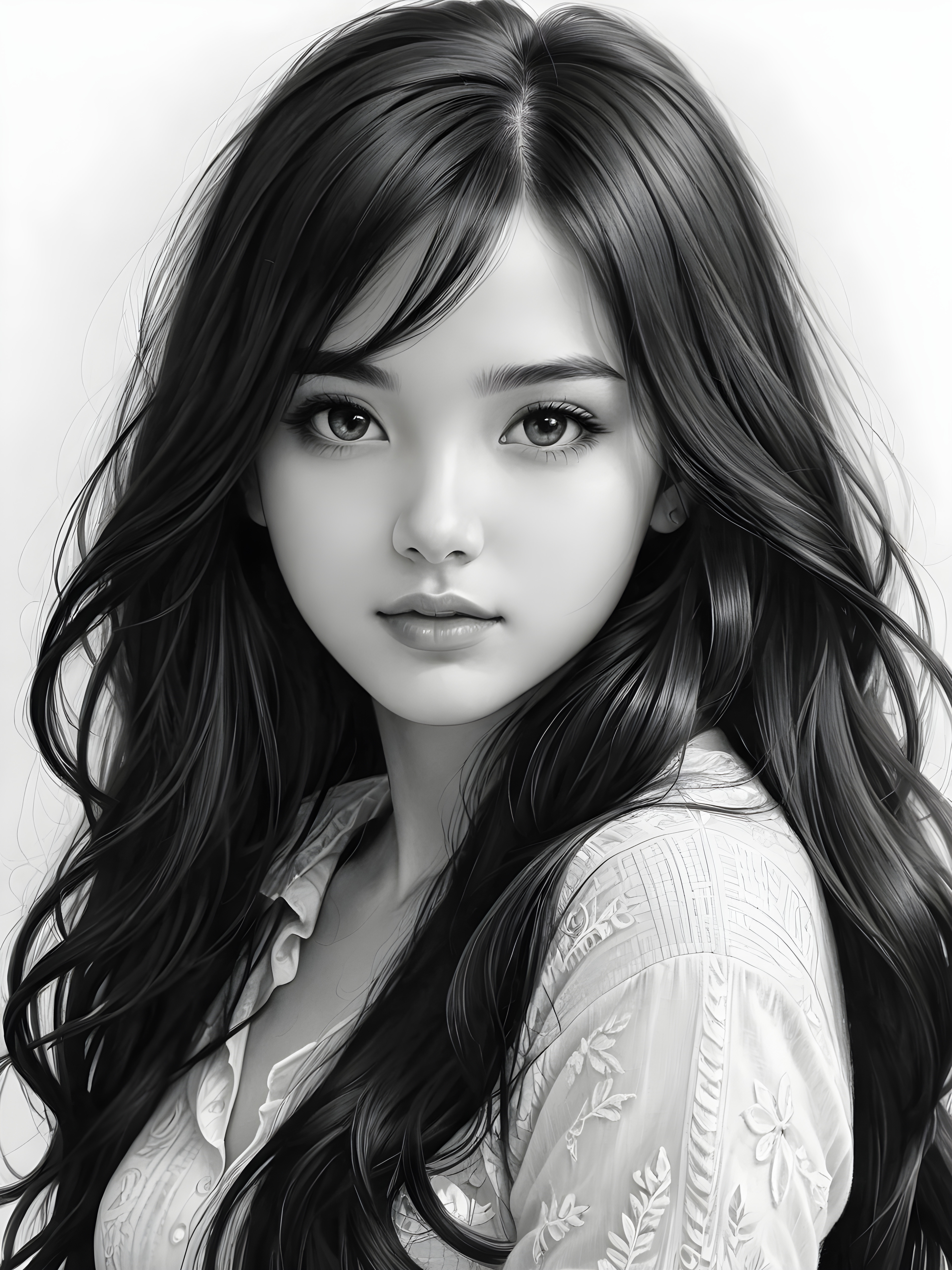 a pencil drawing ((black and white)), (((vividly drawn portrait))), capturing a young girl with long, flowing (((black hair))), her eyes sparkling and her skin radiant, embodying flawless beauty