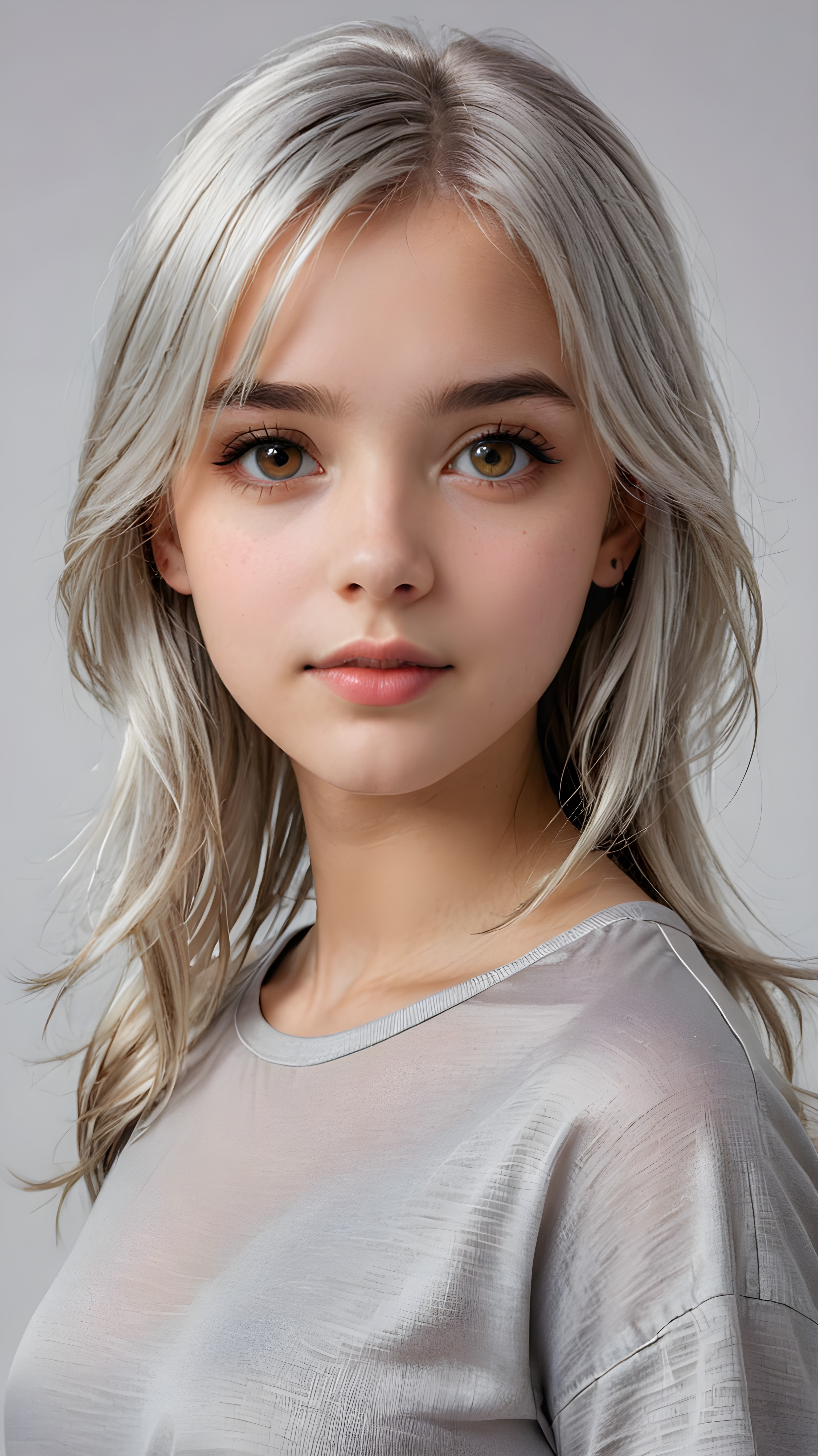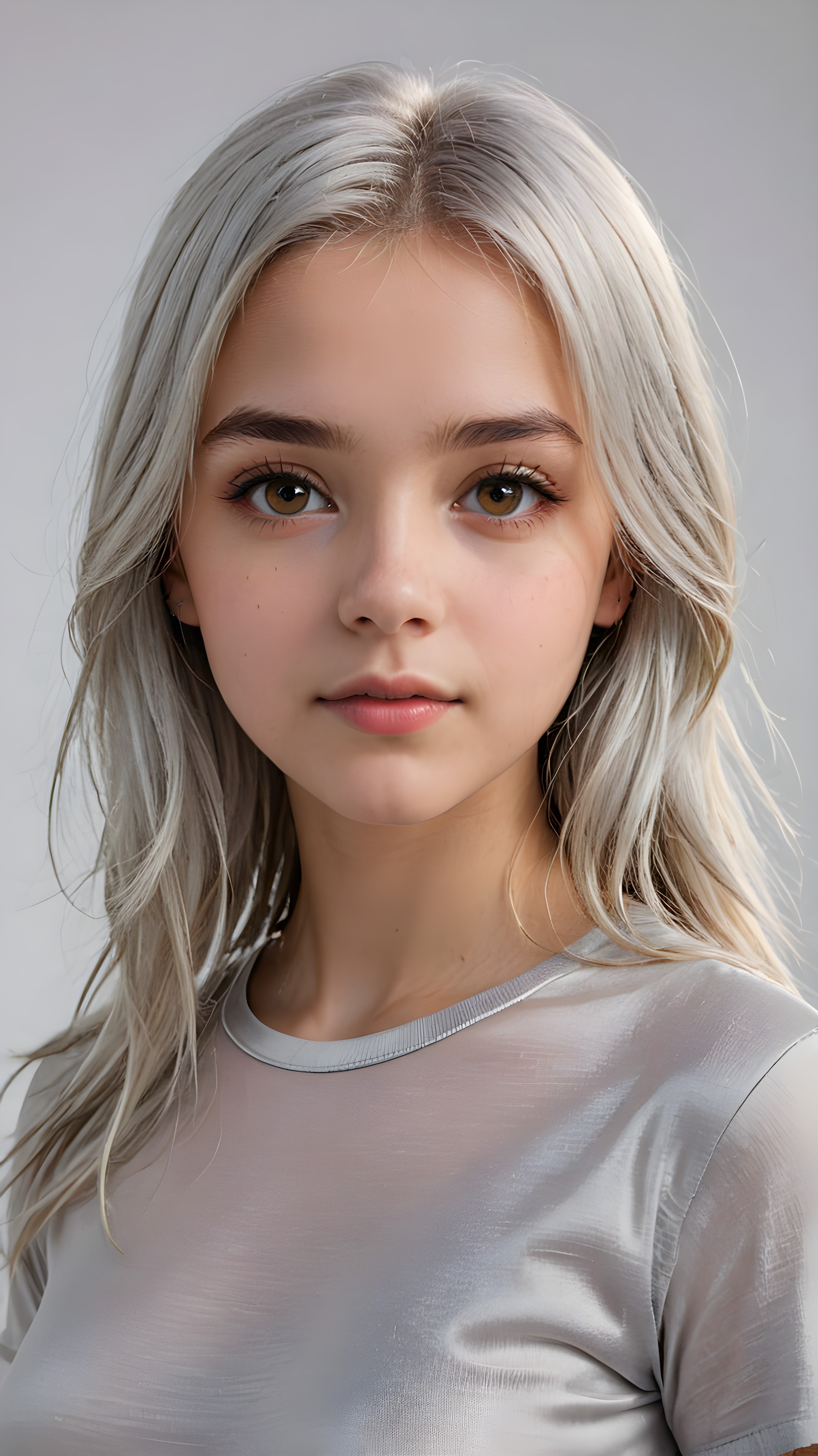 a realistic, cinematic lights, very cute teen girl, 13 years old, bangs haircut, detailed long straight soft (silver white) hair, realistic detailed angelic face, realistic detailed (amber) eye, looks at the camera, portrait shot, perfect curved, wears a super short tight grey t-shirt made of silk, perfect anatomy, white background, side perspective