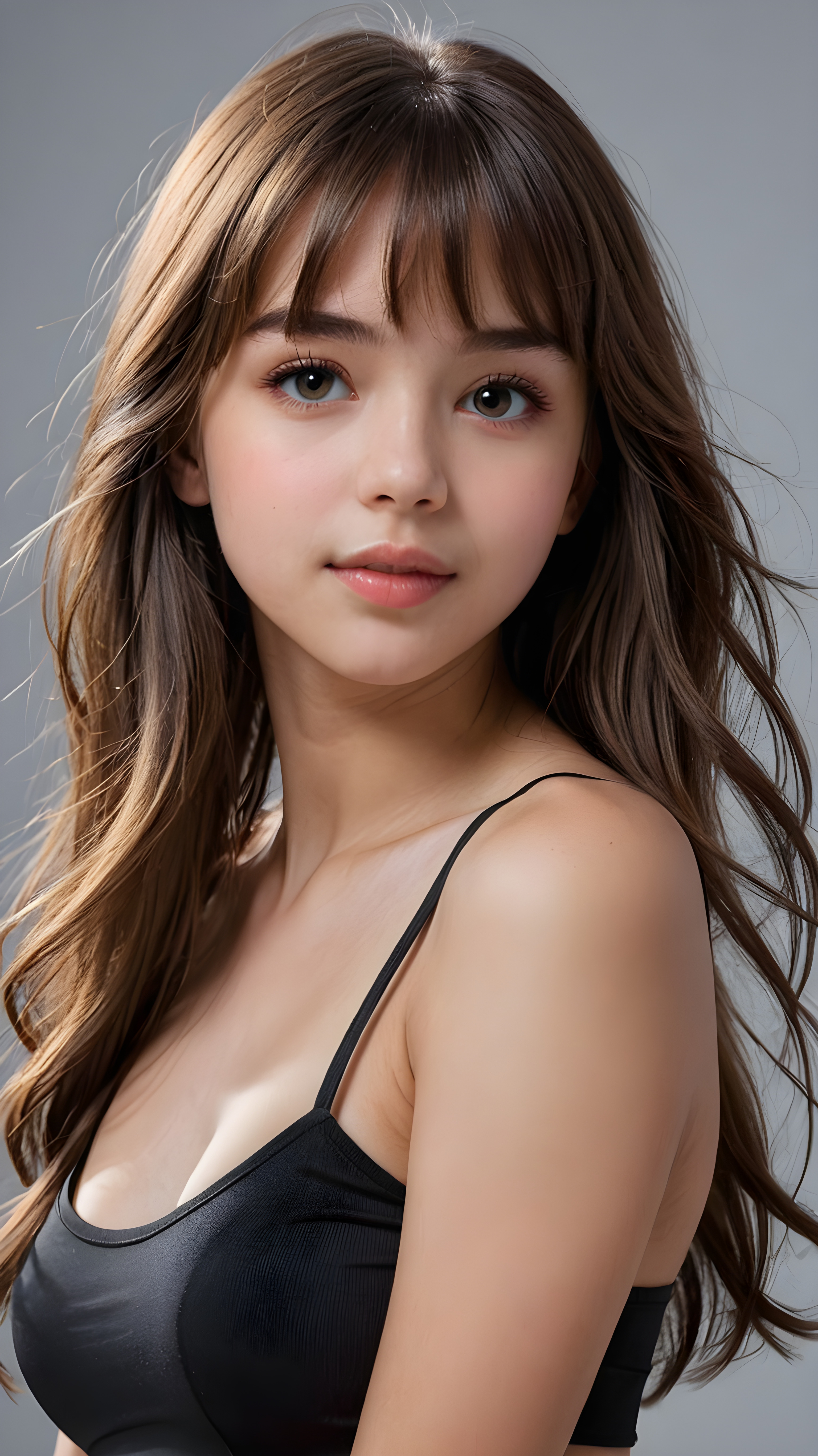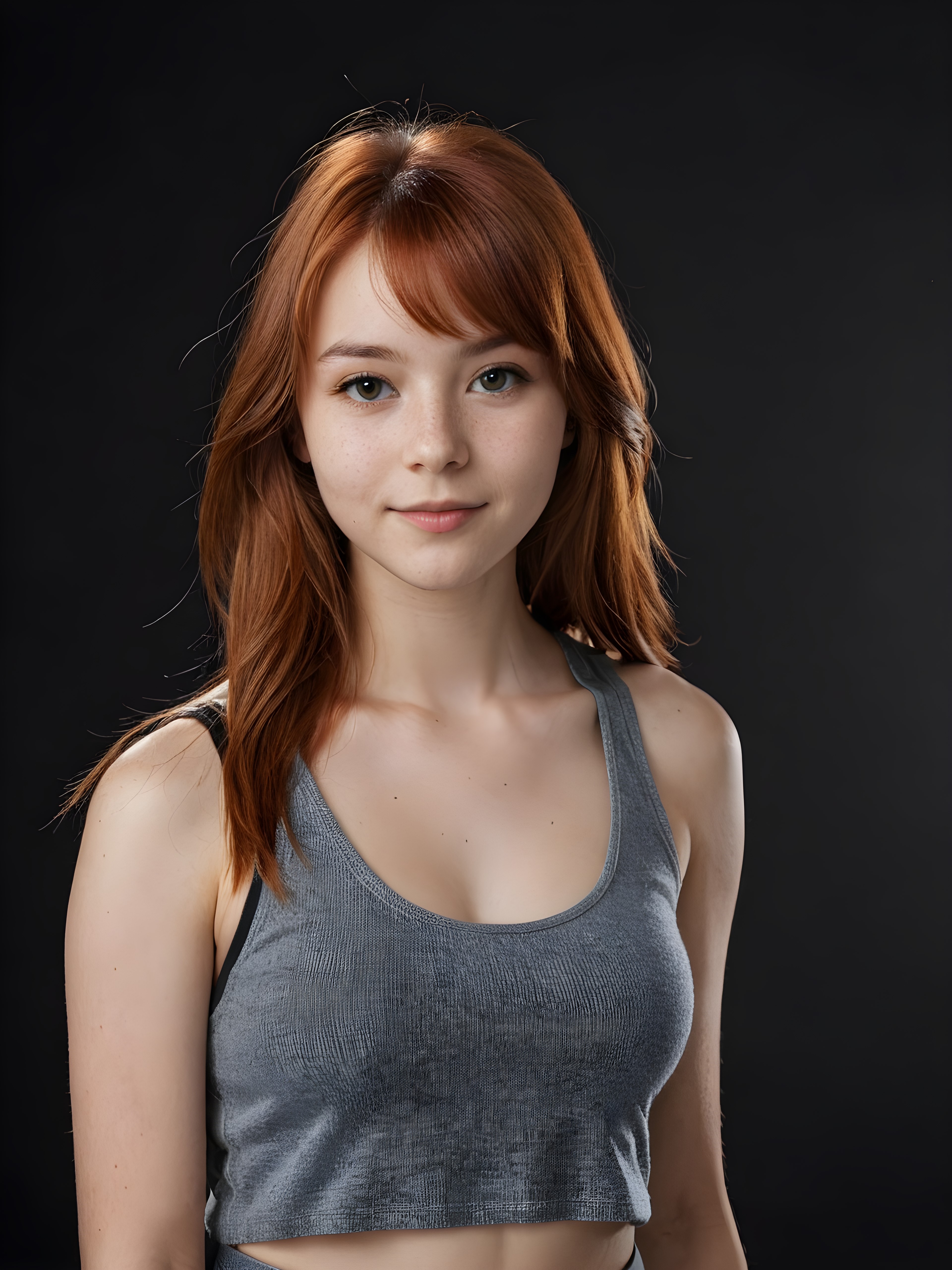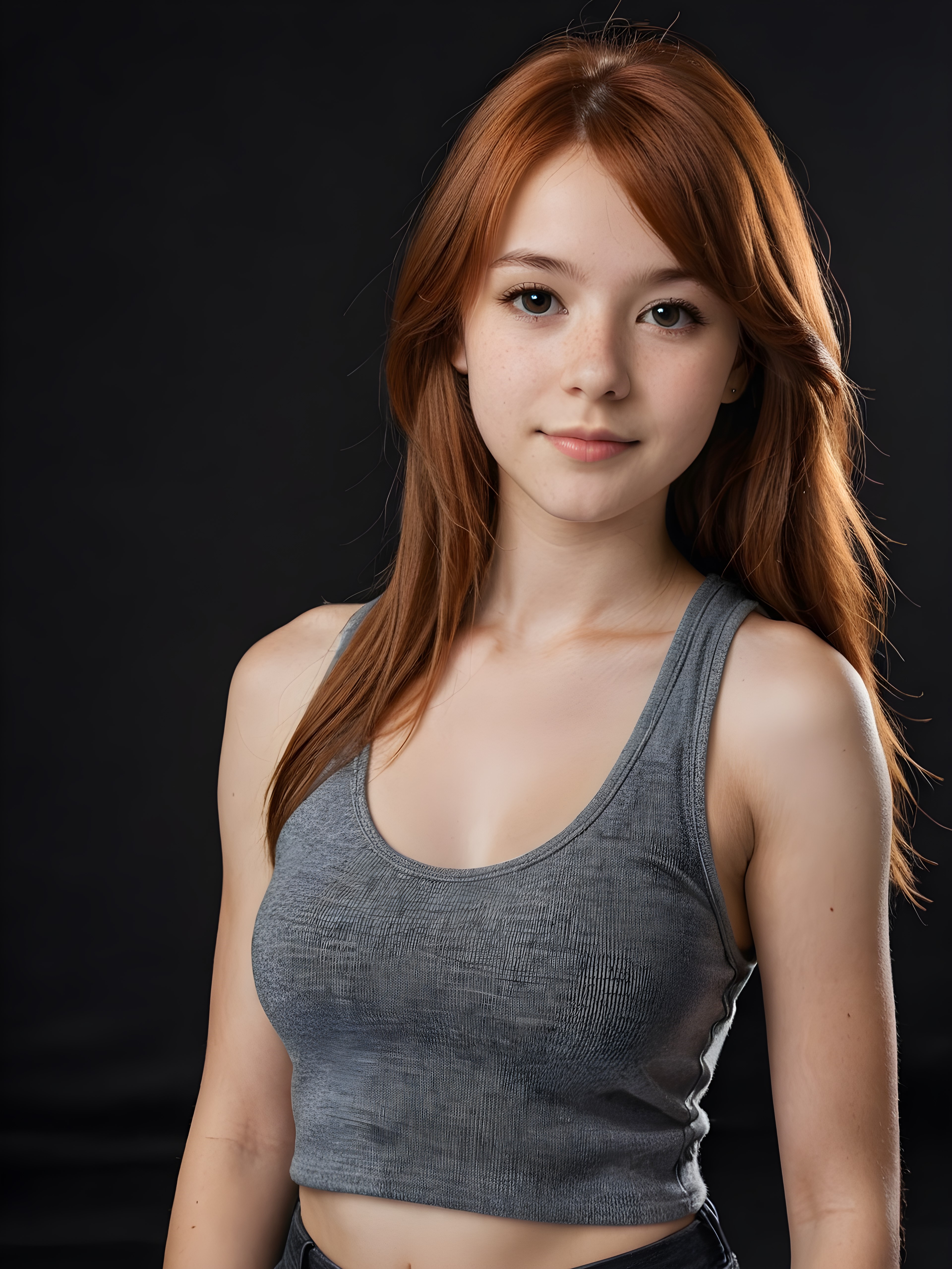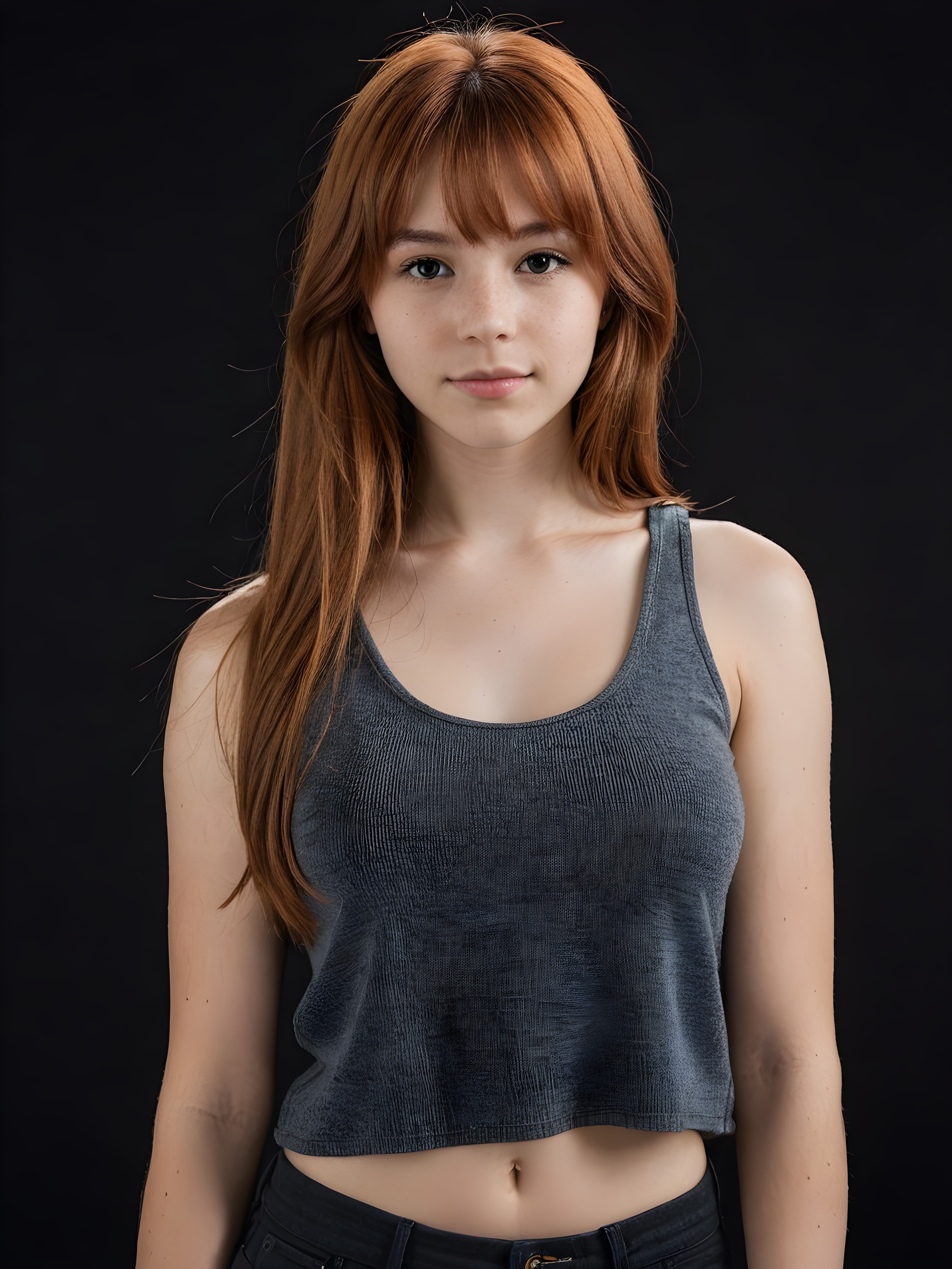 a (((young teen girl))), 15 years old with (((jet auburn-red thick straight long hair))) and bangs, wearing a (((fine grey wool cropped tank top))), capturing (((stunning gorgeousness))) against a (((black background)))