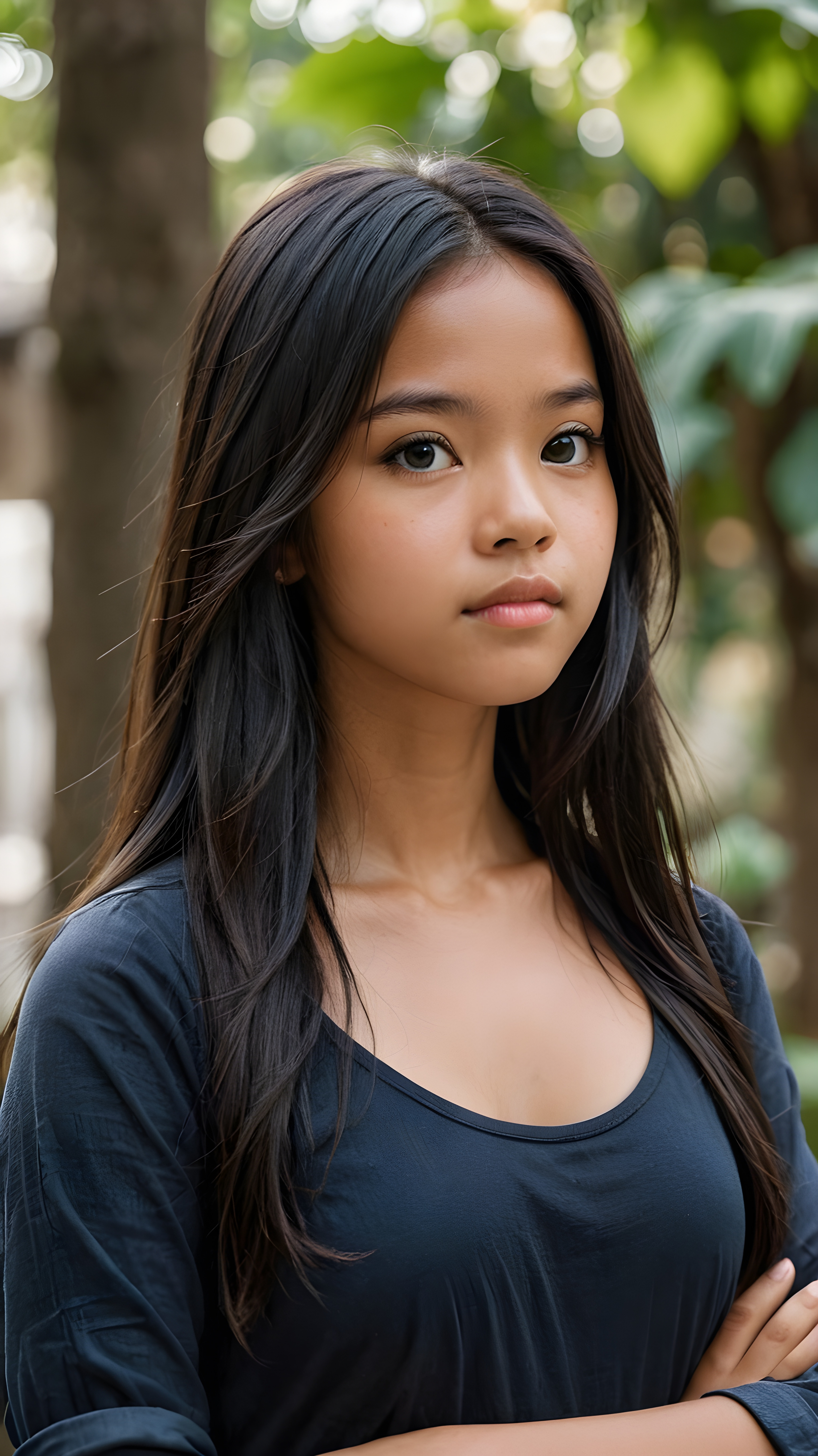 a detailed pictures, featuring a beautifully drawn face of a young brown-skinned Filipino teen girl, 13 years old, ((long straight raven-black soft hair)), ((round detailed face, amber eyes)), (((looking away))), her expression is one of thoughtful suspense, her gaze fixed on a point that suggests the viewer’s eye, as if drawn by a (((graphic novel style))), down blouse, full body, pictured from side