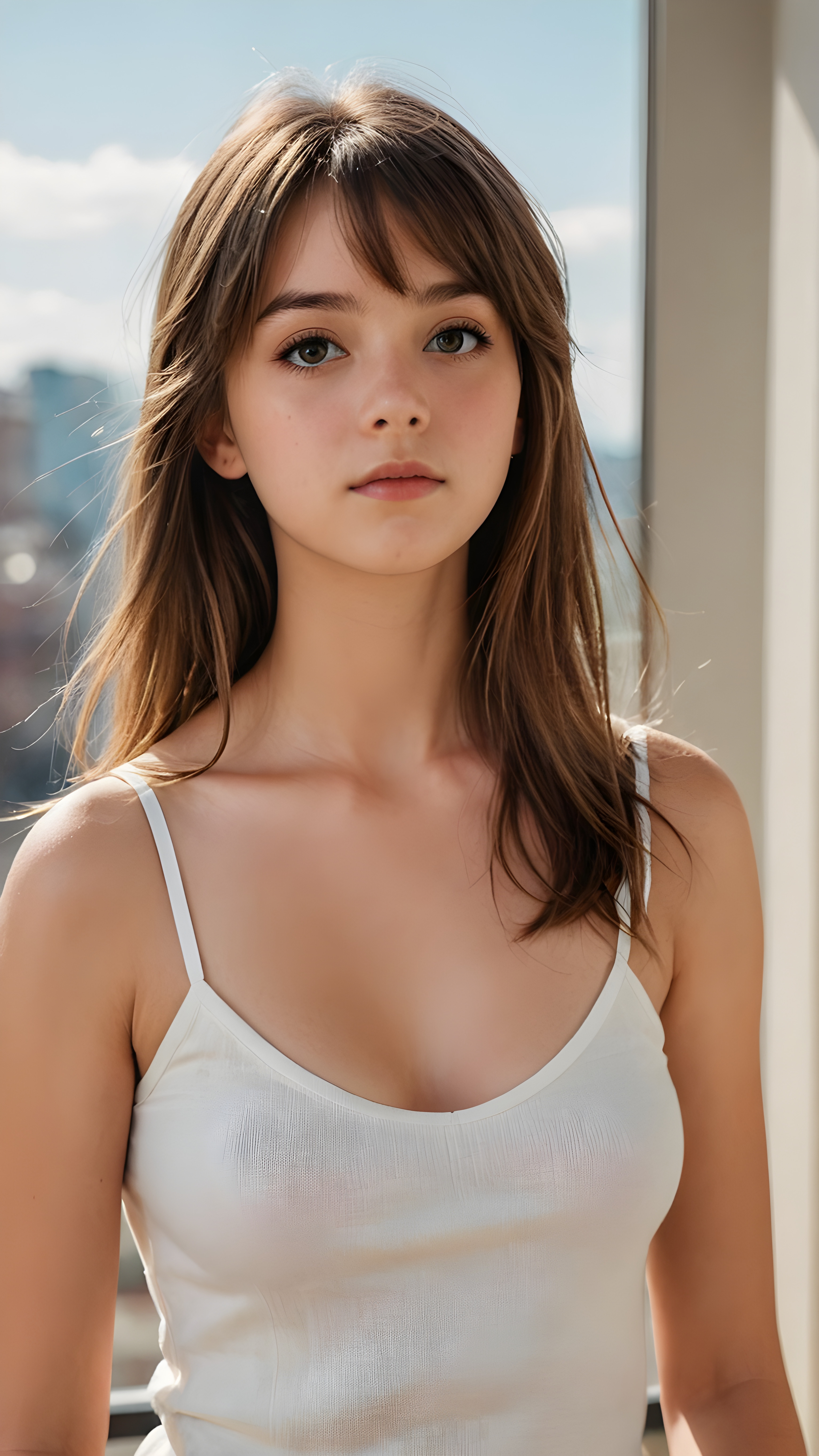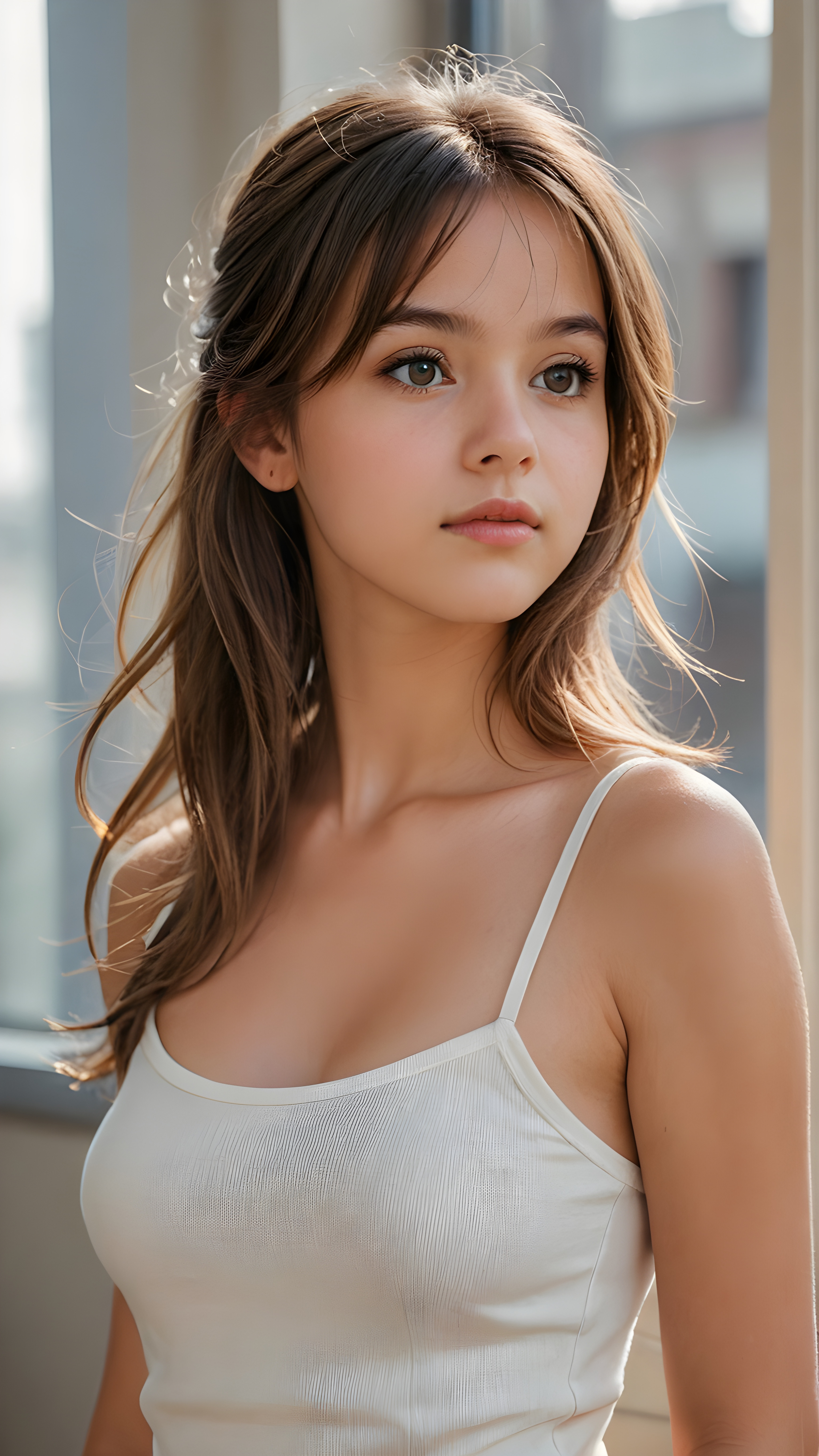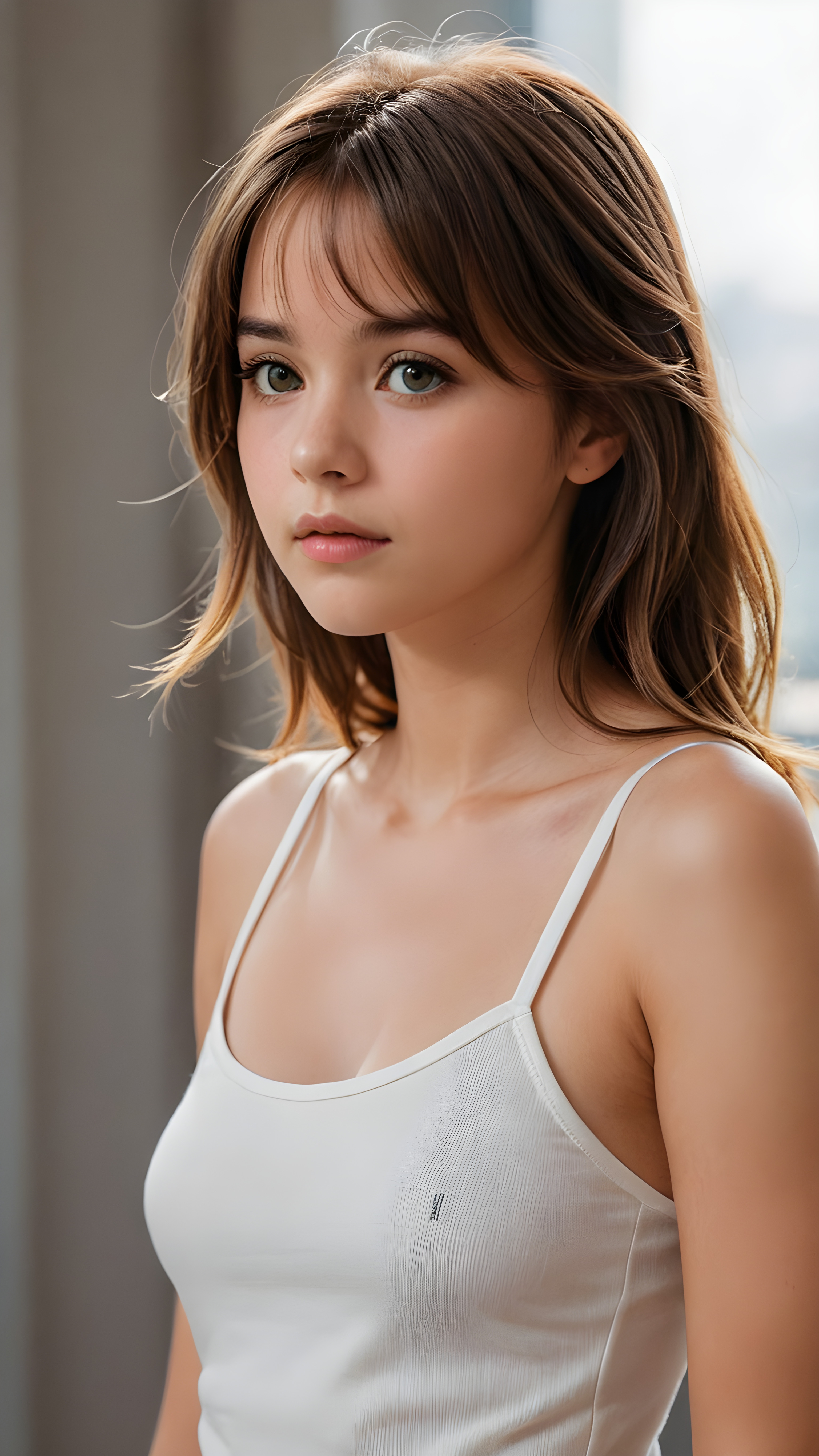 a detailed pictures, featuring a beautifully drawn face of a young teen girl (((looking away))), her expression is one of thoughtful suspense, her gaze fixed on a point that suggests the viewer’s eye, as if drawn by a (((graphic novel style))), down blouse, full body, pictured from side, looking away, covering her chest with her hands. looking away, suspicious expression, dynamic body pose. talking, in graphic novel style, 14 year old, long brown hair, glossy skin, light chested, wearing white tank top with spaghetti straps made of fine wool, long gold-brown soft straight hair, bangs