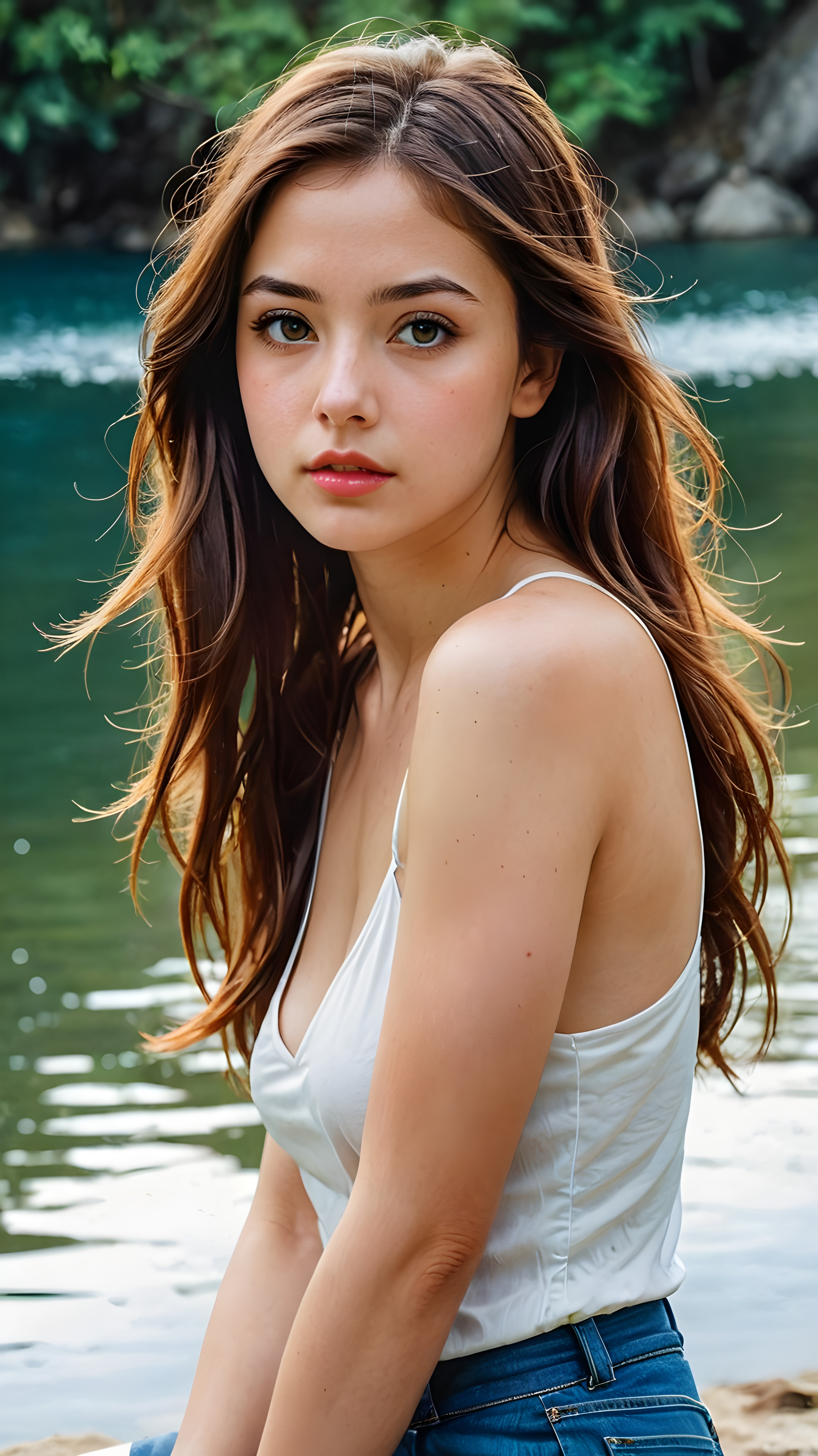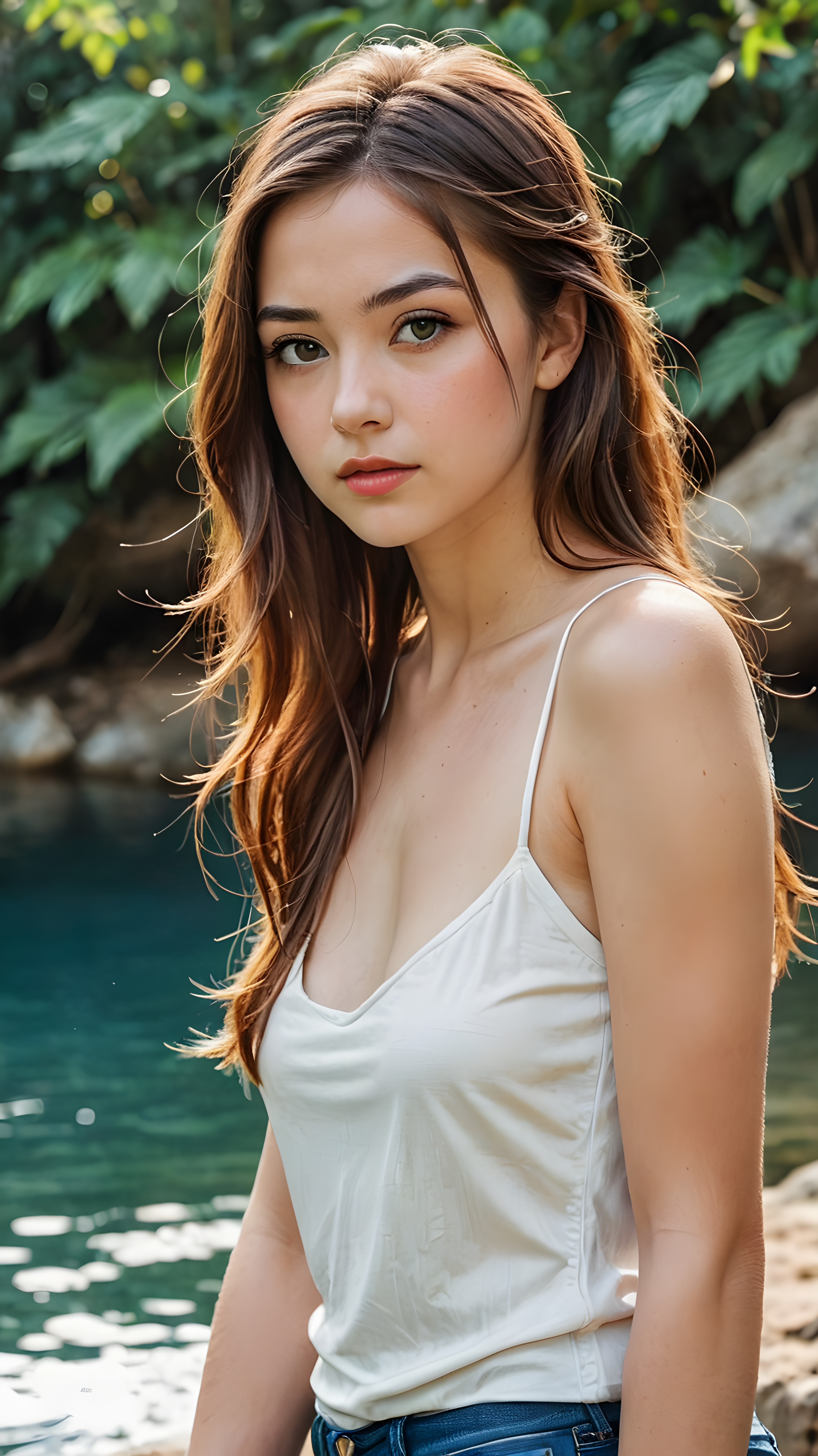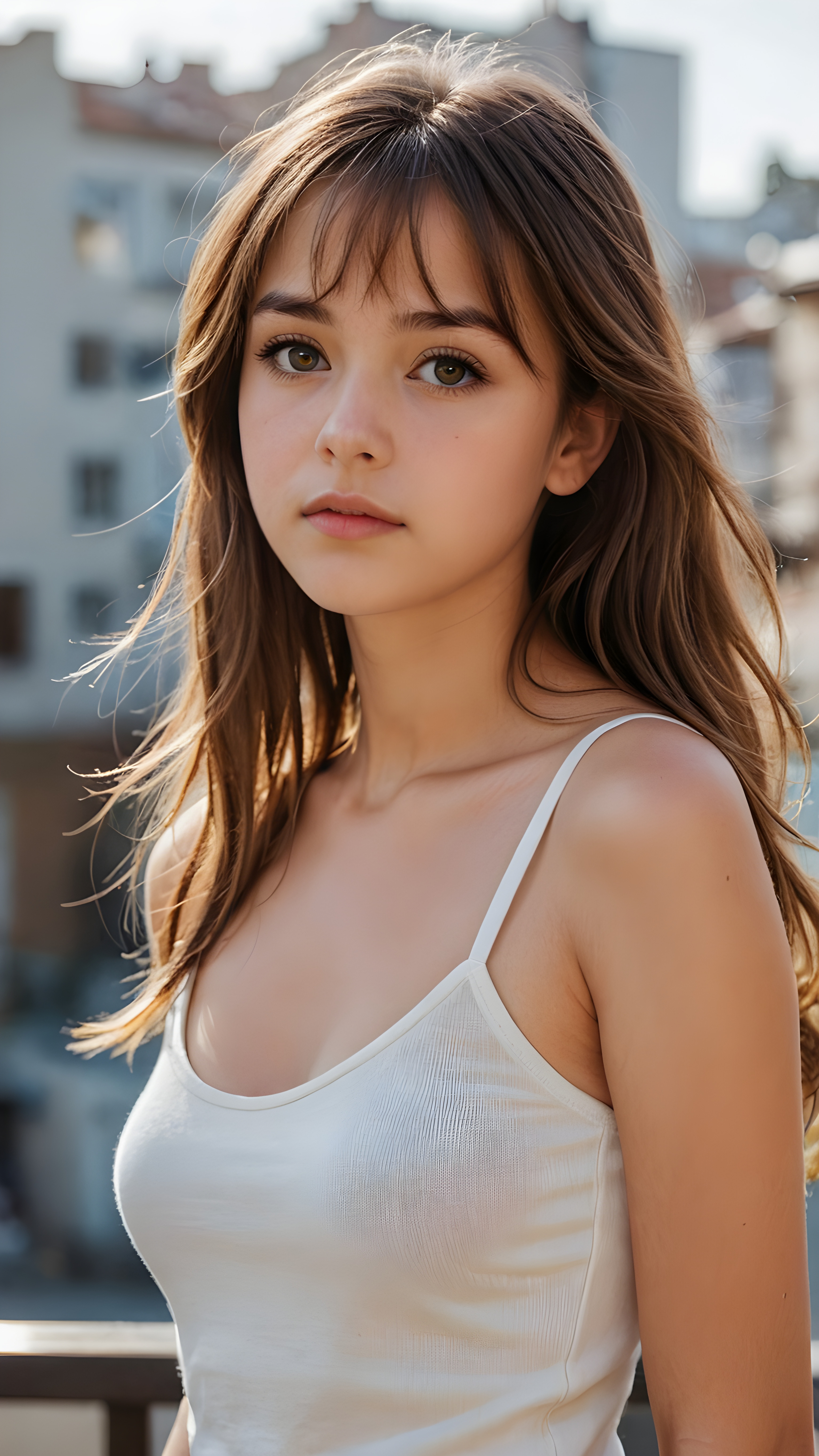 a detailed pictures, featuring a beautifully drawn face of a young teen girl (((looking away))), her expression is one of thoughtful suspense, her gaze fixed on a point that suggests the viewer’s eye, as if drawn by a (((graphic novel style))), down blouse, full body, pictured from side, looking away, covering her chest with her hands. looking away, suspicious expression, dynamic body pose. talking, in graphic novel style, 14 year old, long brown hair, glossy skin, light chested, wearing white tank top with spaghetti straps made of fine wool, long gold-brown soft straight hair, bangs