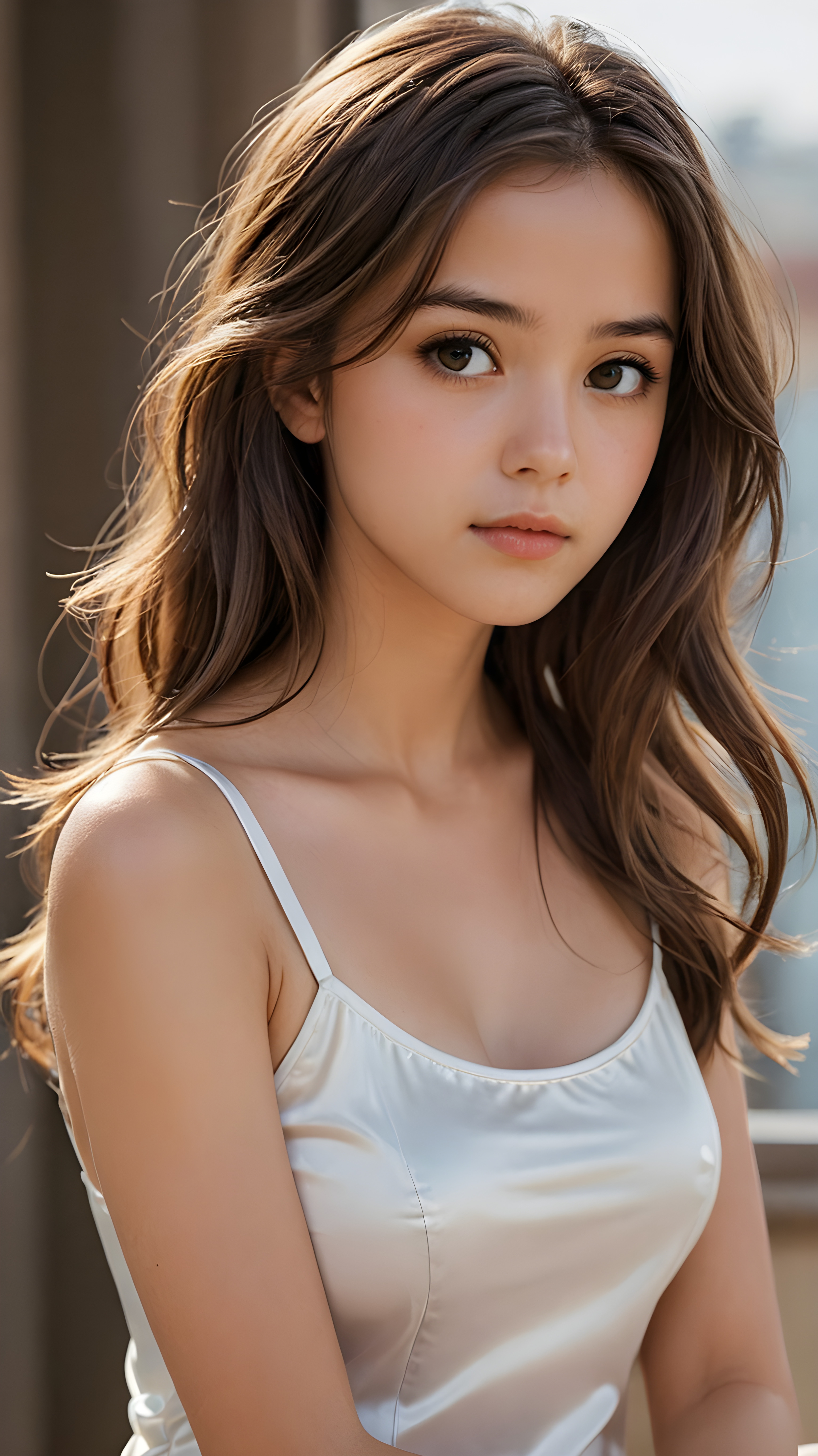 a detailed pictures, featuring a beautifully drawn face of a young woman (((looking away))) with a softly detailed, yet distinctly anime-like style. Her expression is one of thoughtful suspense, her gaze fixed on a point that suggests the viewer’s eye, as if drawn by a (((graphic novel style))), down blouse, full body, perite girl pictured from side, looking away, covering her chest with her hands. looking away, suspicious expression, dynamic body pose. talking, in graphic novel style, 14 year old, long brown hair, glossy skin, light chested, wearing white satin tank top with spaghetti straps, long gold-brown soft straight hair