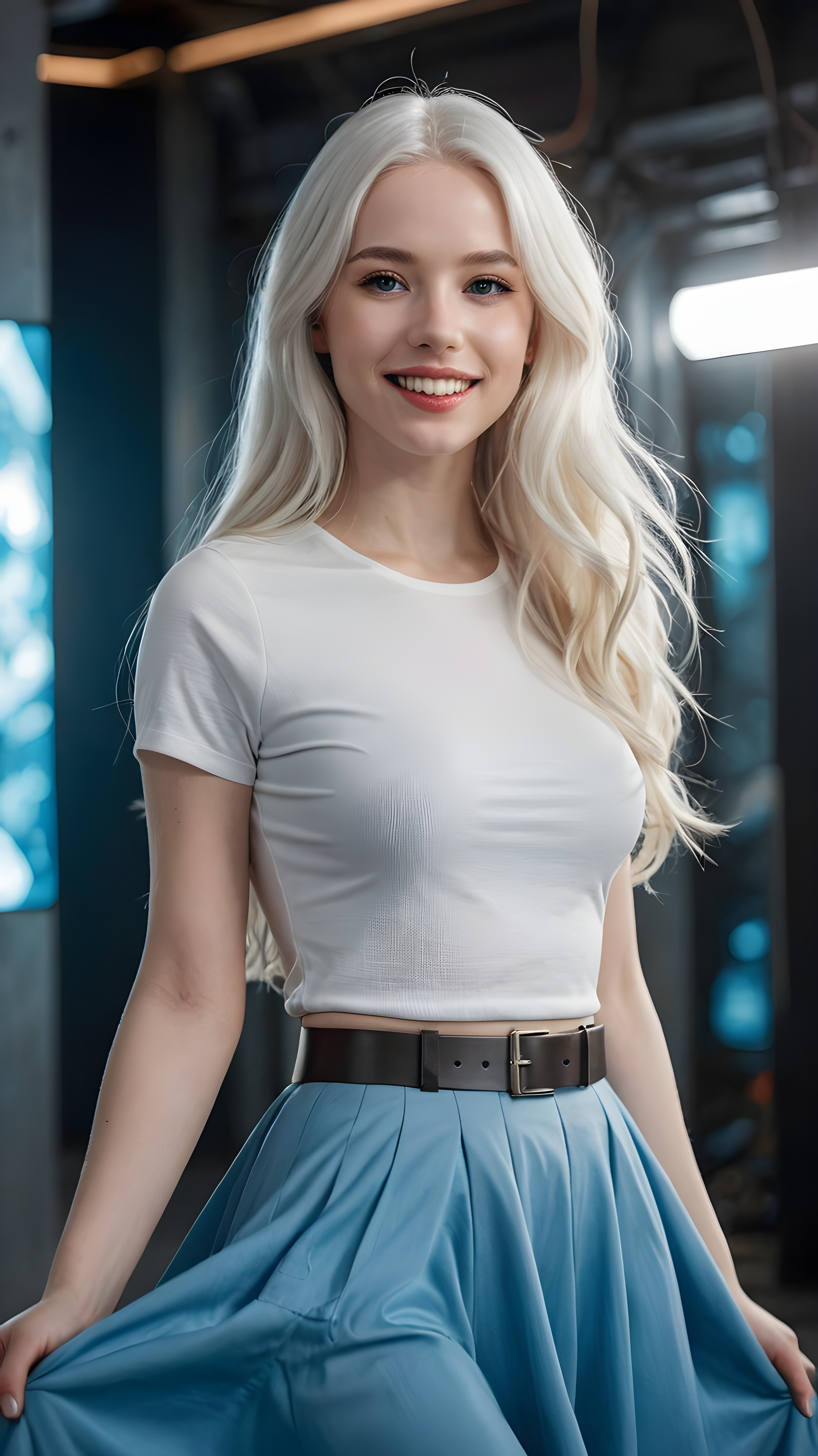 A (((super realistic and highly detailed full-body portrait))), featuring a (((beautiful young girl with pale skin and super long, flowing white hair))), looking sweetly into the camera, with (((vividly detailed, glowing white teeth))), wearing a (((white t-shirt and a blue skirt))), poised confidently, her head tilted back slightly, as if relaxed, against a backdrop of a (abstract dark, futuristic atmosphere), with a (modern, minimalist black leather belt) and a (abstract dark, futuristic atmosphere) that echo the artist’s trademark aesthetic