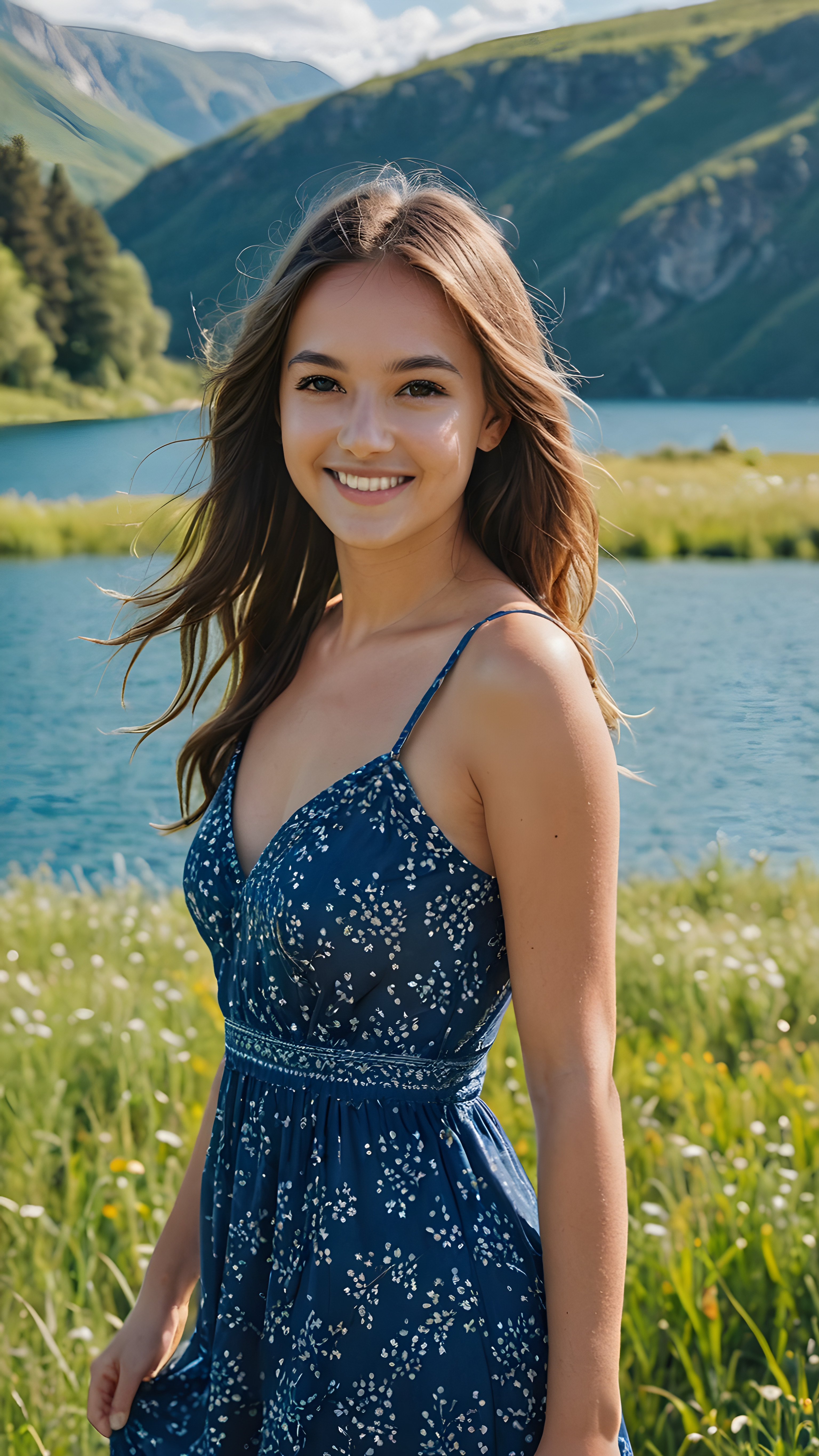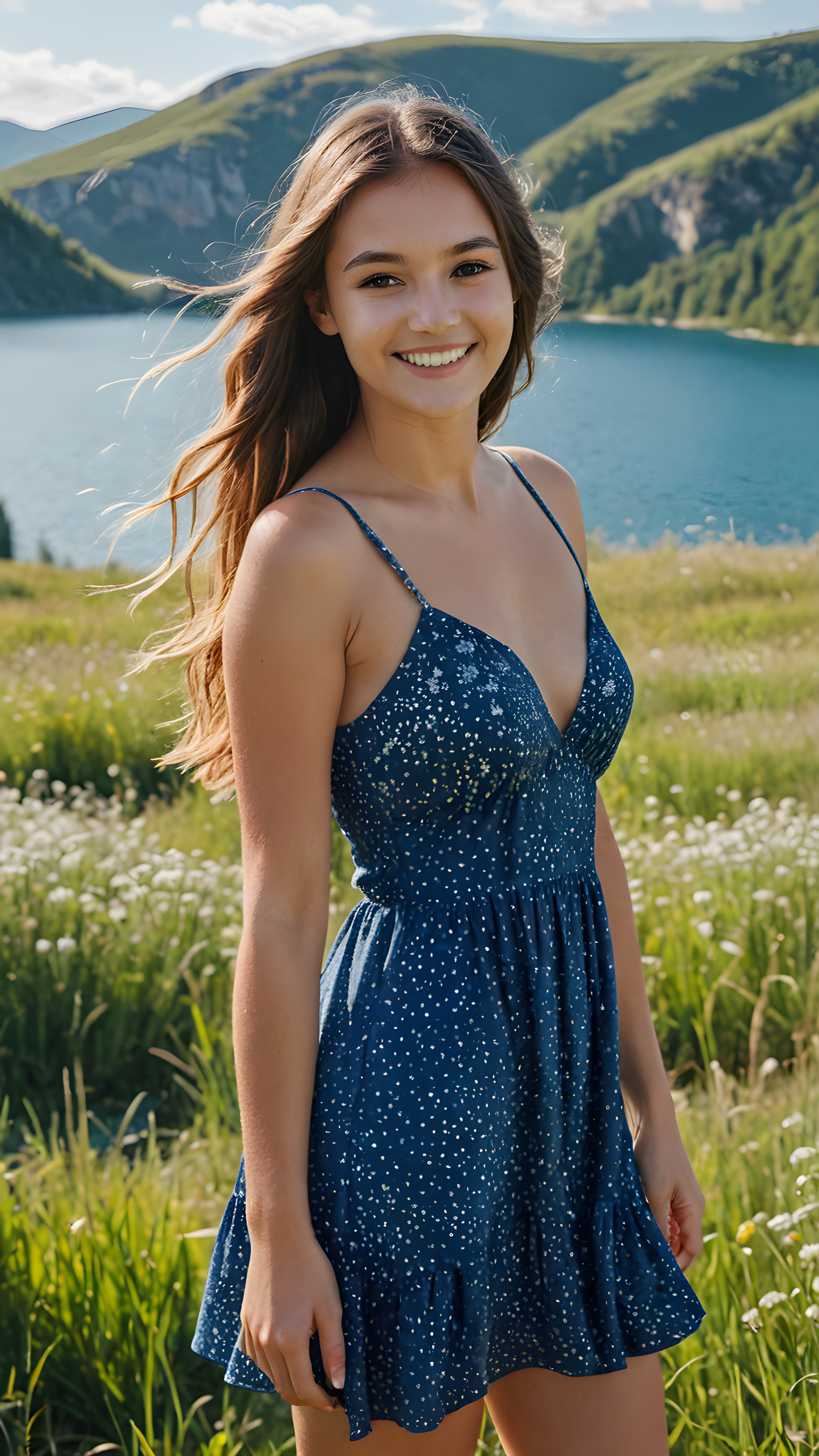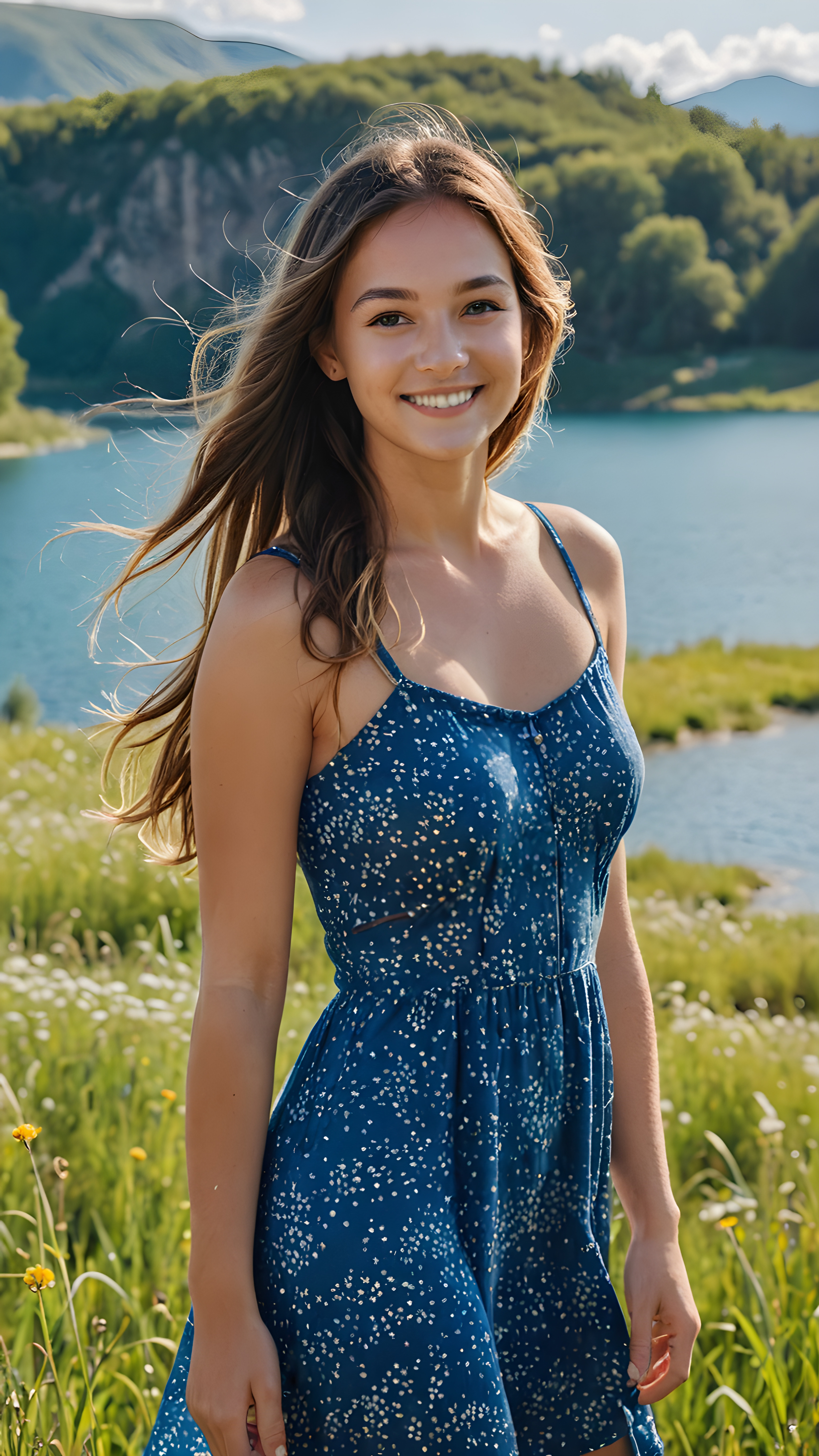 a fantastic young girl with long hair is standing in a sunny meadow. In the background is a deep blue lake. She is wearing a skimpy, thin summer dress and is smiling, ((detailed and super realistic))