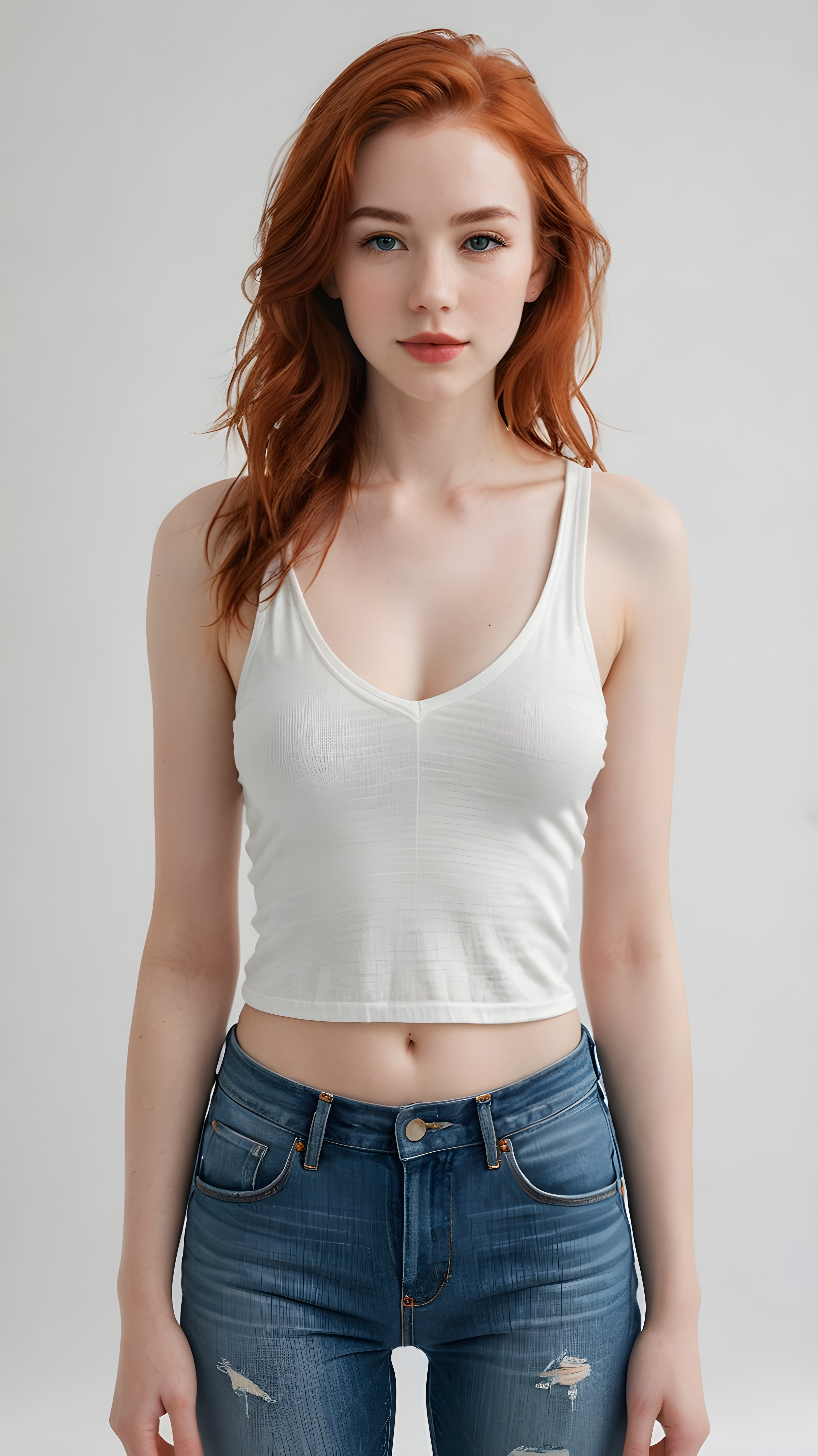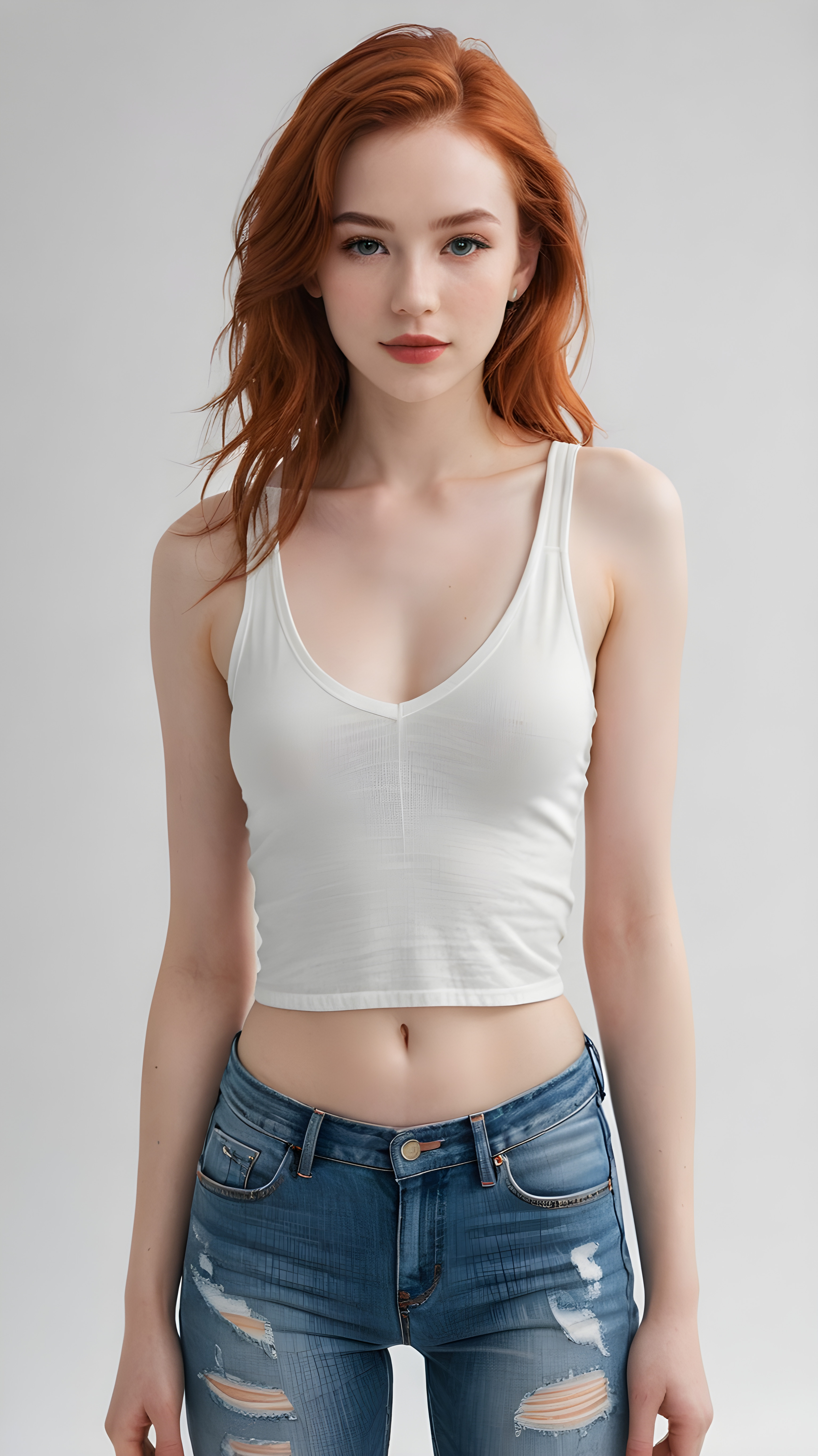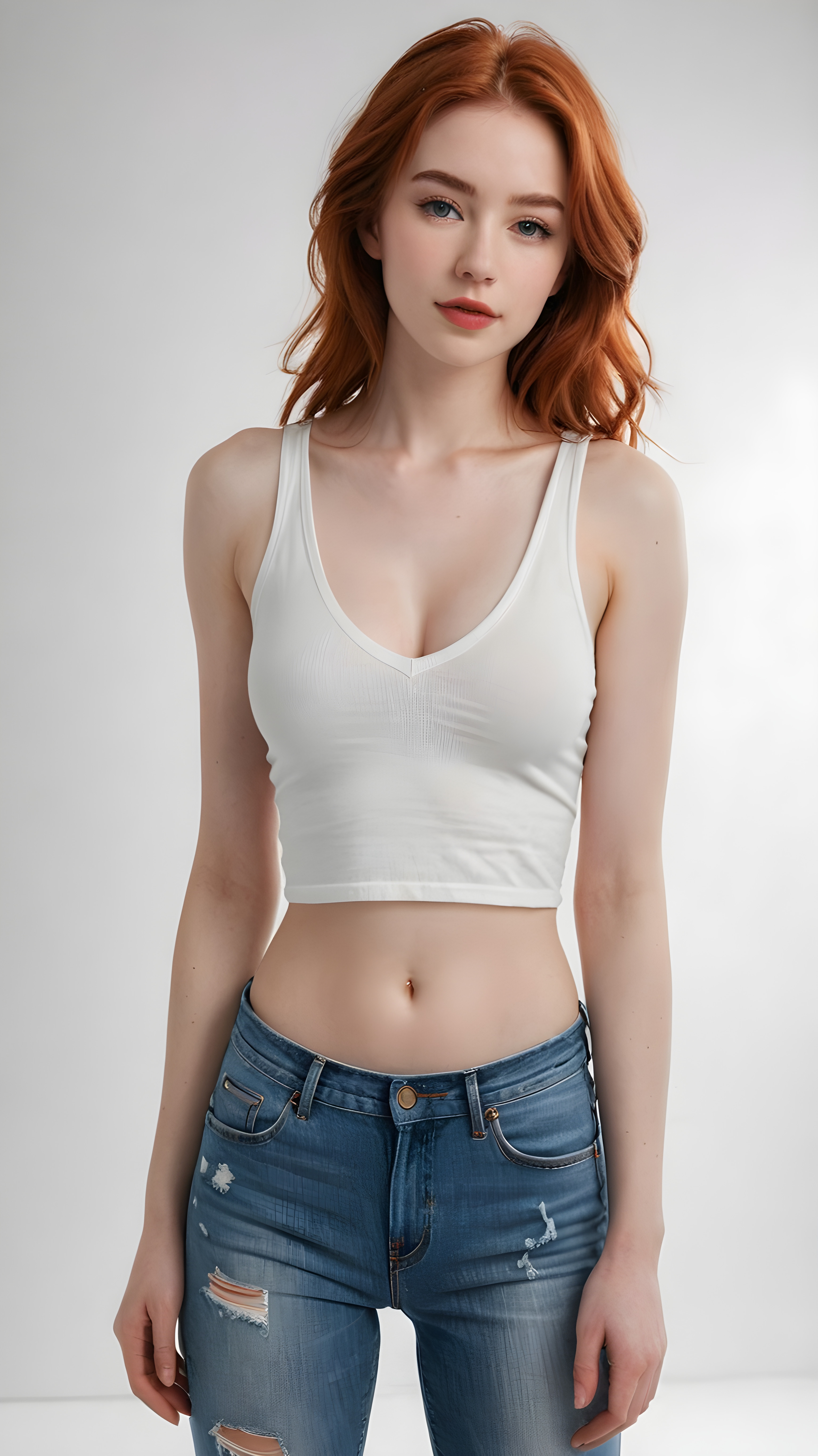 a (((super realistic and highly detailed full-body portrait))), featuring a (((beautiful young girl with delicate, pale white skin))), long, fluffy, super soft red hair that covers half her face, with natural red lips and a cute, playful expression, looking sweetly into the camera. She’s dressed in a (((white cropped tank top with deep v-neck and jeans))), with a (((natural, full-body view))), exuding a (((super real, full-body essence))), as if captured in a (((realistic film scene))). The background is (((completely blurred out)), creating a (((purely fantasy, abstract white backdrop))), against which the girl’s features and clothes appear in sharp detail, embodying an ultra-detailed, surreal fantasy aesthetic that is both realistic and highly detailed, with an 8K resolution that brings out every subtle detail, capturing the essence of the latest trends in artstation and photorealistic concept art. ((full body))