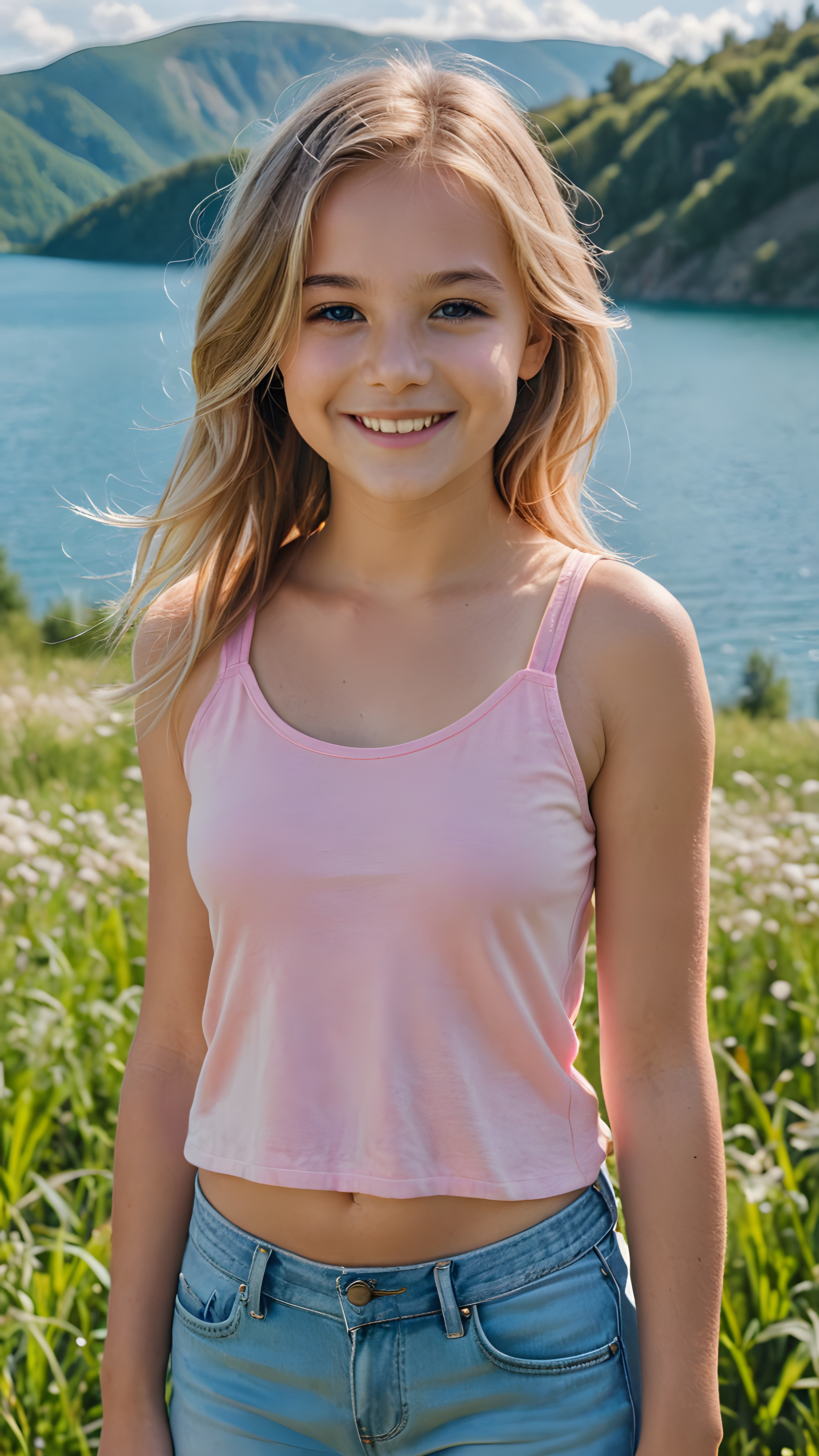 a fantastic young girl, 12 years old with long summer blond hair is standing in a sunny green meadow. In the background is a deep blue lake, she is smiling, ((detailed and super realistic)), ((she wears a short light pink cropped plain tank top))