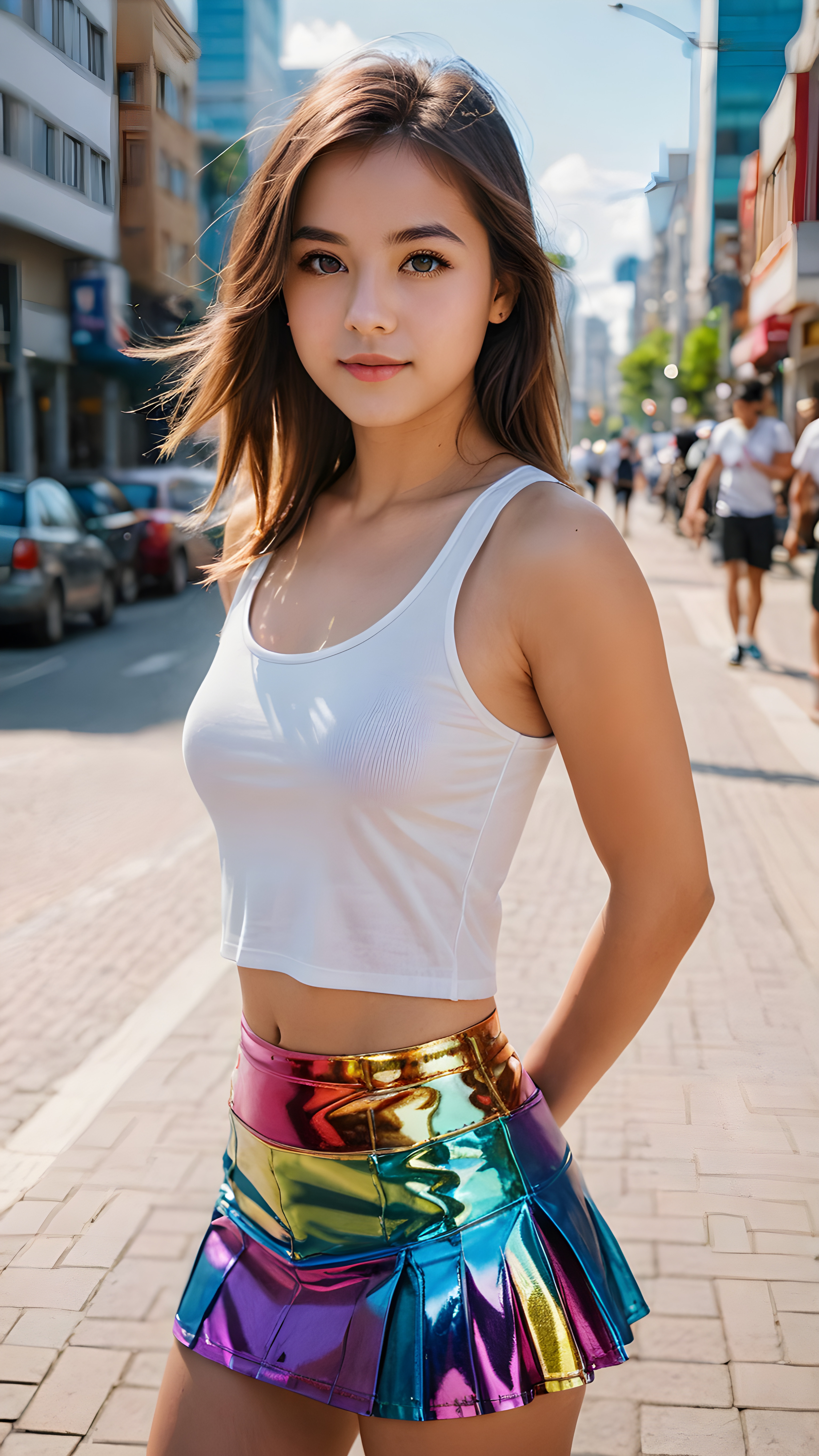 ((detailed and realistic)), front view, beautiful cute girl with soft straight hair, pretty outlook, cutie face, shiny eyes, wearing a colorful, vibrant, mini skirt, short cropped plain tank top, wide shot, low angle, sunny day, standing, city background, posing adorably