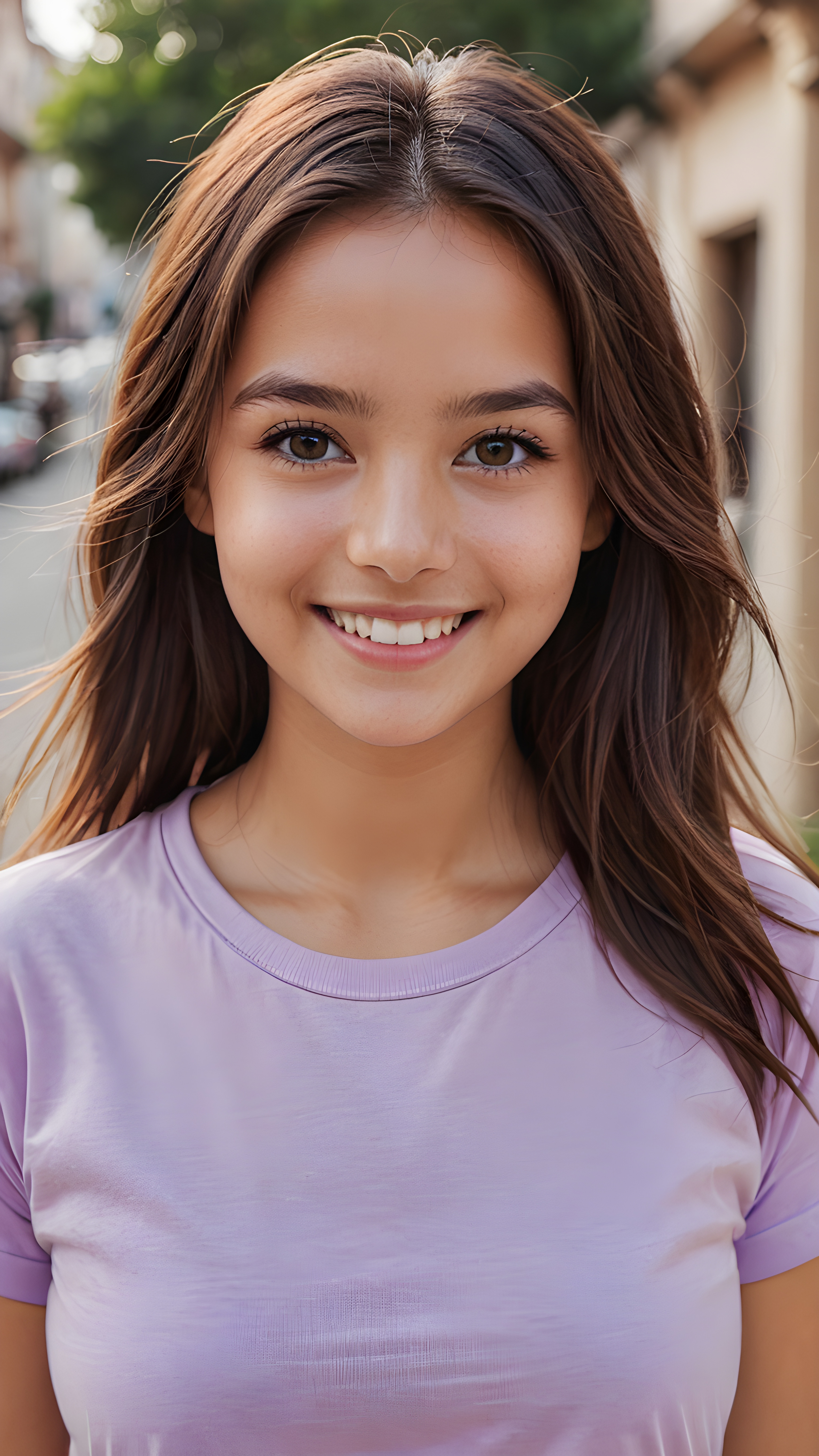 perfect portrait, very cute young girl, ((light violet plain t-shirt)), smile, detailed straight hair, brown eyes