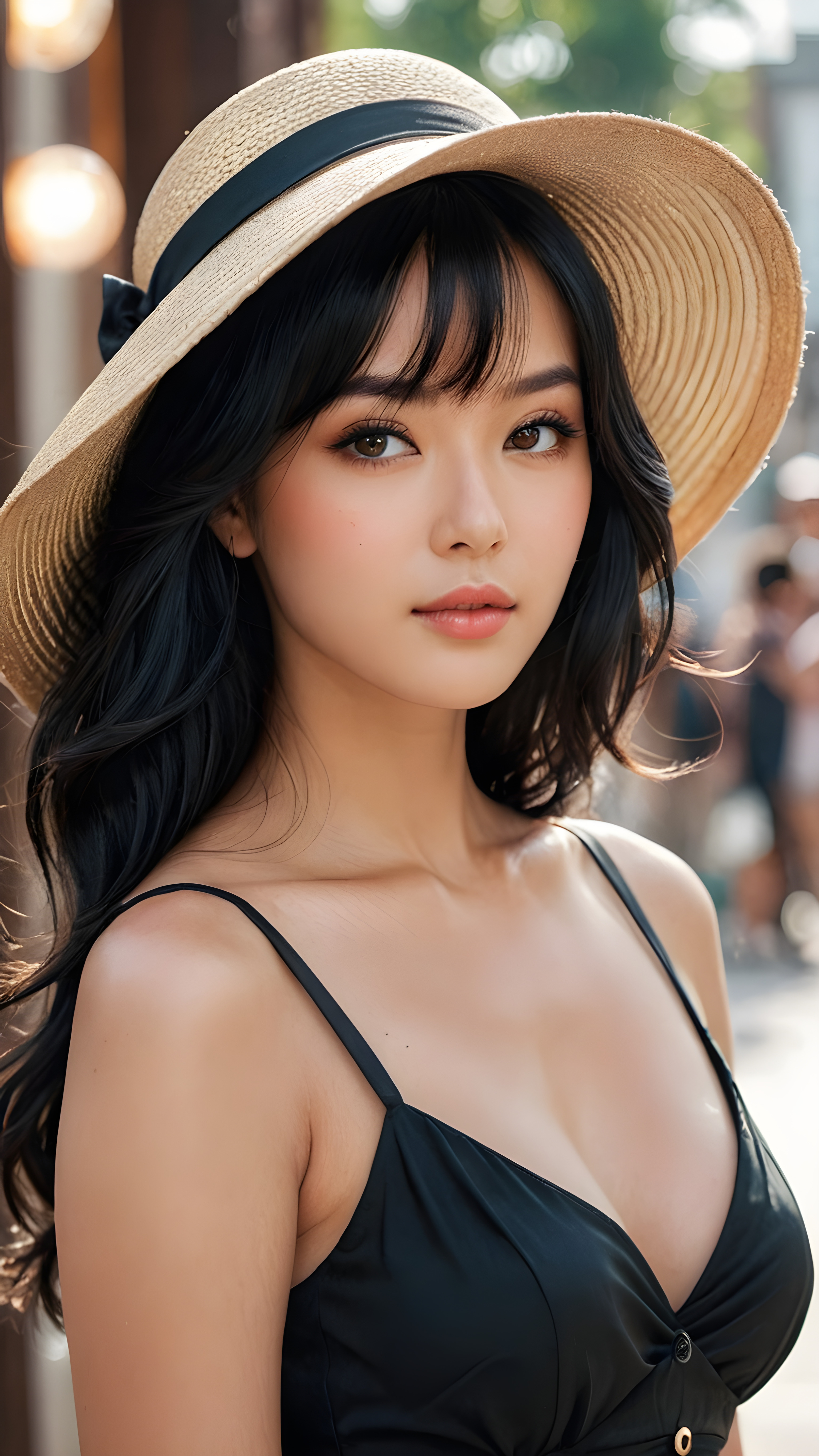 the blonde busty girl is incredibly beautiful, with a unique and very beautiful face, and very ((long, shiny, lustrous, silky black hair)) with bangs that frame the face, in an elegant up do, with a wide-brimmed hat, she is wearing a luxurious summer cropped tank top, elaborate, sophisticated, elegant, with a subtle shimmer, delicate, very detailed, real, hyper-realistic, 8k, impressive, deep, special, unique, extremely charming, beautiful, stunning, eye-catching, breathtaking, special, Korean, impressive, breathtaking, deep, special