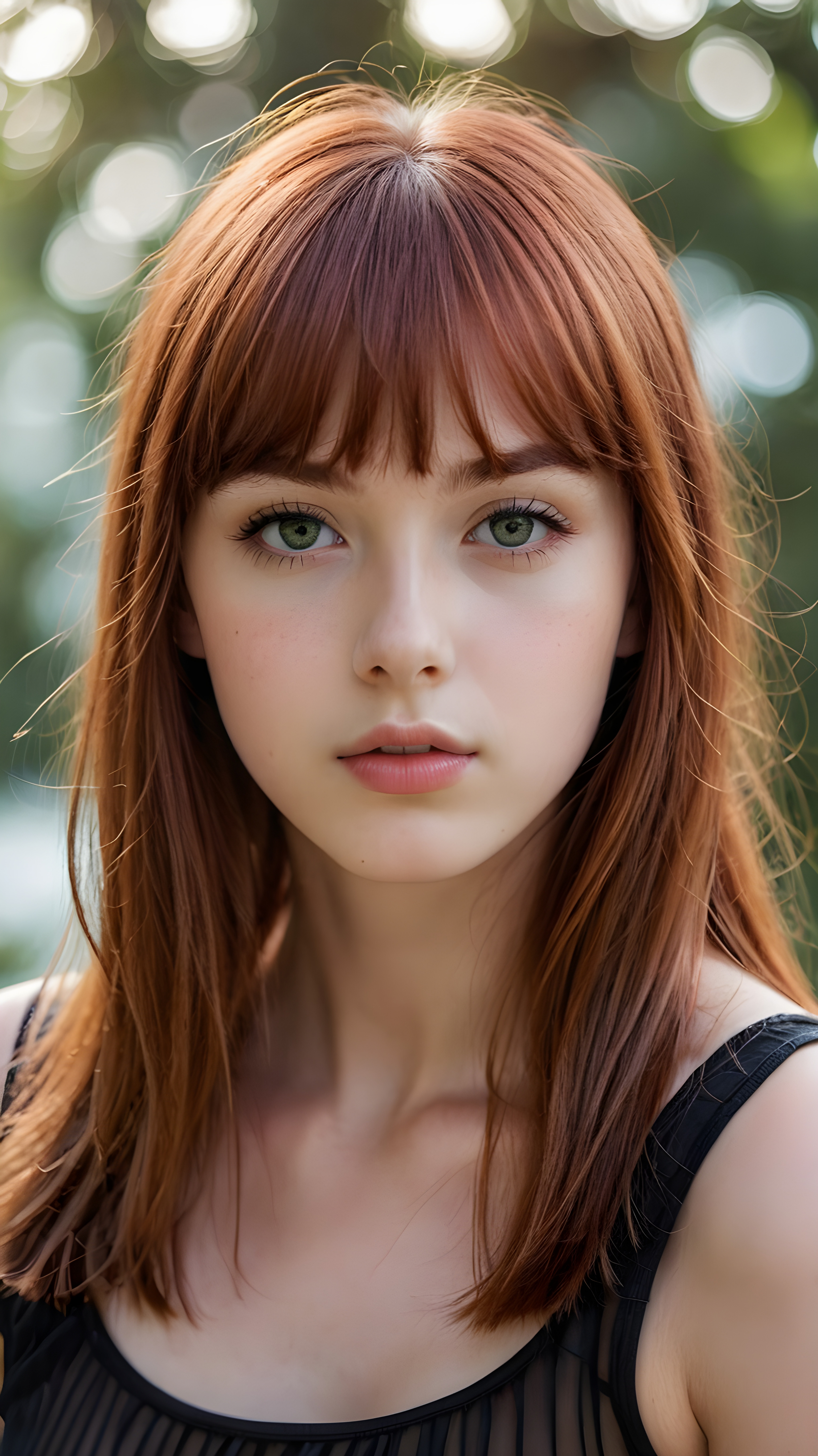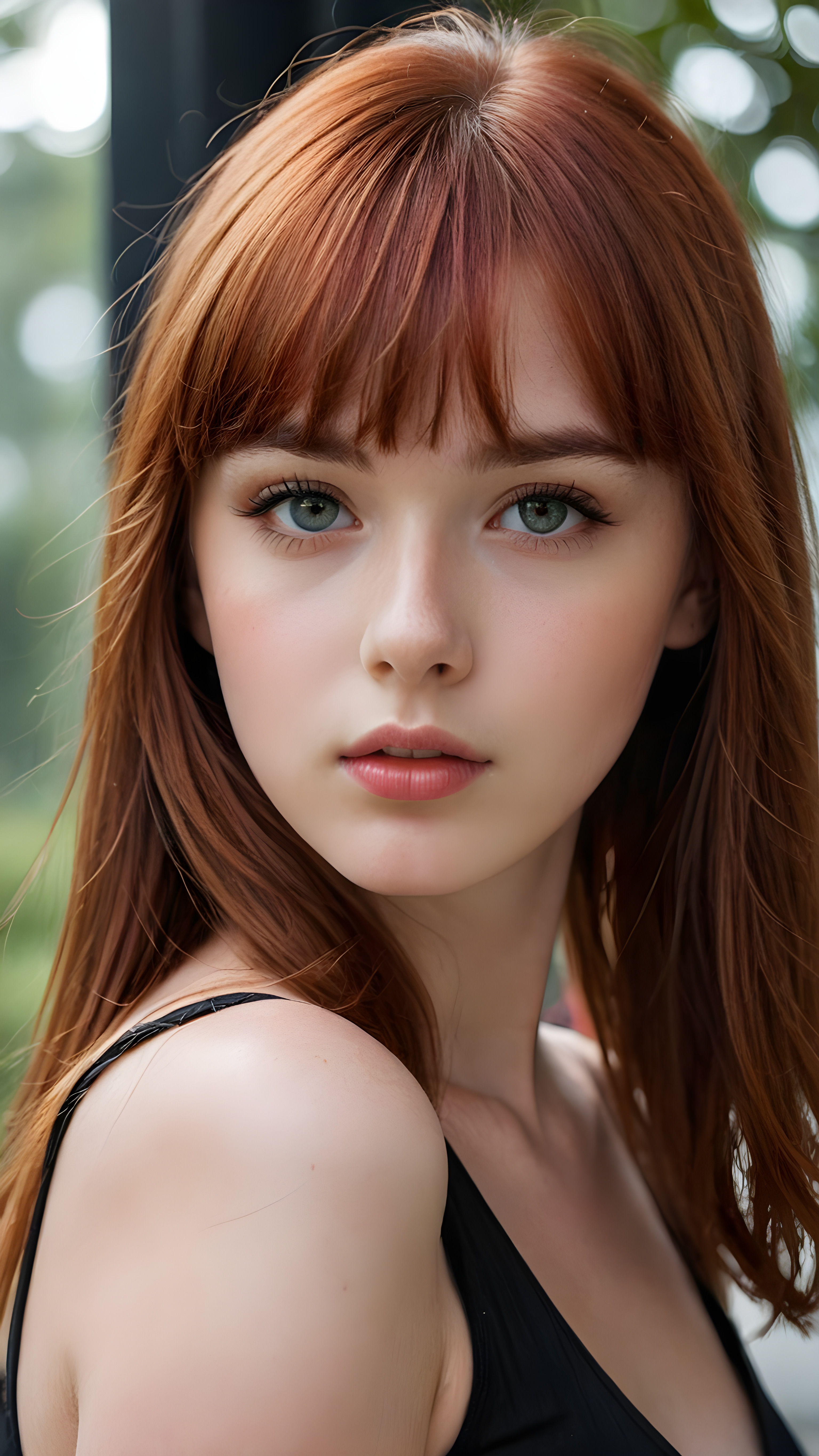 visualize a (((really detailed young teenage girl with long, soft straight red hair framing her face in classic bangs, her lips looking seductively parted against a (translucent, otherworldly backdrop))), dressed in a sleek, black tank top that accentuates every curve of her stunningly beautiful form, against a backdrop that suggests an ethereal mist, close up portrait