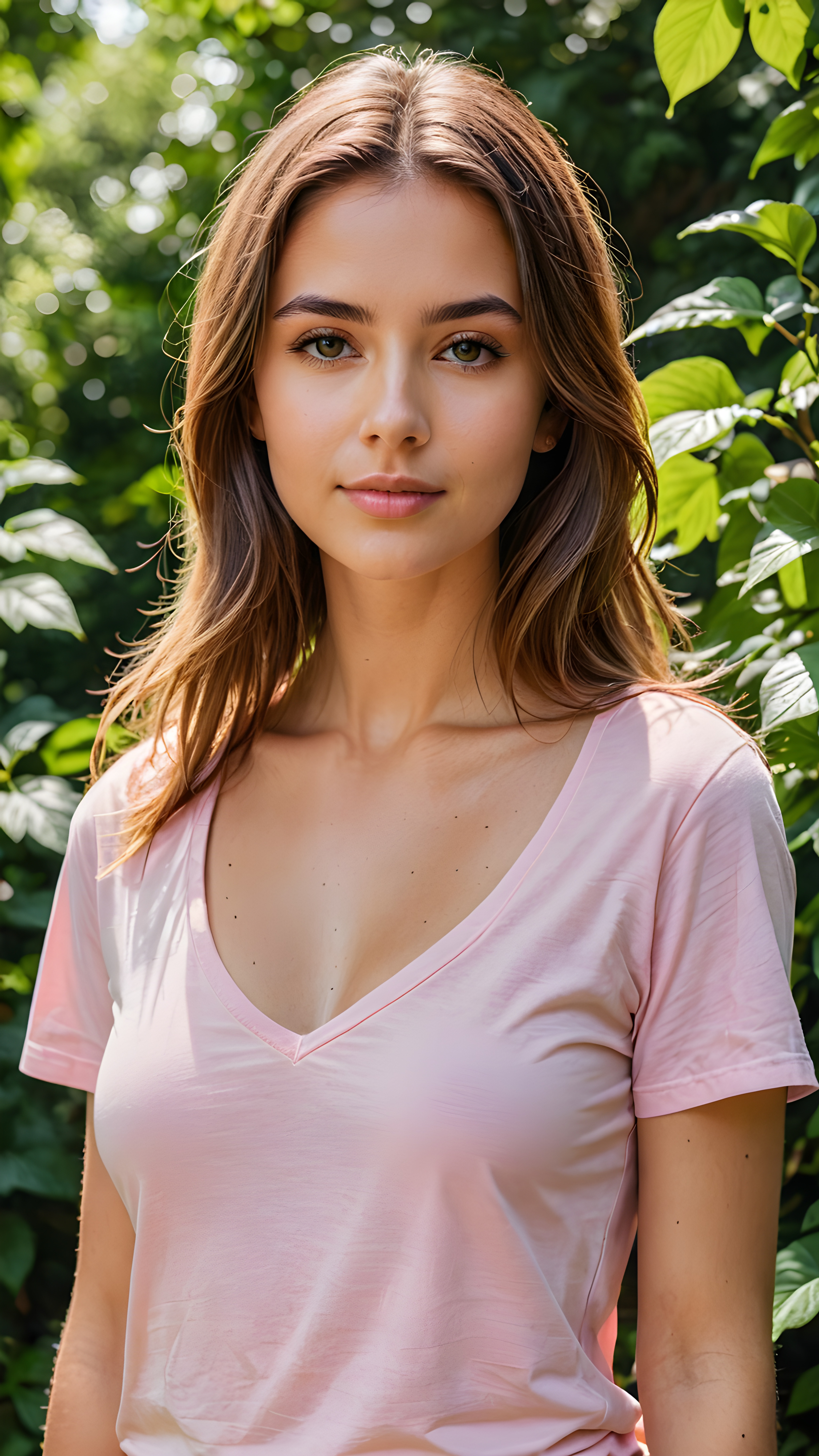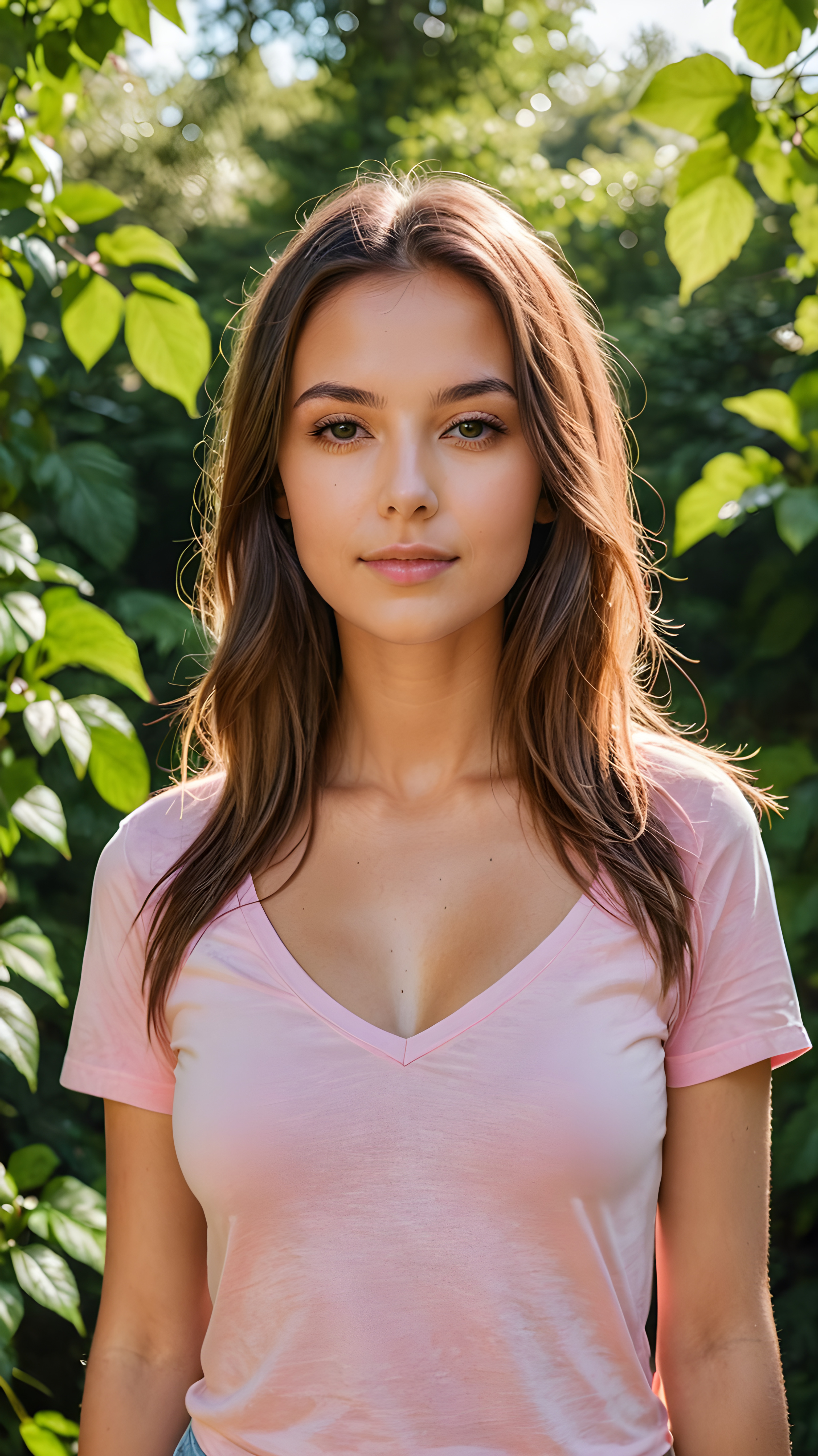 a (((beautiful young girl))), with long, flowing straight hair, against a backdrop of (summery green leaves and a sunny backdrop), ((she wears a short cropped plain pink t-shirt with deep v-neck))