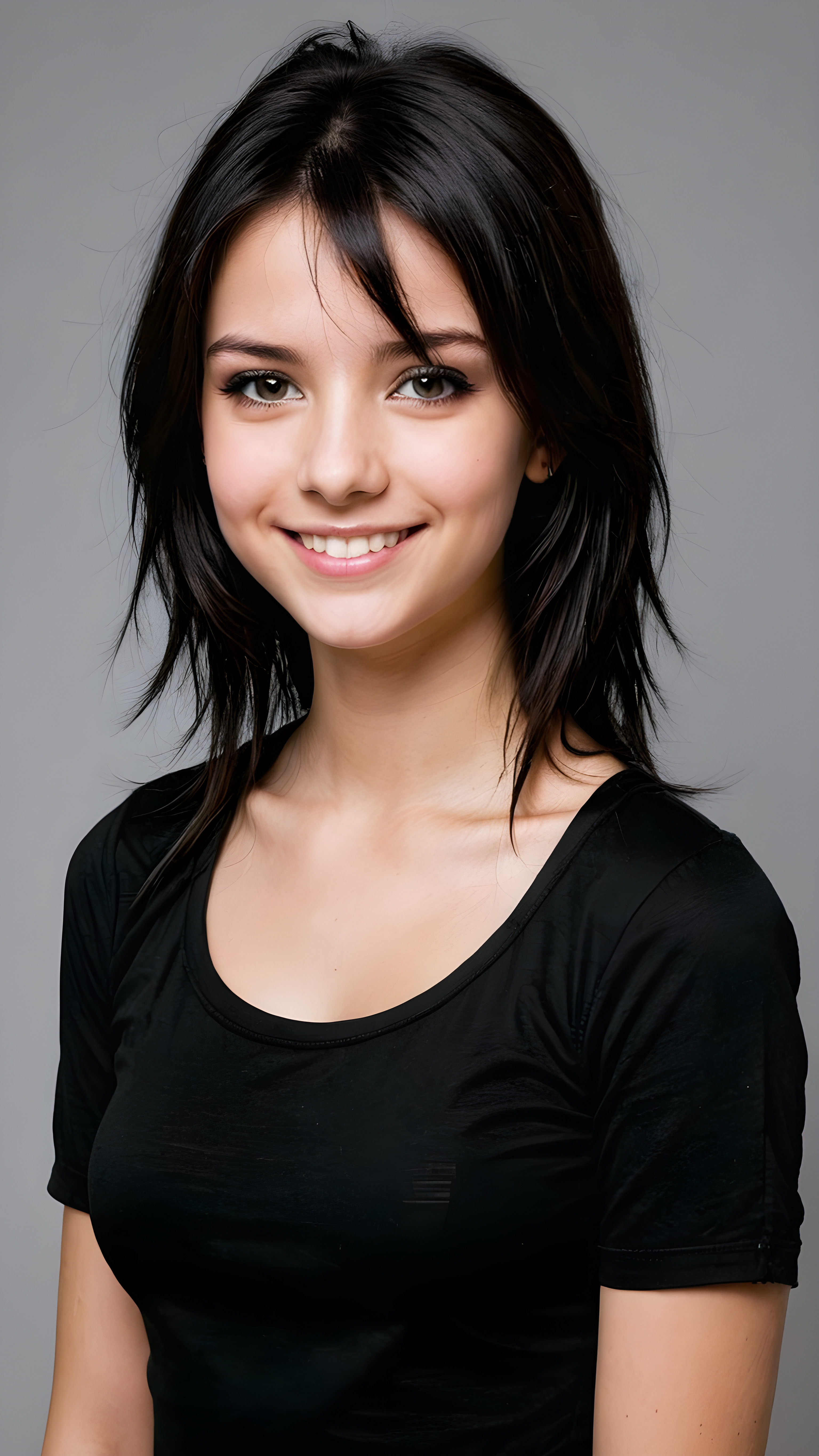 a young teen babe, dark hair, smile, in emo style, plain dark dressed
