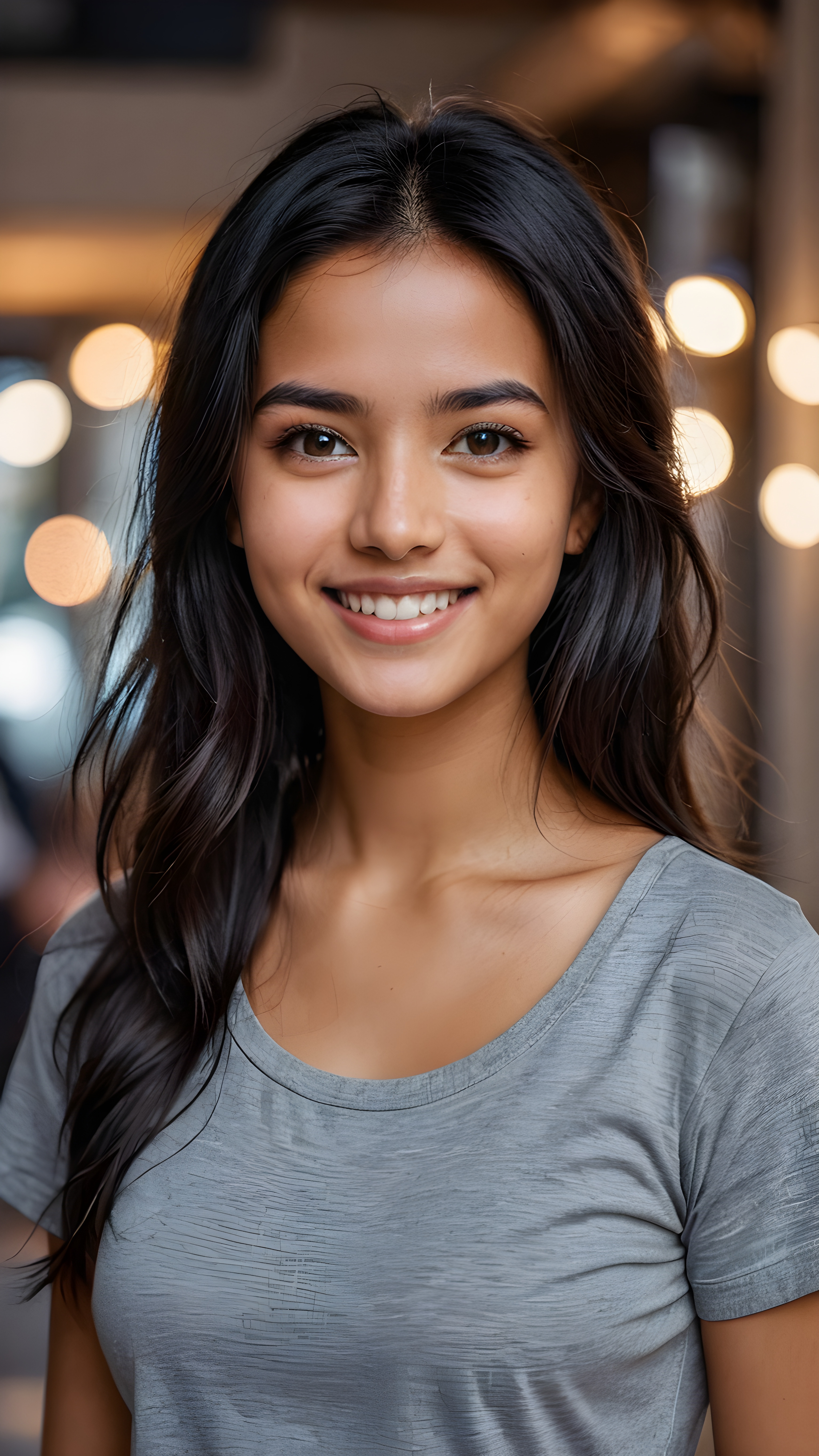 perfect portrait, very cute young Exotic girl, grey t-shirt, smile, detailed black straight hair, brown eyes, perfect curved body
