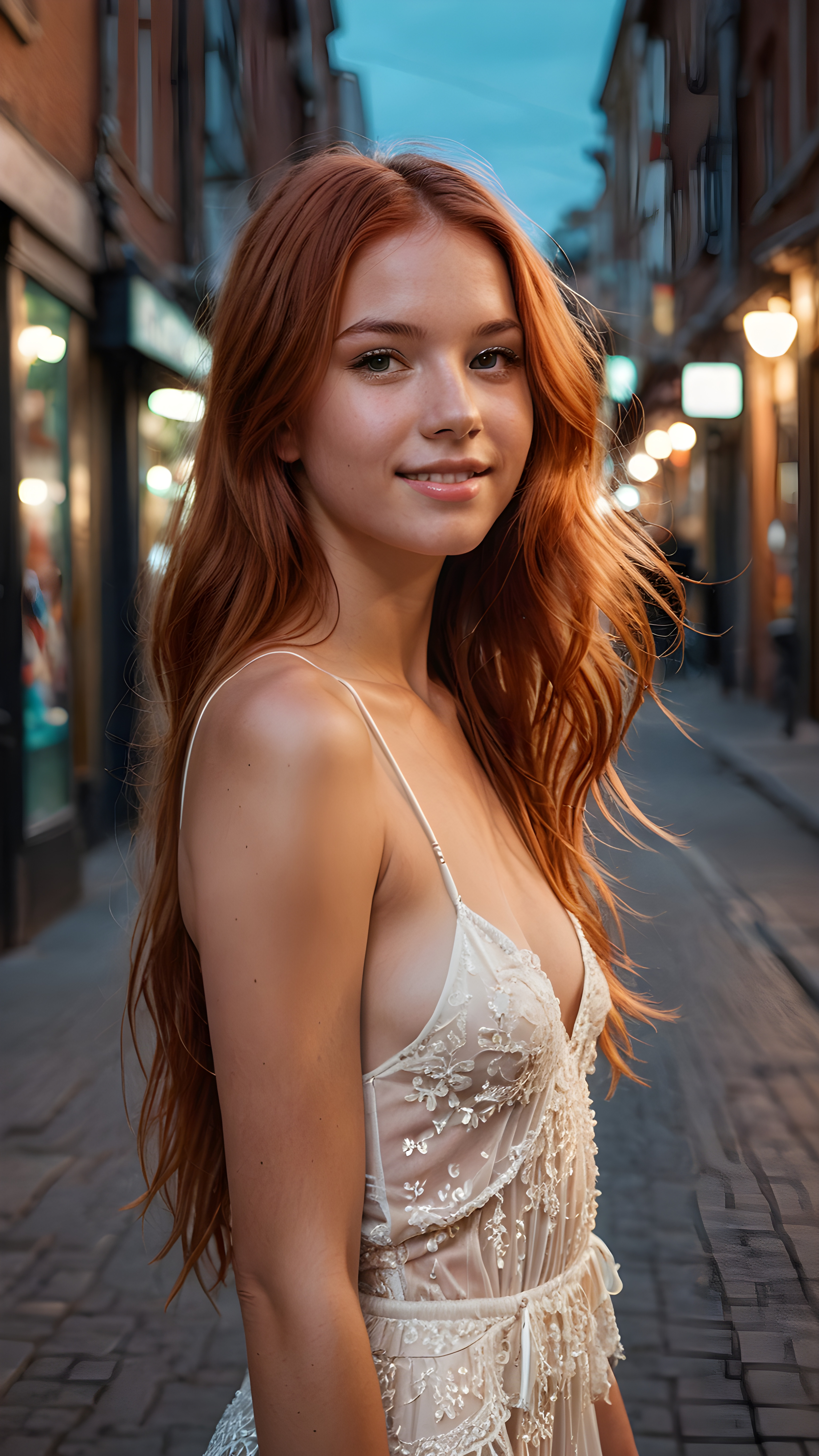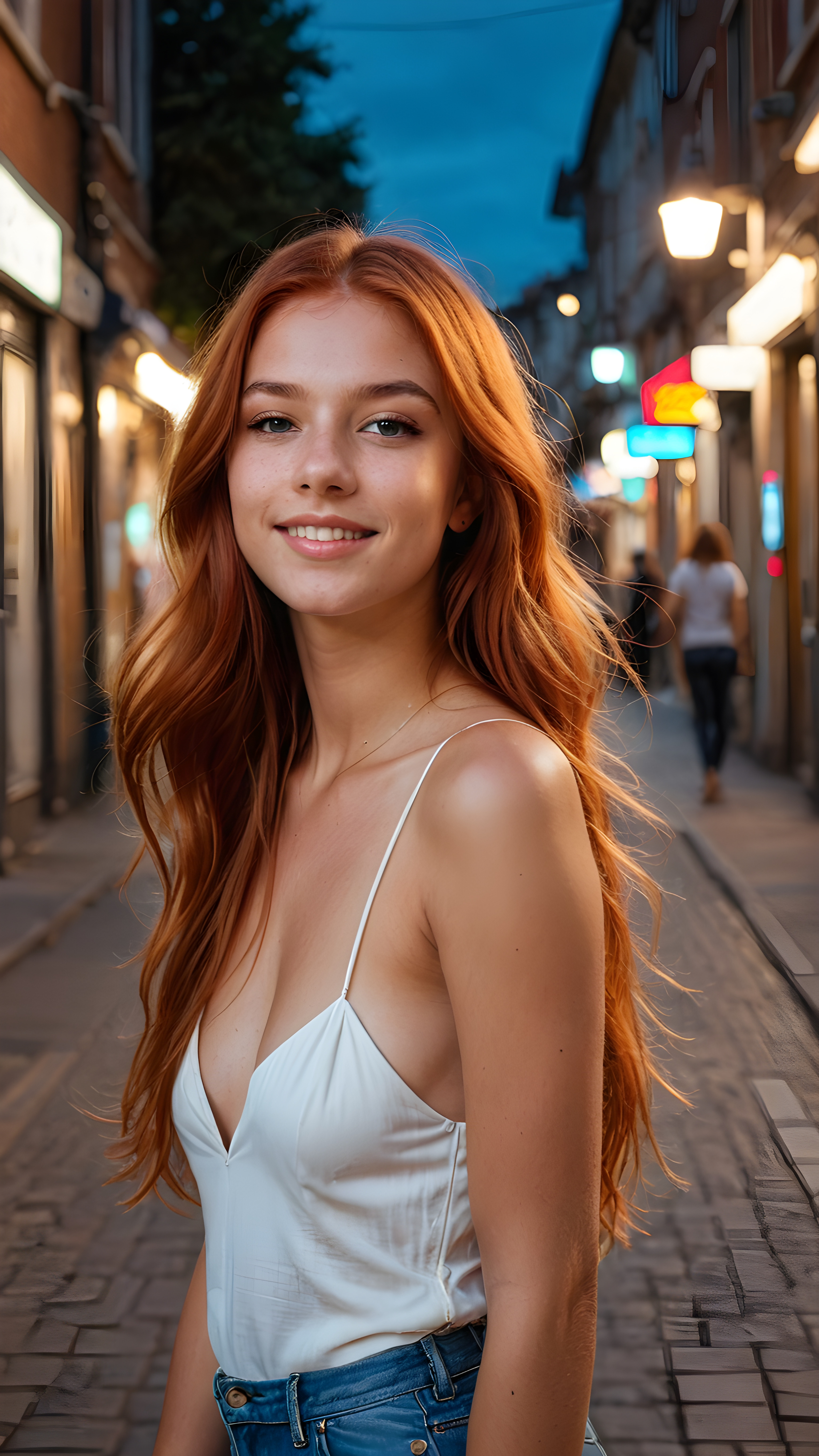 (((realistic))) (((detailed))) (((full body shot))) of a (((beautiful))) 15 year old (((pretty girl))) with ((very long)) ((straight)) ((untamed)) jet red hair (((barely there))) ((subtle)) ((weak light)) ((illuminates a little)) ((not tanned)) ((delicate)) skin (((side view))) ((head tilted)) ((looking up)) (((playful))) ((smiling)) (((seductive))) ((sultry)) ((trendy)) ((on a street))