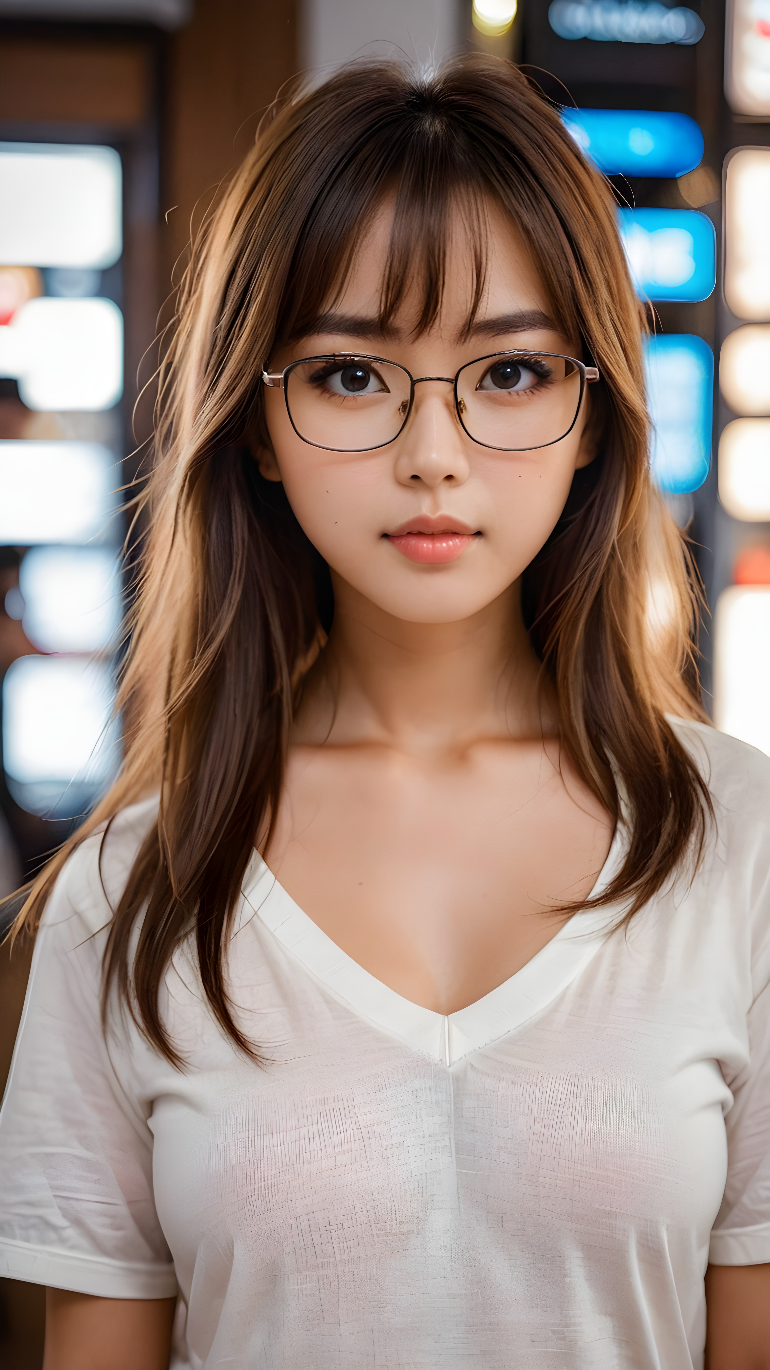a beautiful masterpiece photo, from a beautiful young busty pretty Japanese girl, with brown shiny long straight soft hair, bangs, and very large luminous eyes, wearing glasses, (a white short plain t-shirt with deep v-neck), beautiful detailed lips, pretty face