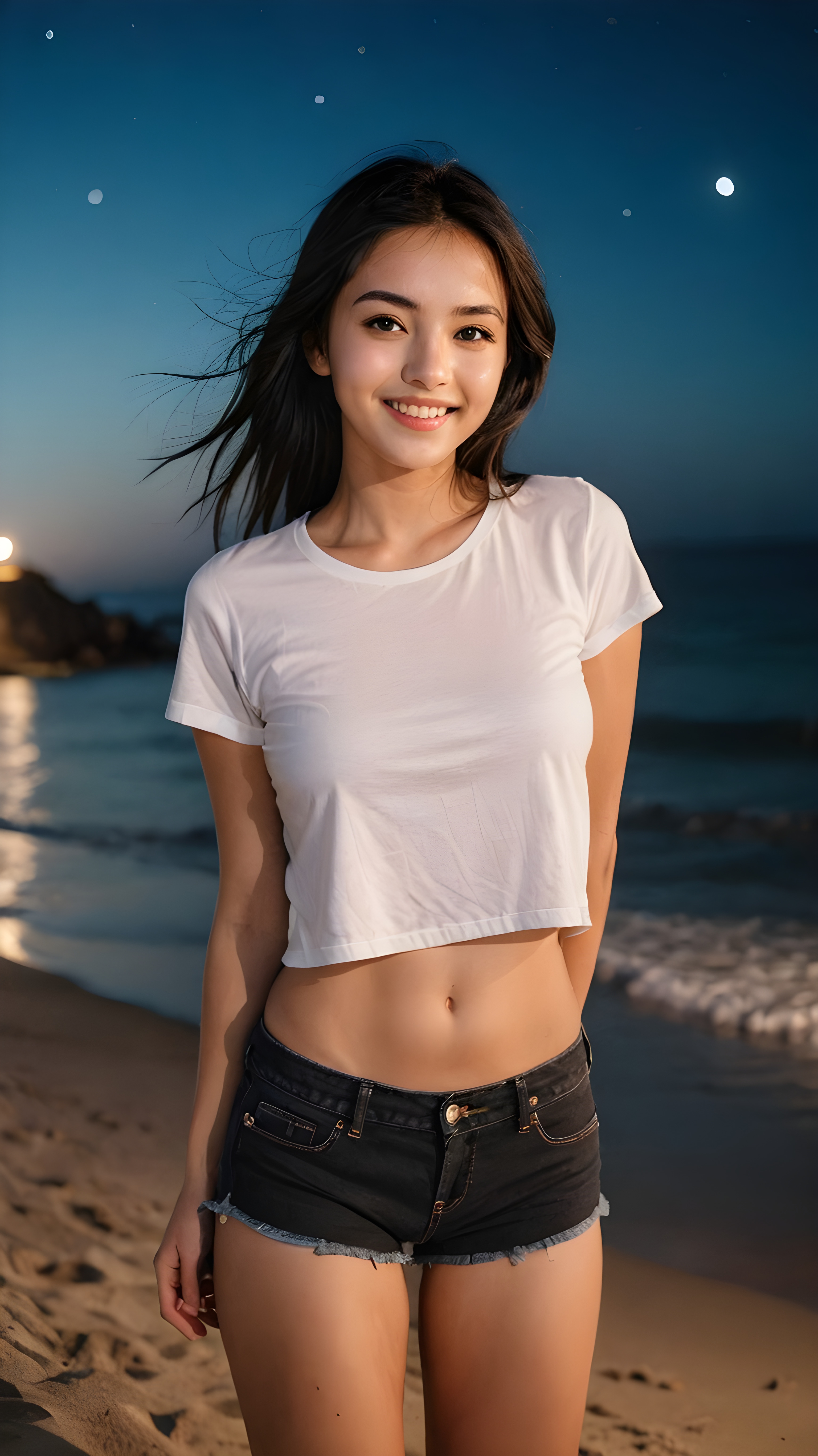 very detailed an realistic photo from a cute girl in a plain white short t-shirt and shorts, she is very happy, you can see her navel, long straight black hair, detailed face, ((against a beach backdrop by night))