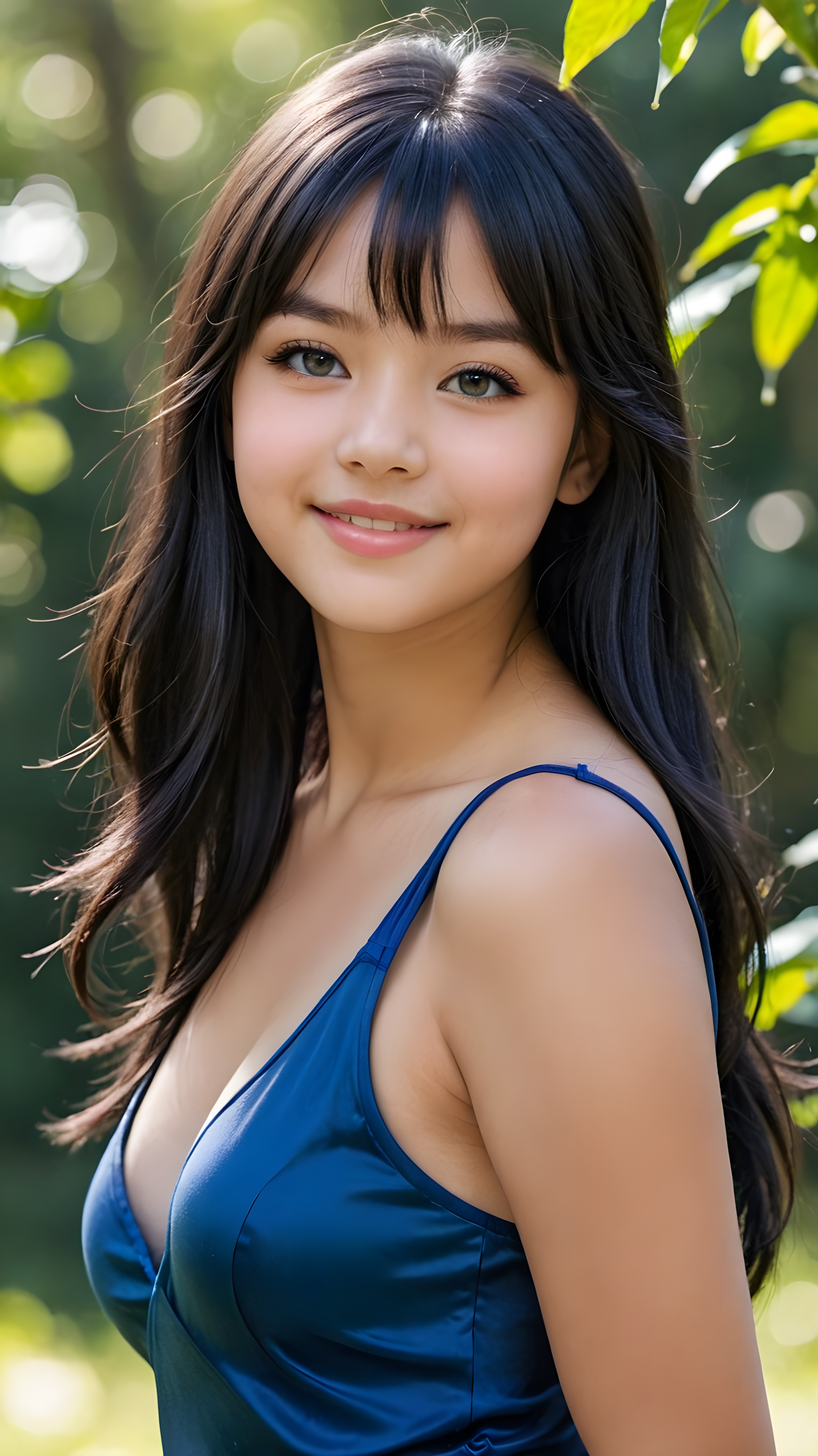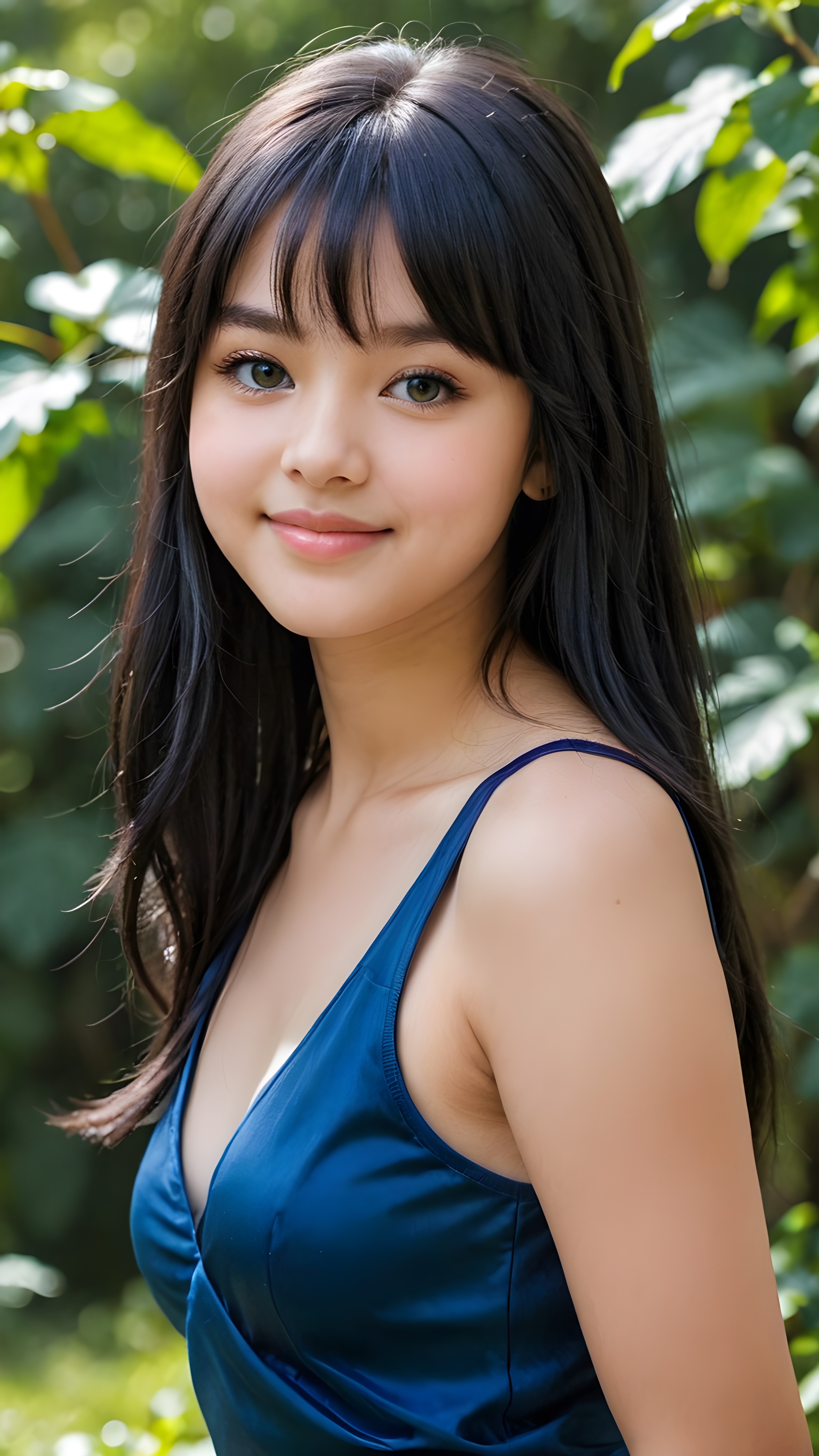 a portrait of a young 13 years old chubby girl with ((silky smooth, straight long dark blue obsidian soft detailed hair, bangs)). Her very long hair falls over her shoulders and covers her upper body. She has sparkling, light blue eyes and a charming smile white teeth, full kissable lips, ((she wears a tight, form-fitting short violet empty tank top with deep v-neck)), all against a sunny green backdrop