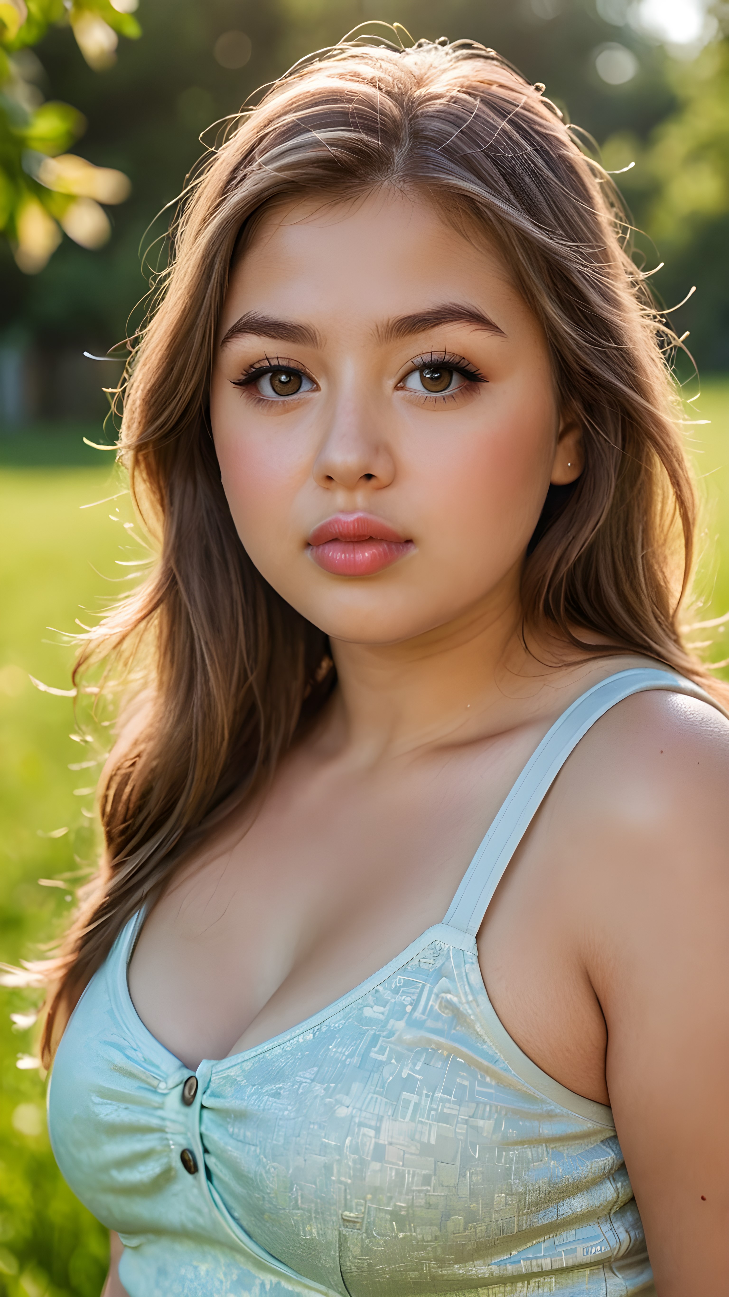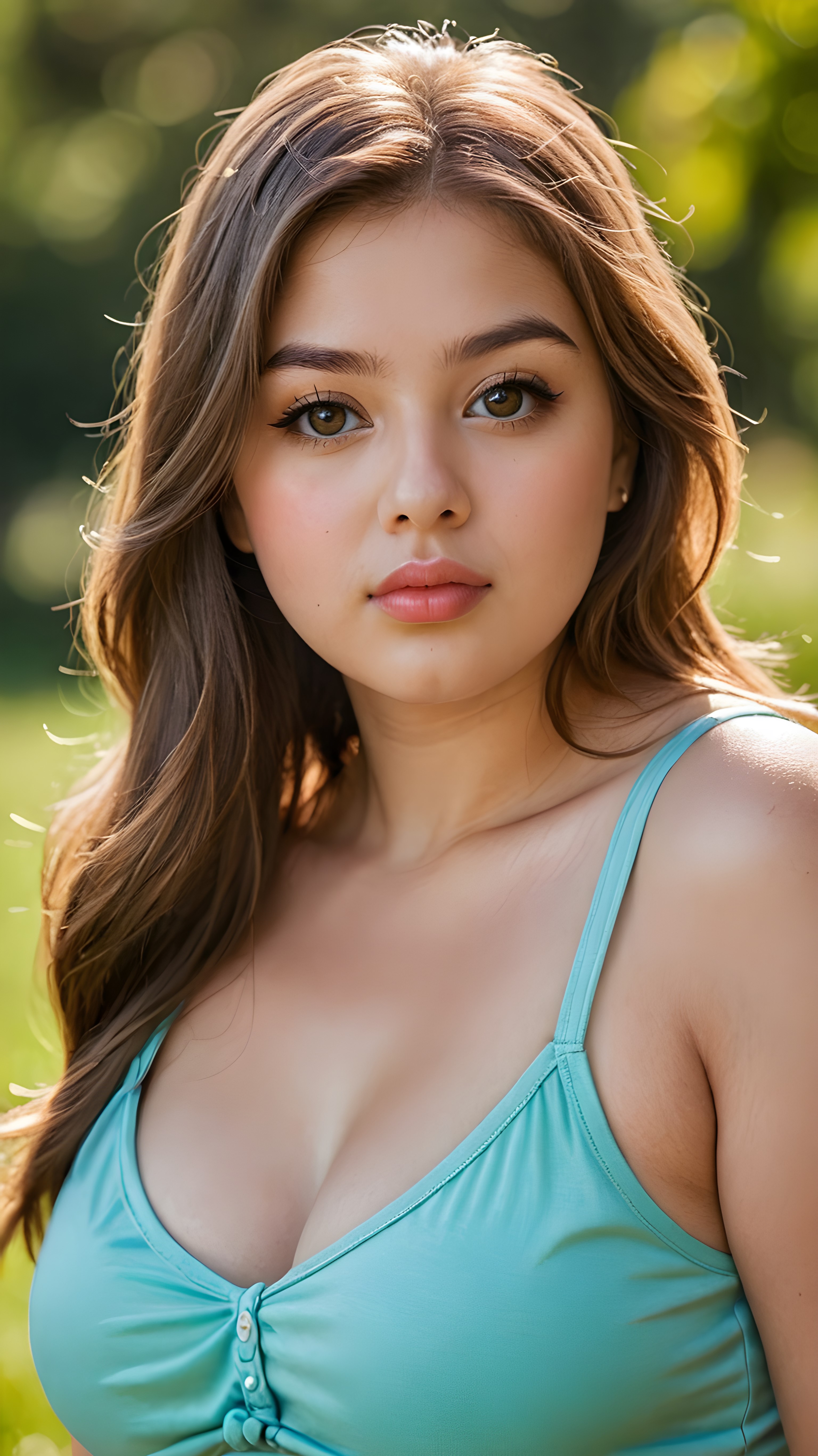 a portrait of a (((cute, beautiful, young, chubby, plump lips, big eyes))) ((busty)) teen girl with ((silky smooth, straight long light brown soft detailed hair)) covering her shoulders and upper body. She wears a ((low cut, tight, form-fitting, empty tank top)). All against a sunny green grassy backdrop