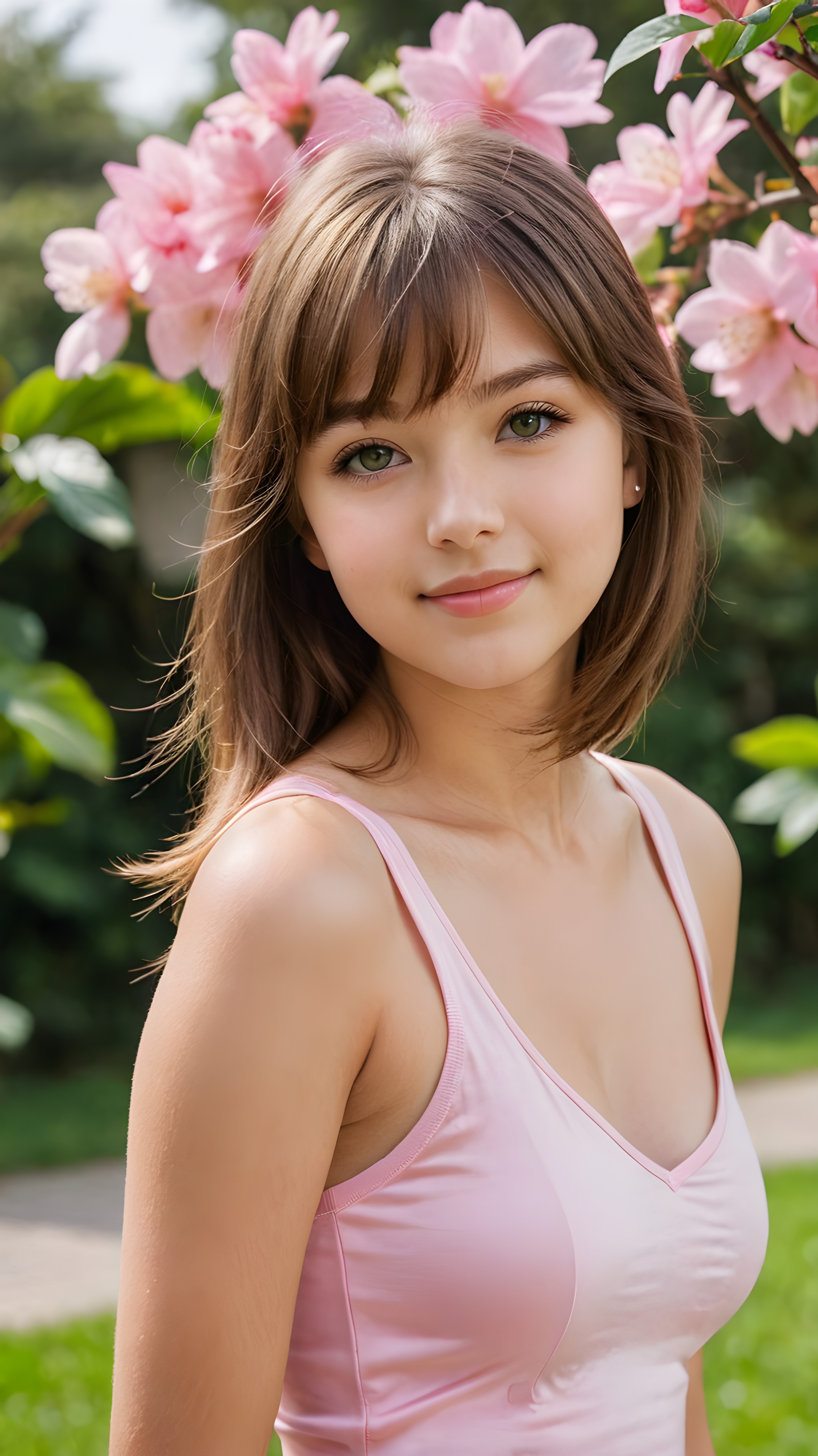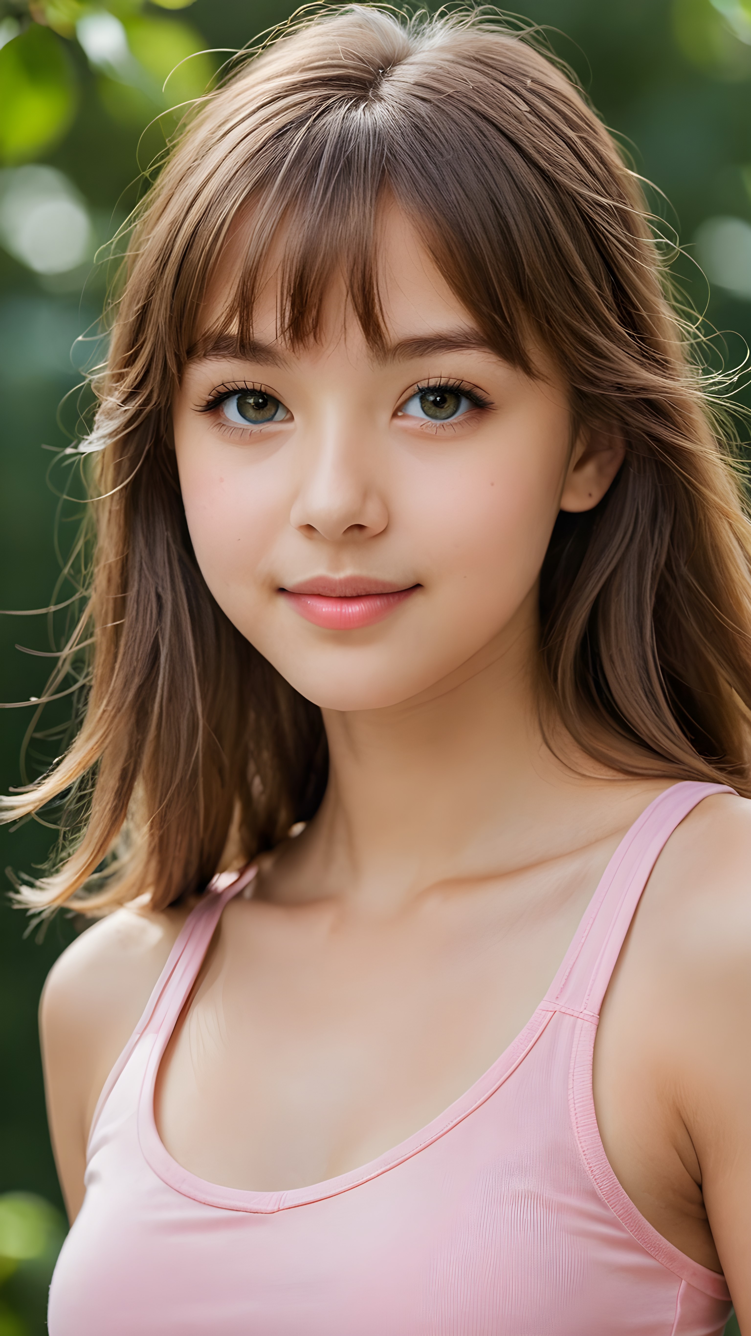 ((photography, 35mm, f/22, 1/250s)) a portrait of a young 13 years old girl with ((silky smooth, straight long light brown soft detailed hair, bangs)). Her hair falls over her shoulders and covers her upper body. She has sparkling, light blue eyes and a charming smile, full kissable lips, ((she wears a tight, form-fitting short pink empty tank top with deep v-neck)), all against a sunny green backdrop