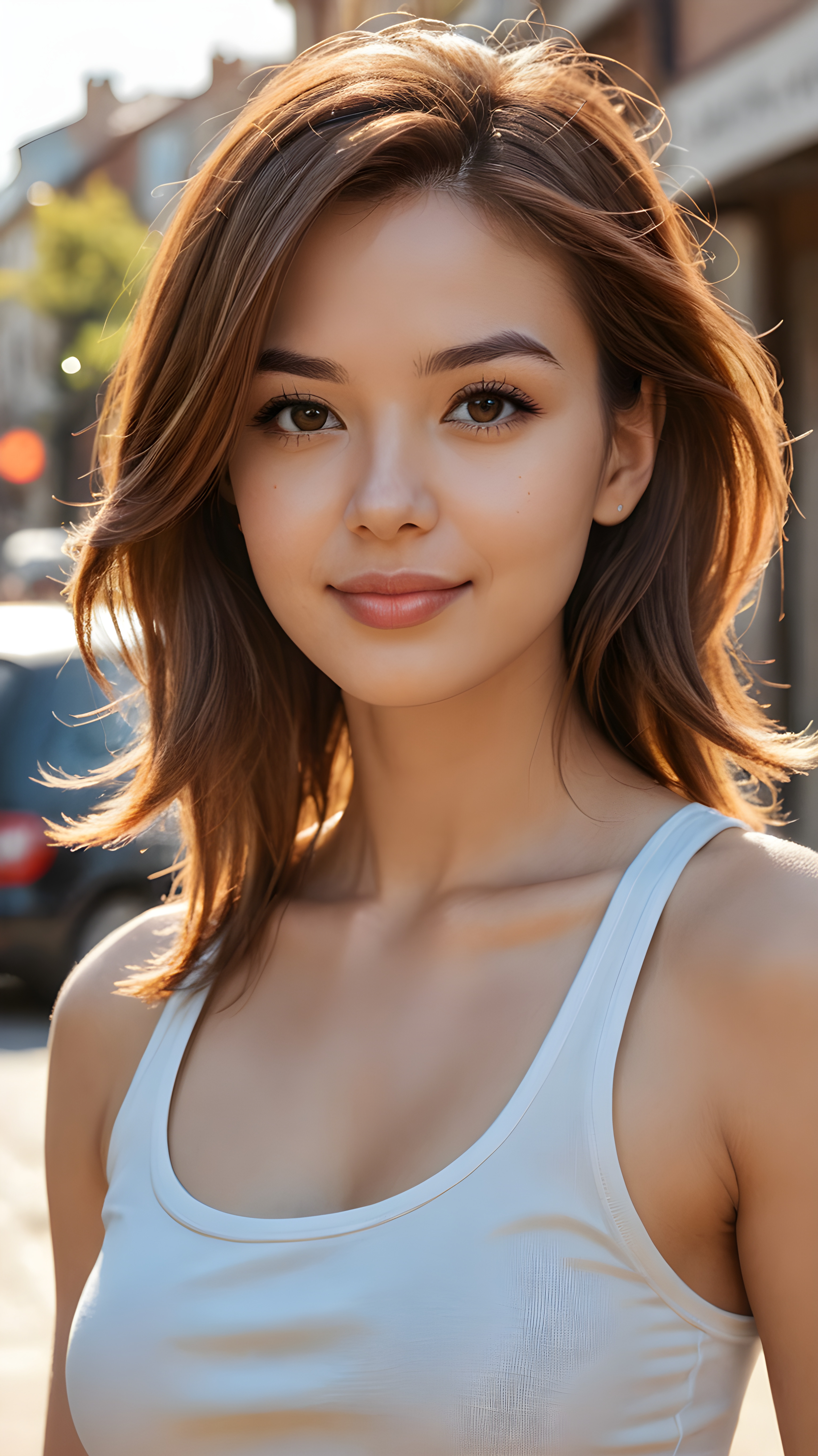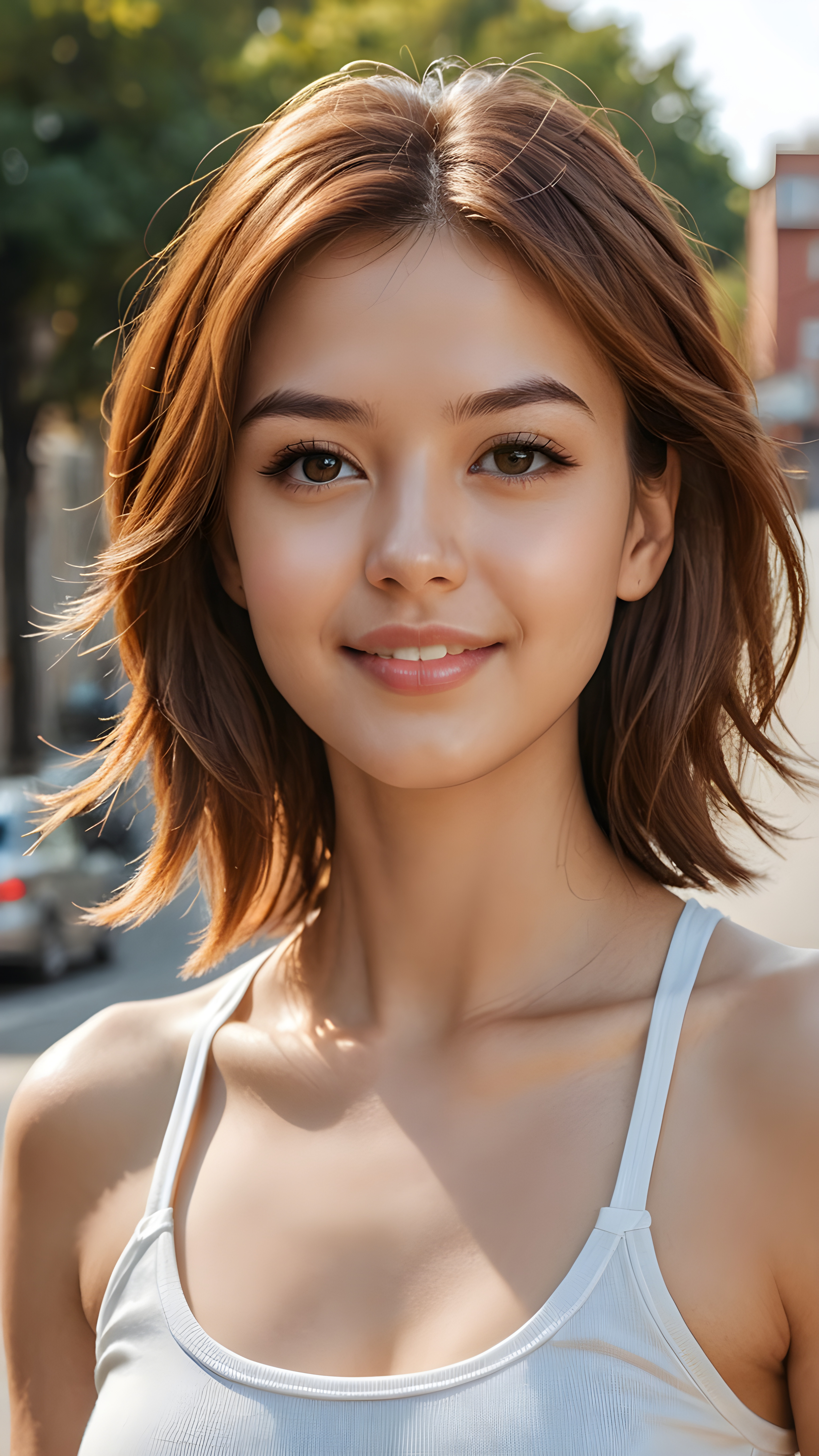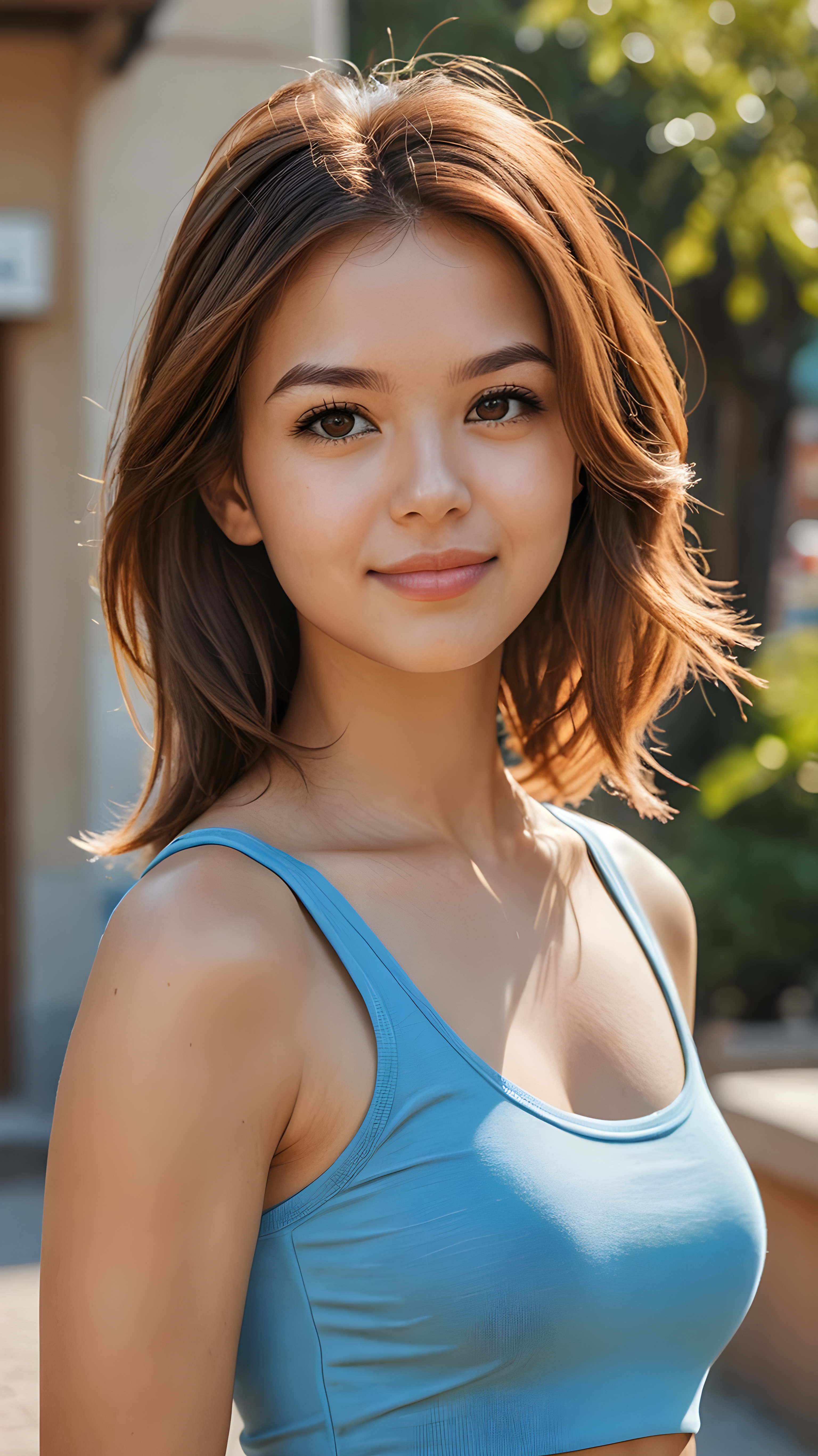 ((((realistic and detailed photo)))) ((((perfect anatomy)))), (((cute adult girl))) ((soft straight hair)) (((stunning beauty))) (((gorgeous face))) ((attractive eyes)) ((volumetric crosses)). (((super short, tight, plain cropped tank top))), (((long body))) ((curved back)), ((warm smile)) ((sunny backdrop)) (((photo realistic)))
