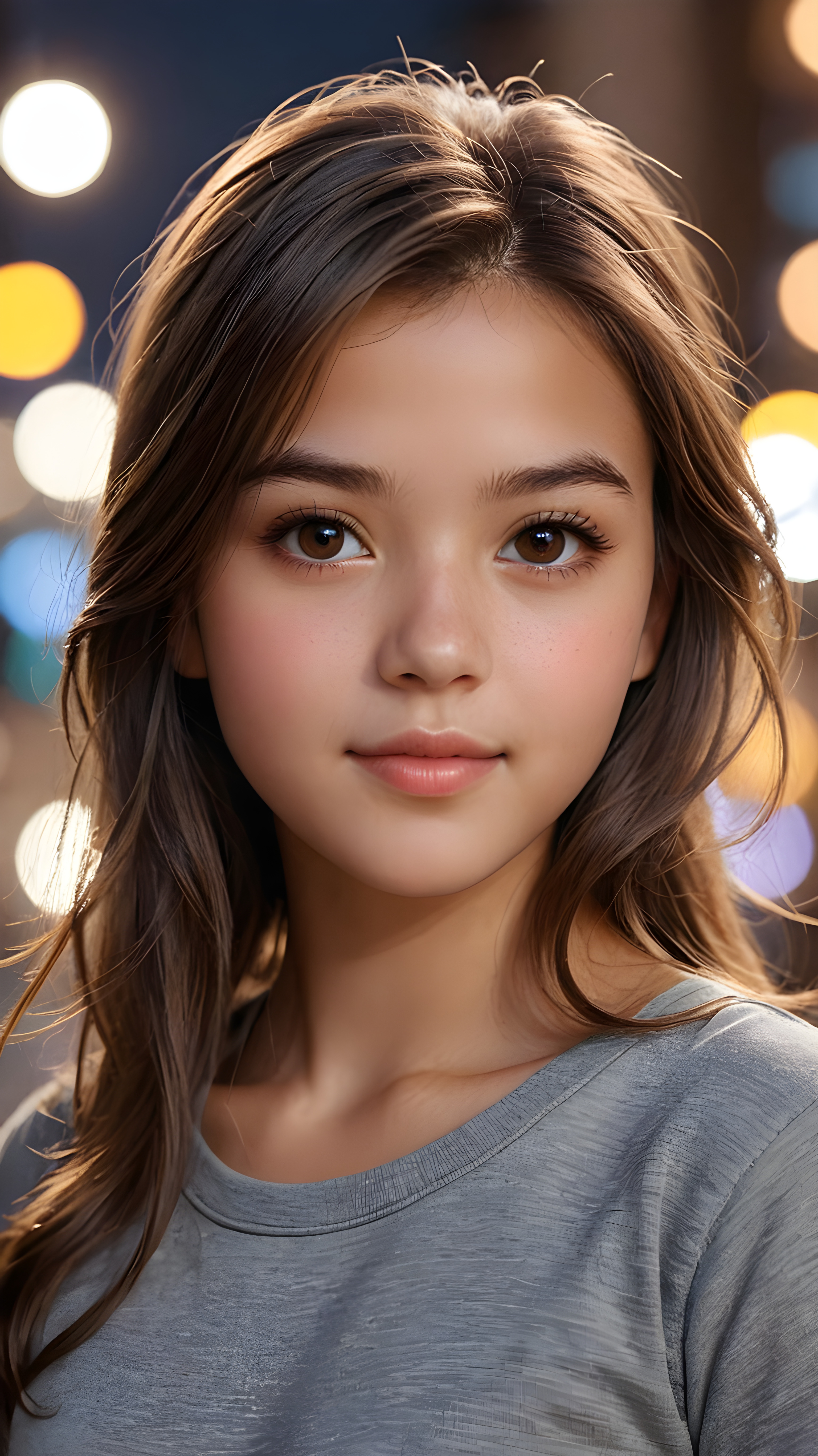 ((upper body)) of ((cute)) ((attractive)) ((gorgeous)) ((stunning)) a beautifully realistic, cinematic lights, teen girl, 13 years old, detailed long straight brown jet soft hair, realistic detailed round face, ((realistic detailed brown eye)) looks at the camera, warm smile, perfect curved, wears a super short tight (grey shirt), perfect anatomy, side perspective