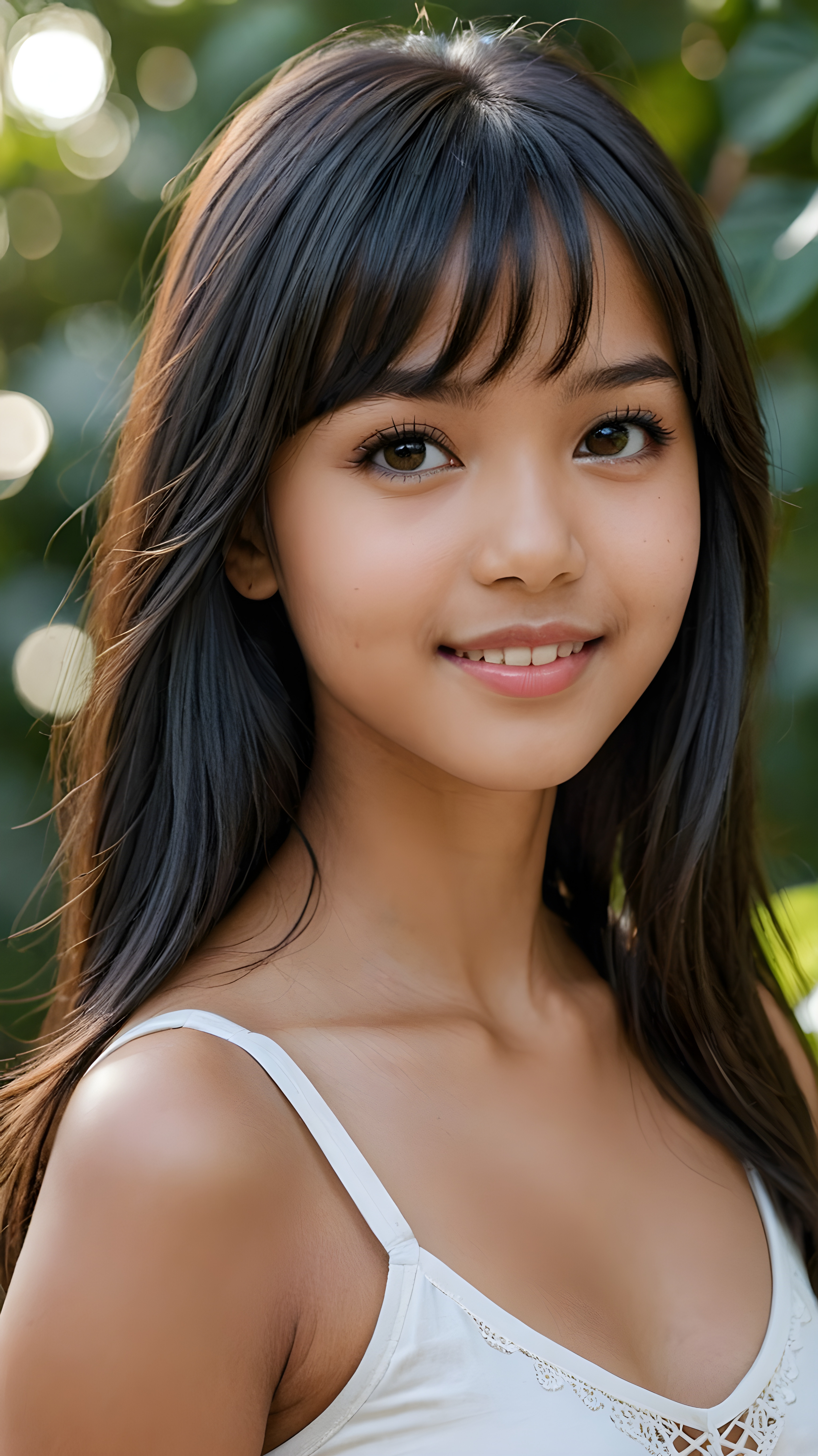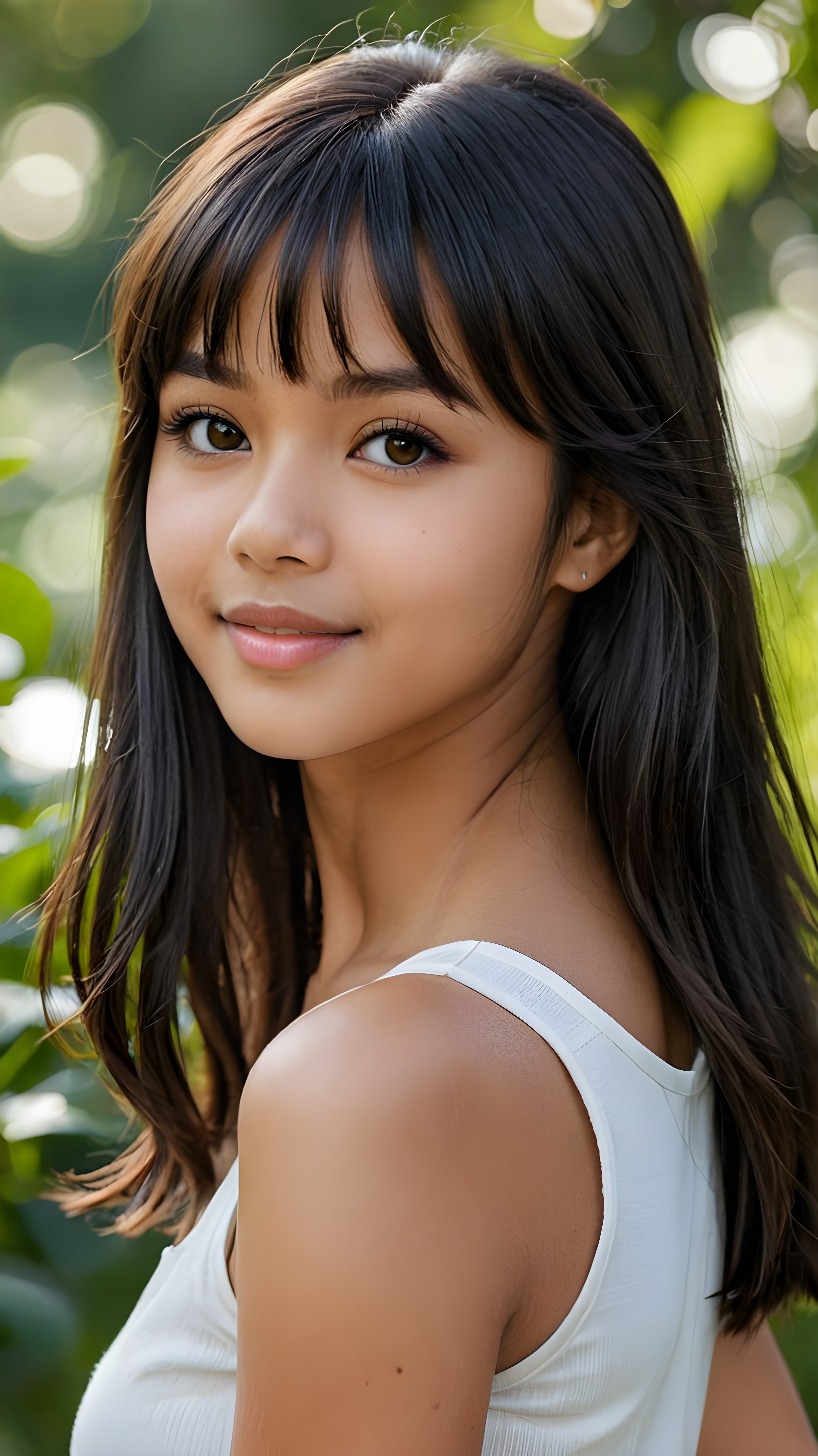visualize an exquisitely drawn (attribut profile) of a beautifully elegant young exotic brown-skinned teenage girl age 17 with long soft, straight black hair (framing delicate bangs) that frame a detailed, intricate round face with flawless, soft skin. Her lips are parted in a warm, seductive smile with perfectly aligned, round hazelnut eyes and softly downward-turning corners, all drawn with a stunningly gorgeous form, wears a white tank top