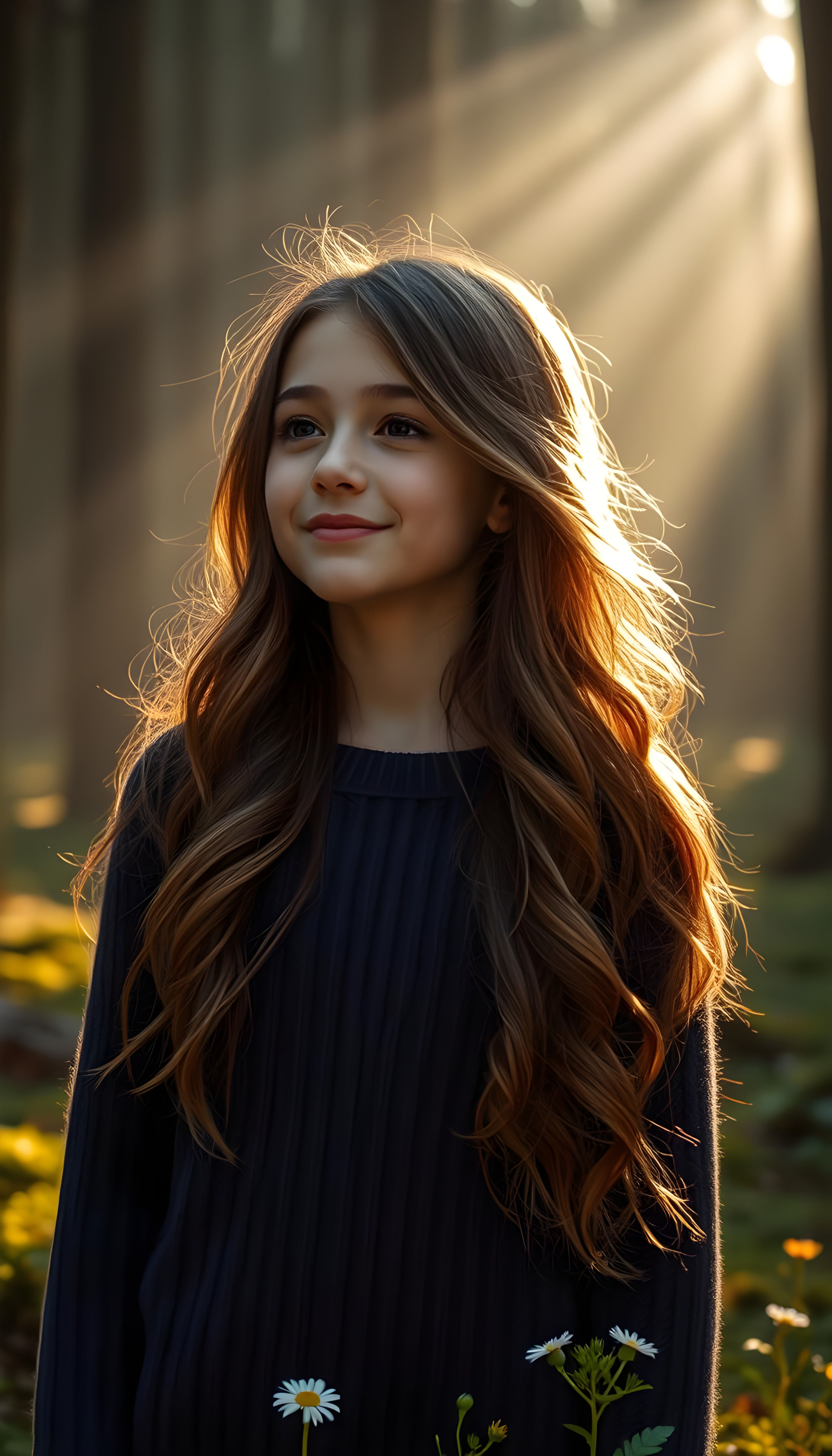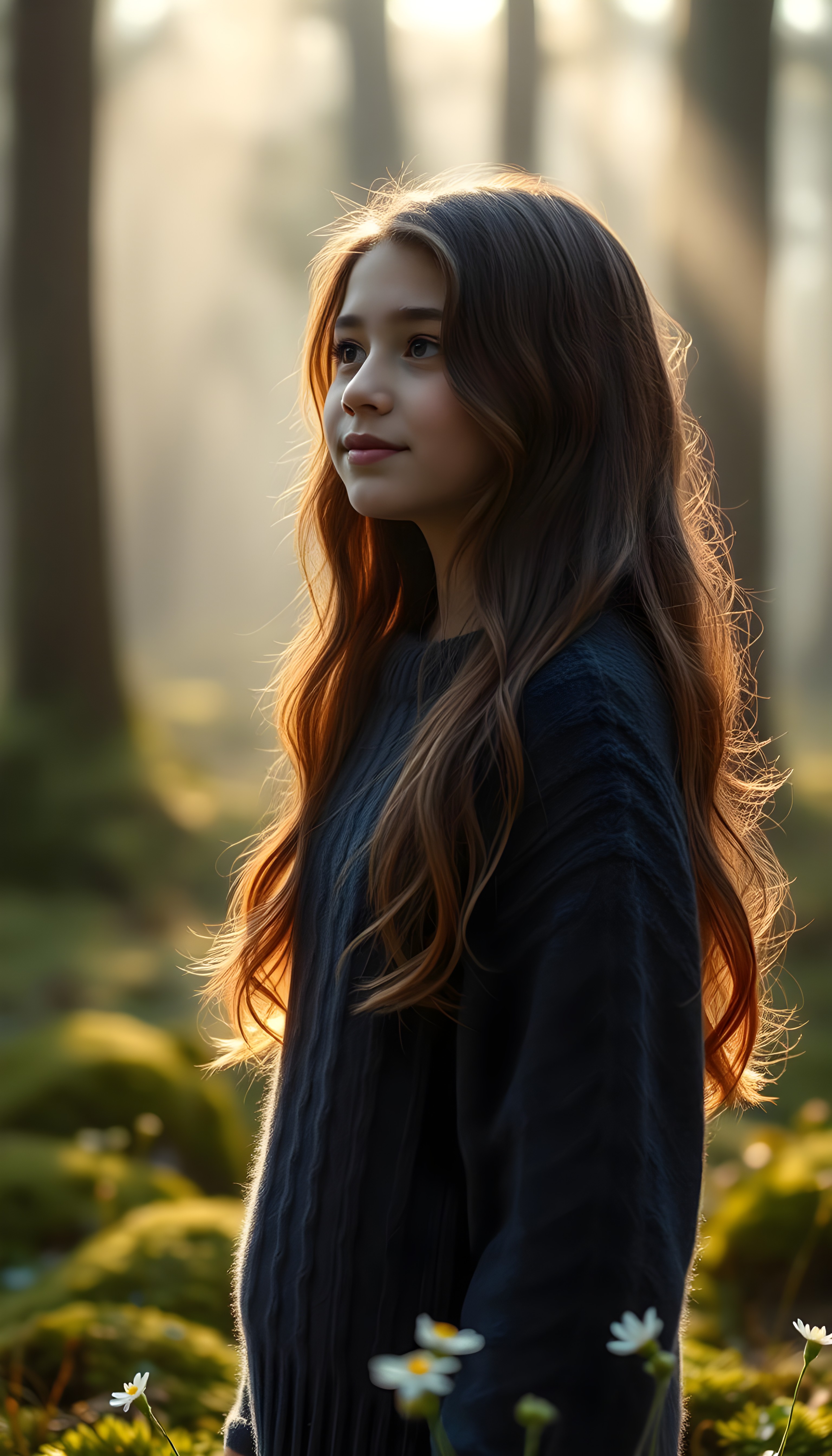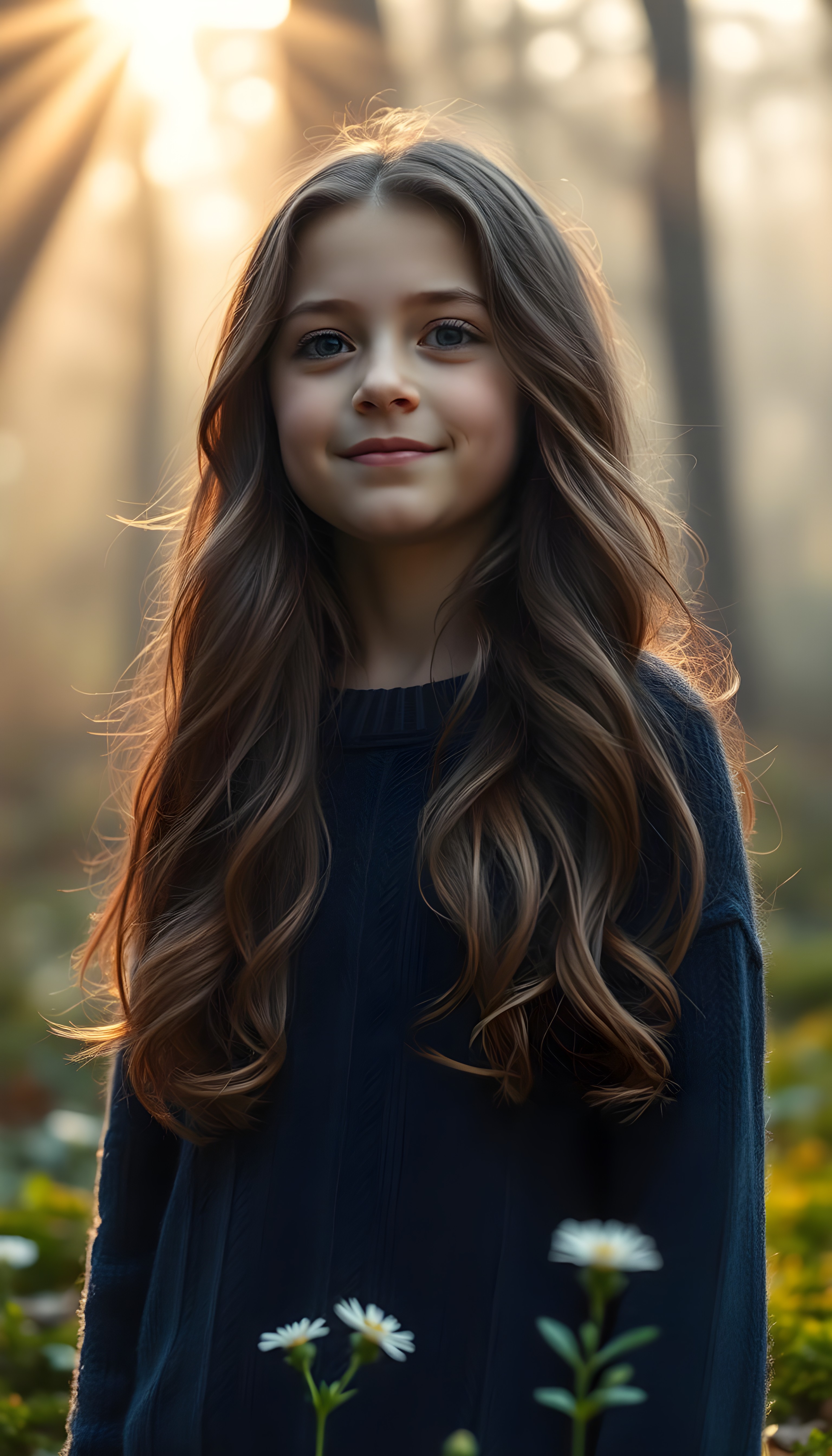 a full body shot from a young girl with long, wavy hazelnut brown hair, her hair cascading down her shoulders. Her lips are full and pink. She wears a cozy, fine wool sweater in a warm, deep navy blue, with a subtle cable knit pattern. She stands in a serene, misty forest, with rays of sunlight filtering through the trees, casting a golden glow on her face. The forest floor is covered in soft, emerald green moss, with delicate wildflowers blooming around her feet. She has a gentle smile, and a sense of peace and wonder is in her eyes, as she looks into the distance, surrounded by the tranquility of nature.