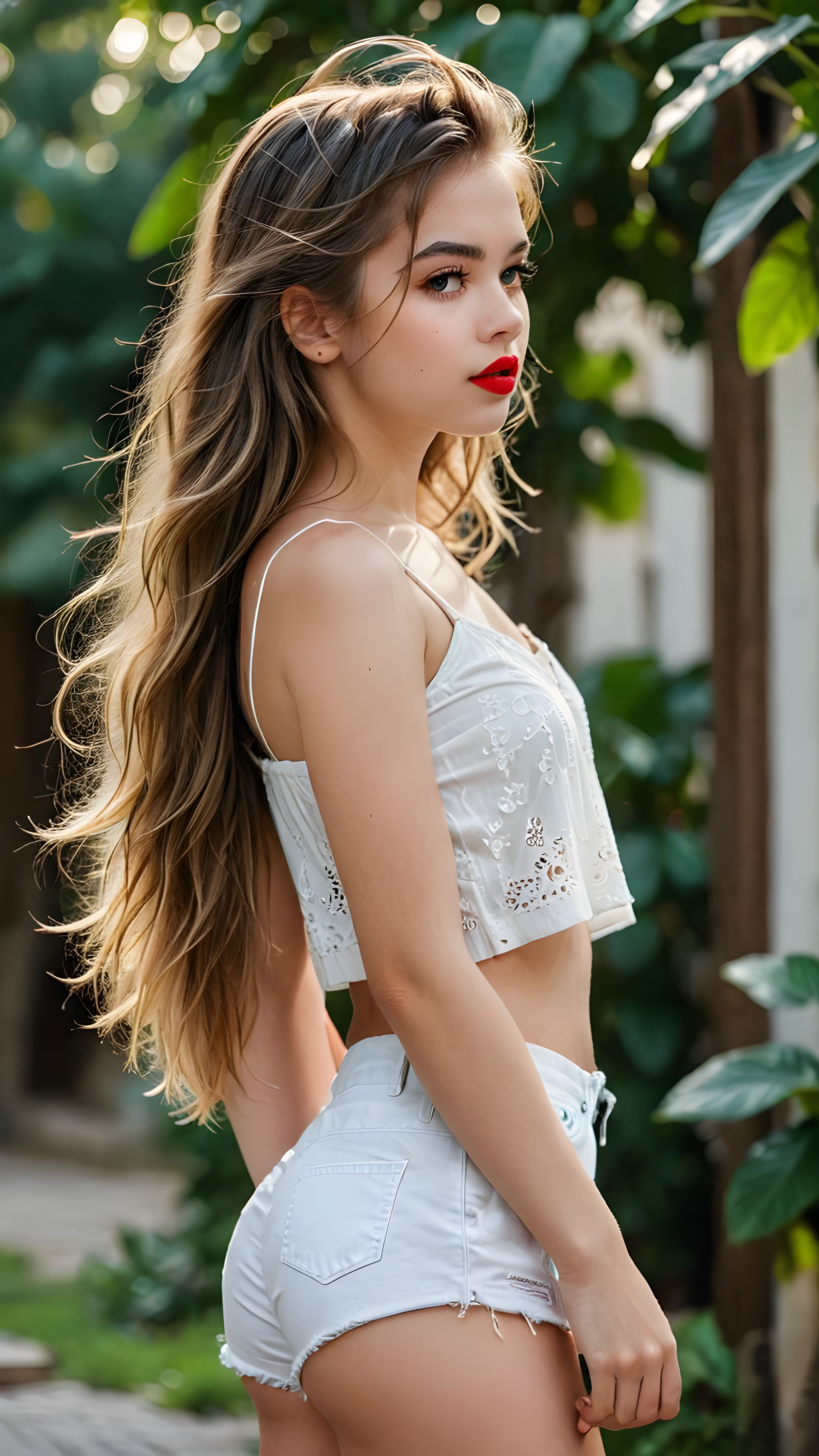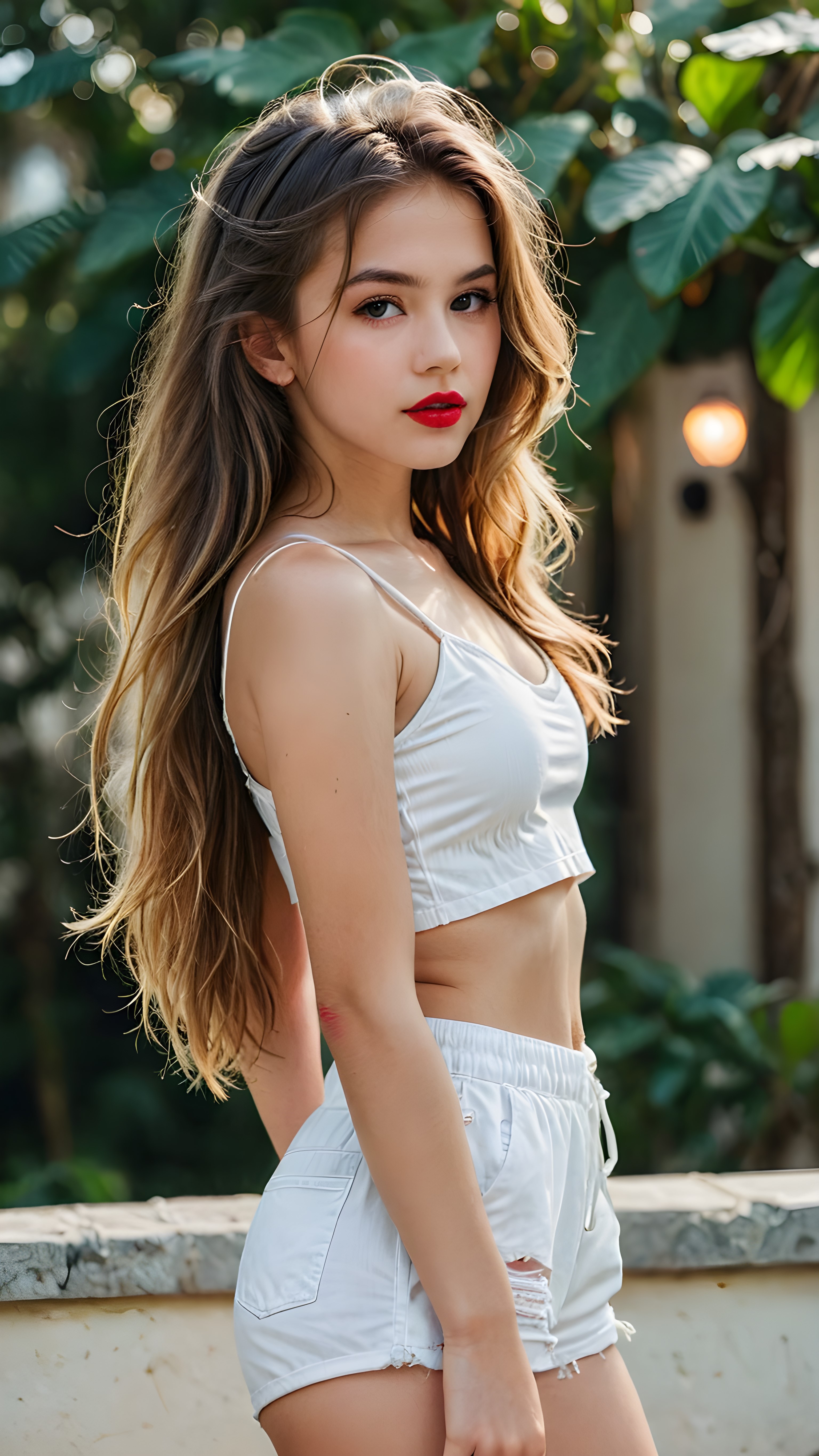 a very beautiful and detailed photo of a cute, pretty, stunning, girl model, 14 years old, ((very long and messy hair)), ((white crop top)), ((shorts)), ((red lipstick)), ((beautiful face)), ((soft body)), (((side view)))