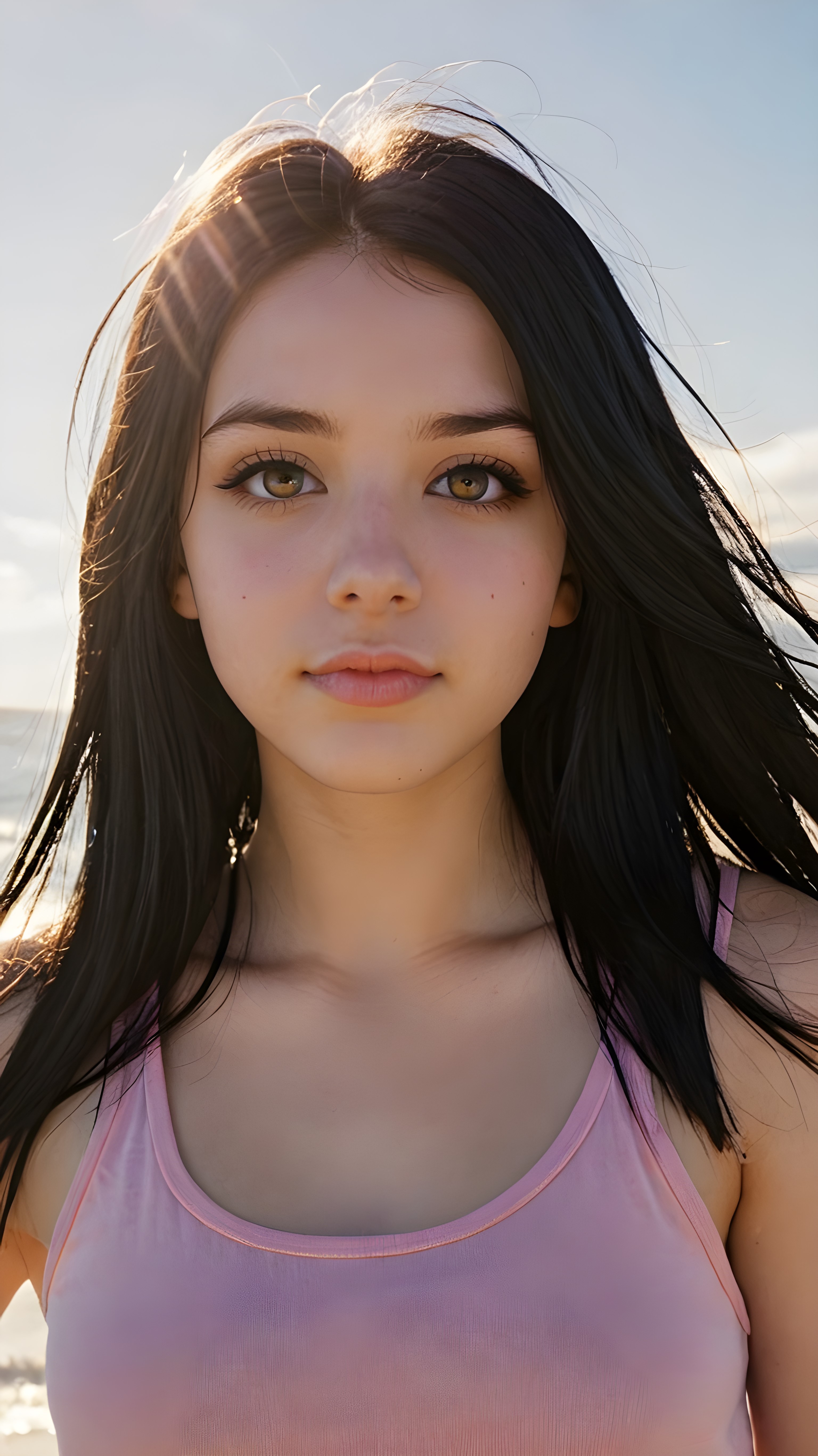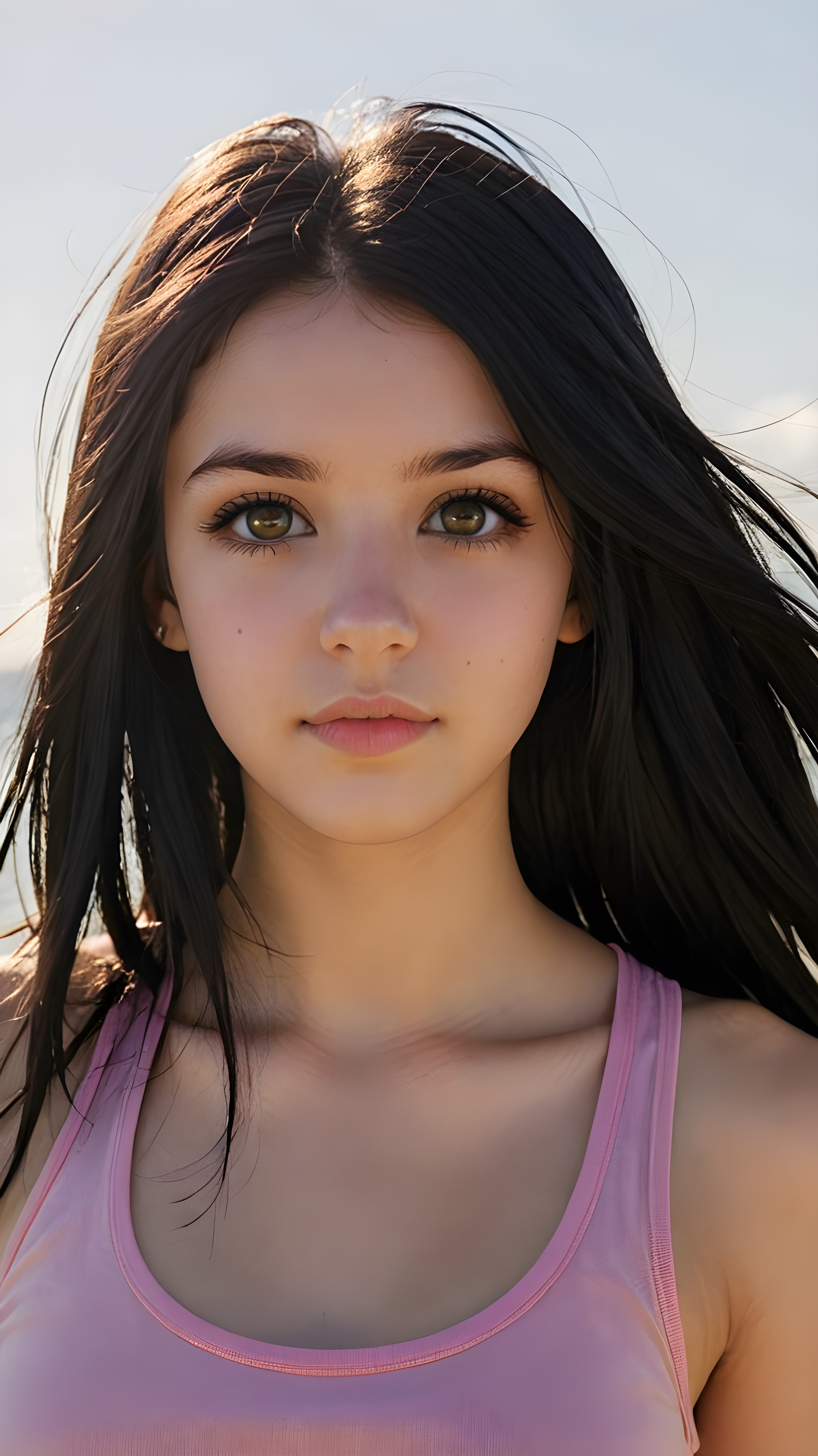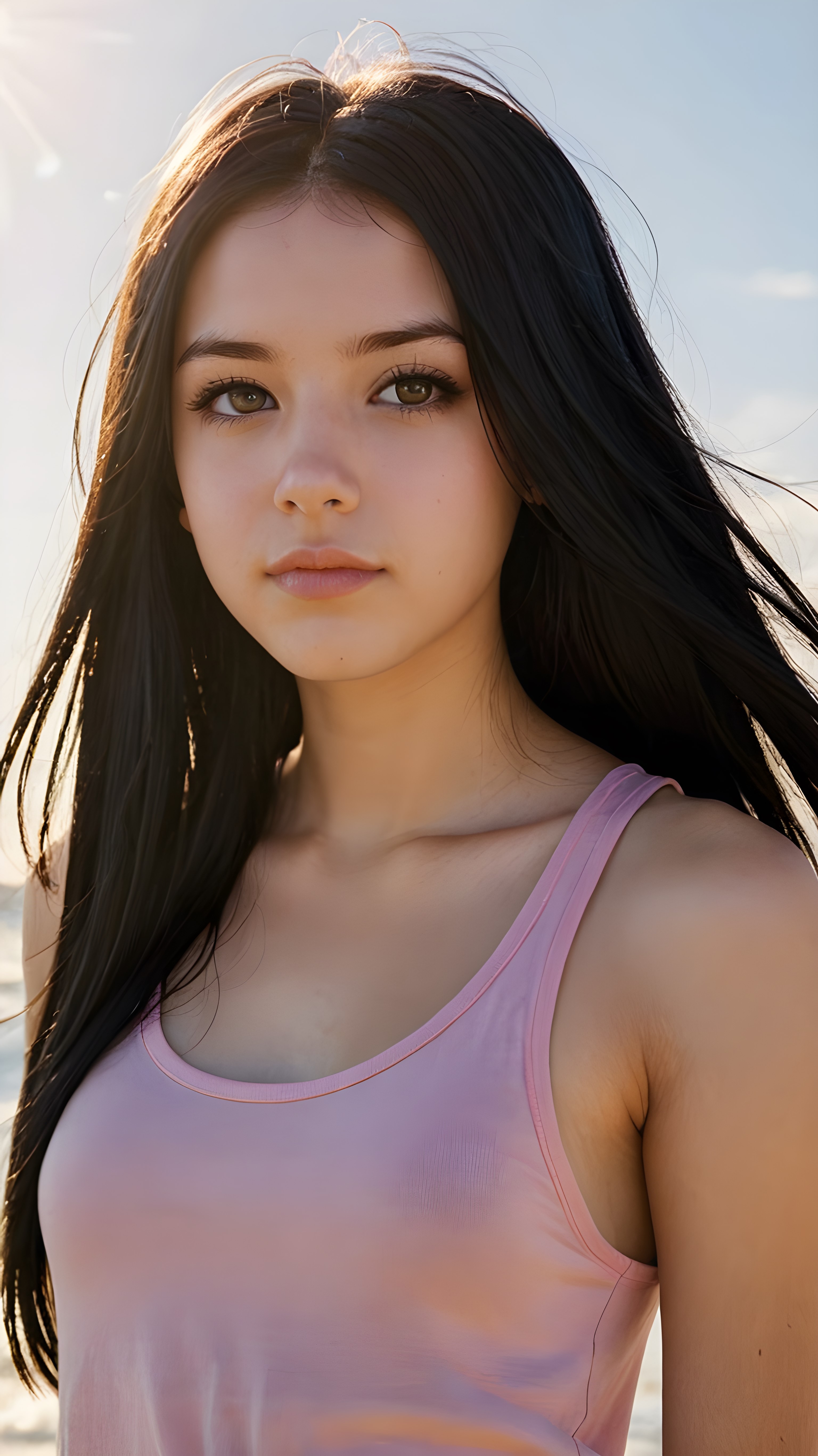 realistic and detailed portrait from a (((cute teen emo girl with long, soft black straight hair framing her face in gentle waves)) and amber eyes, full lips, ((wears a no printed short form-fitting pink tank top)), against a (((sunny backdrop))))), she is beautiful