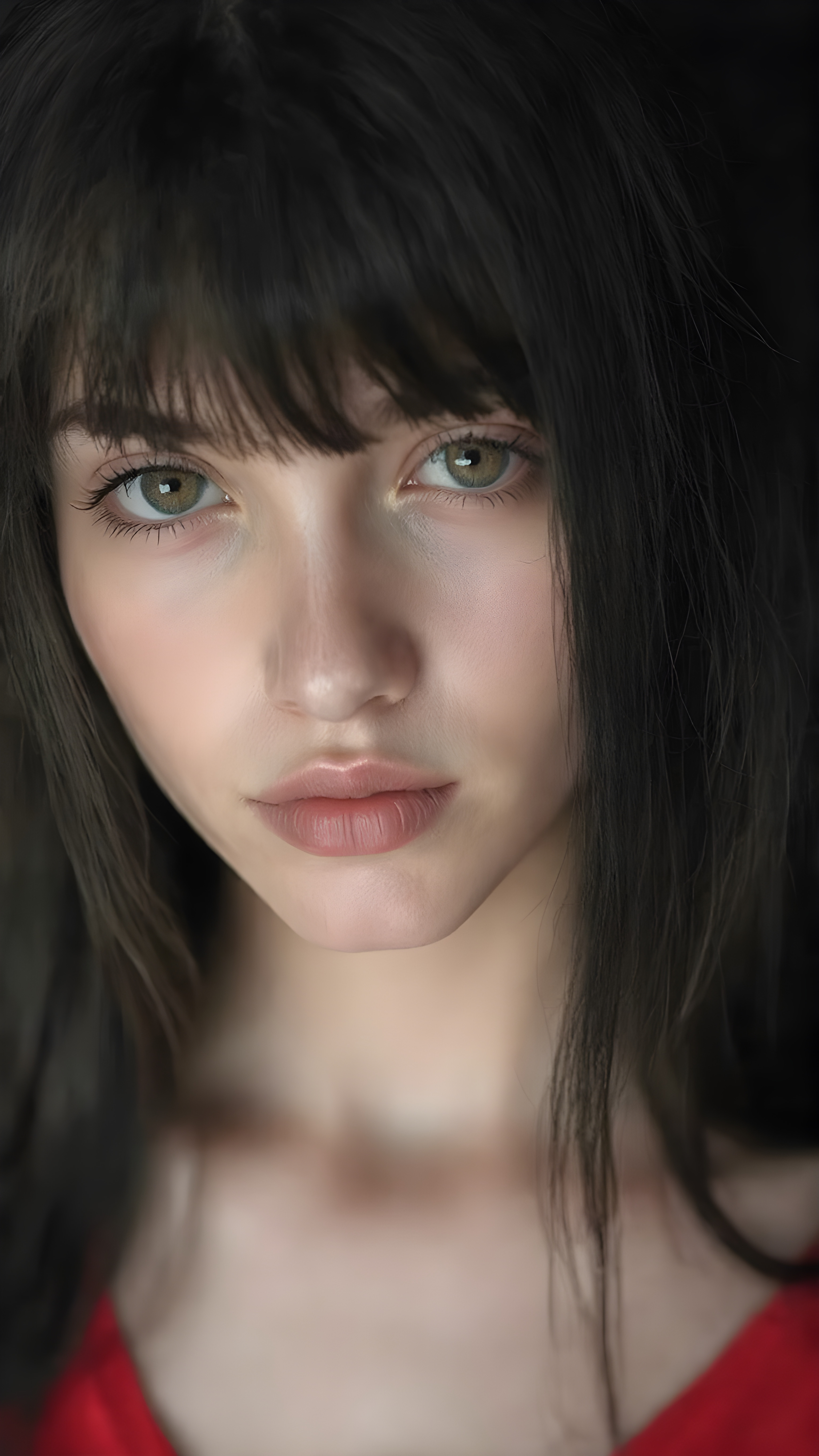 a (((professional black and white photograph))) featuring a gorgeous, young, slim, petite, and curvaceous silver skinned Emo girl with long and perfectly straight black super soft detailed hair and bangs, full lips, and with a serene expression. Her attire is a ((short cropped red tank top, deep v-neck)), the photo captures her full face, with the focus on her eyes and innocent look that complements the advanced lighting and ultra realistic skin textures that make this photo truly breathtaking, ((only her tank top is in color))