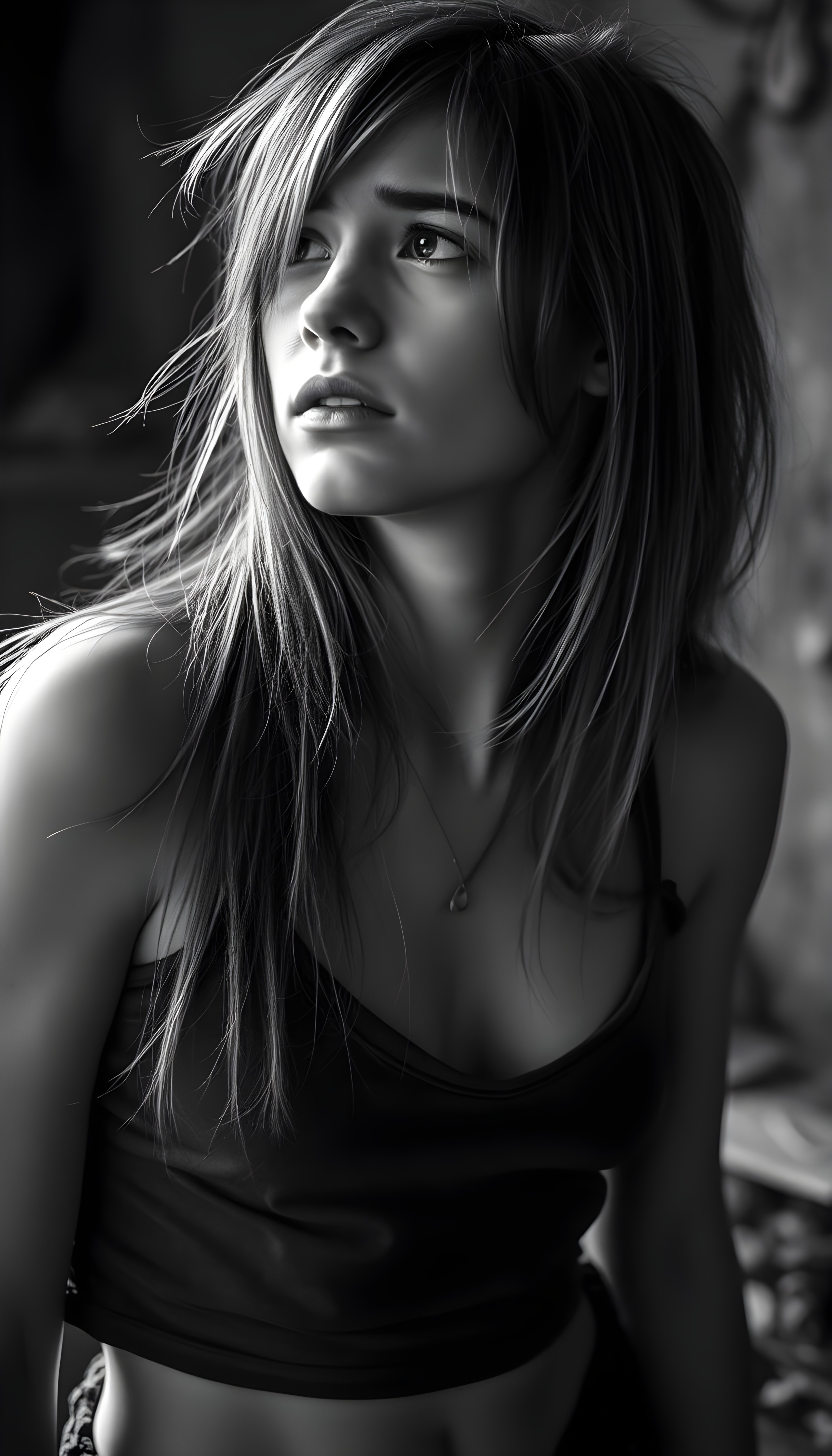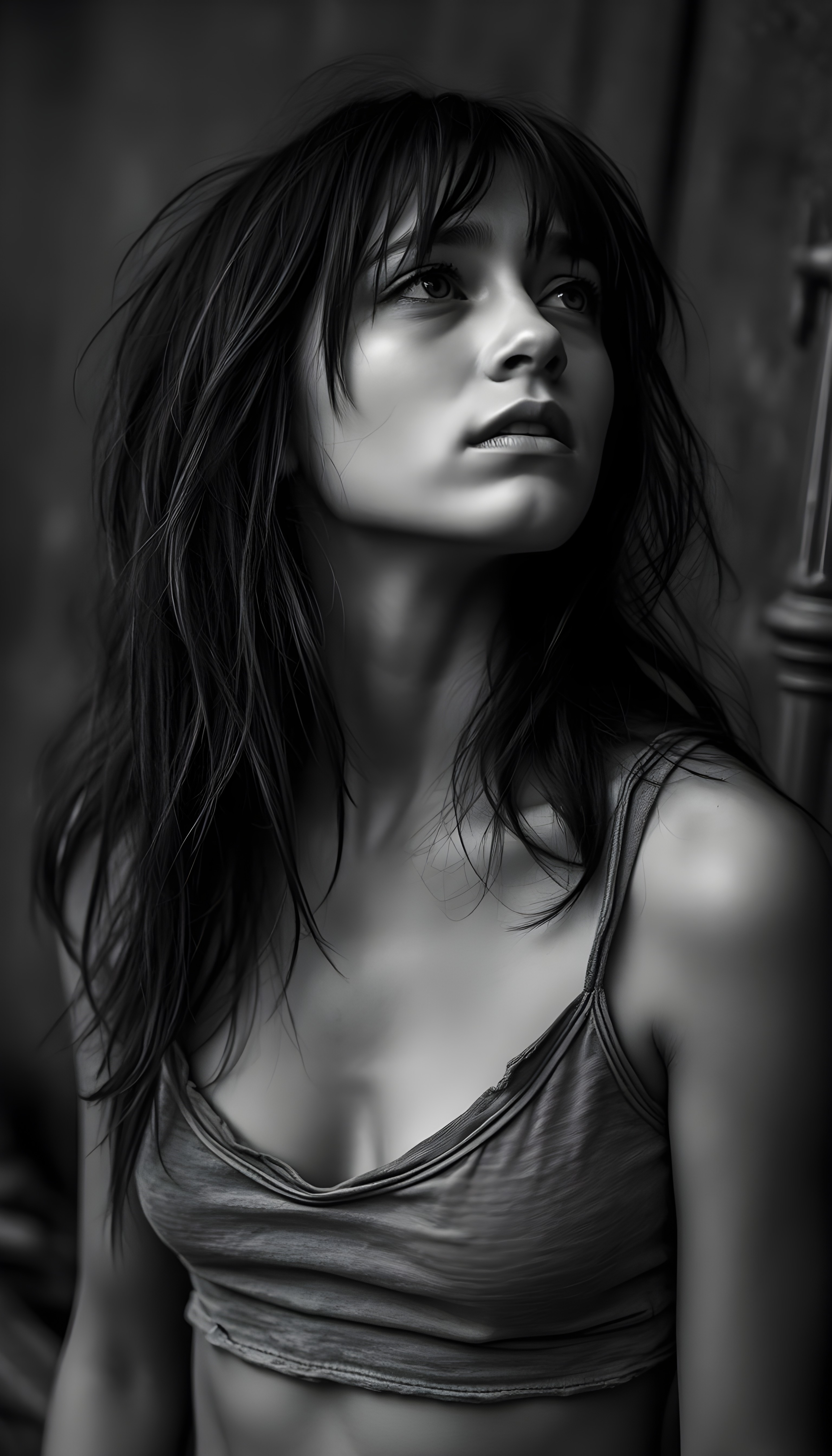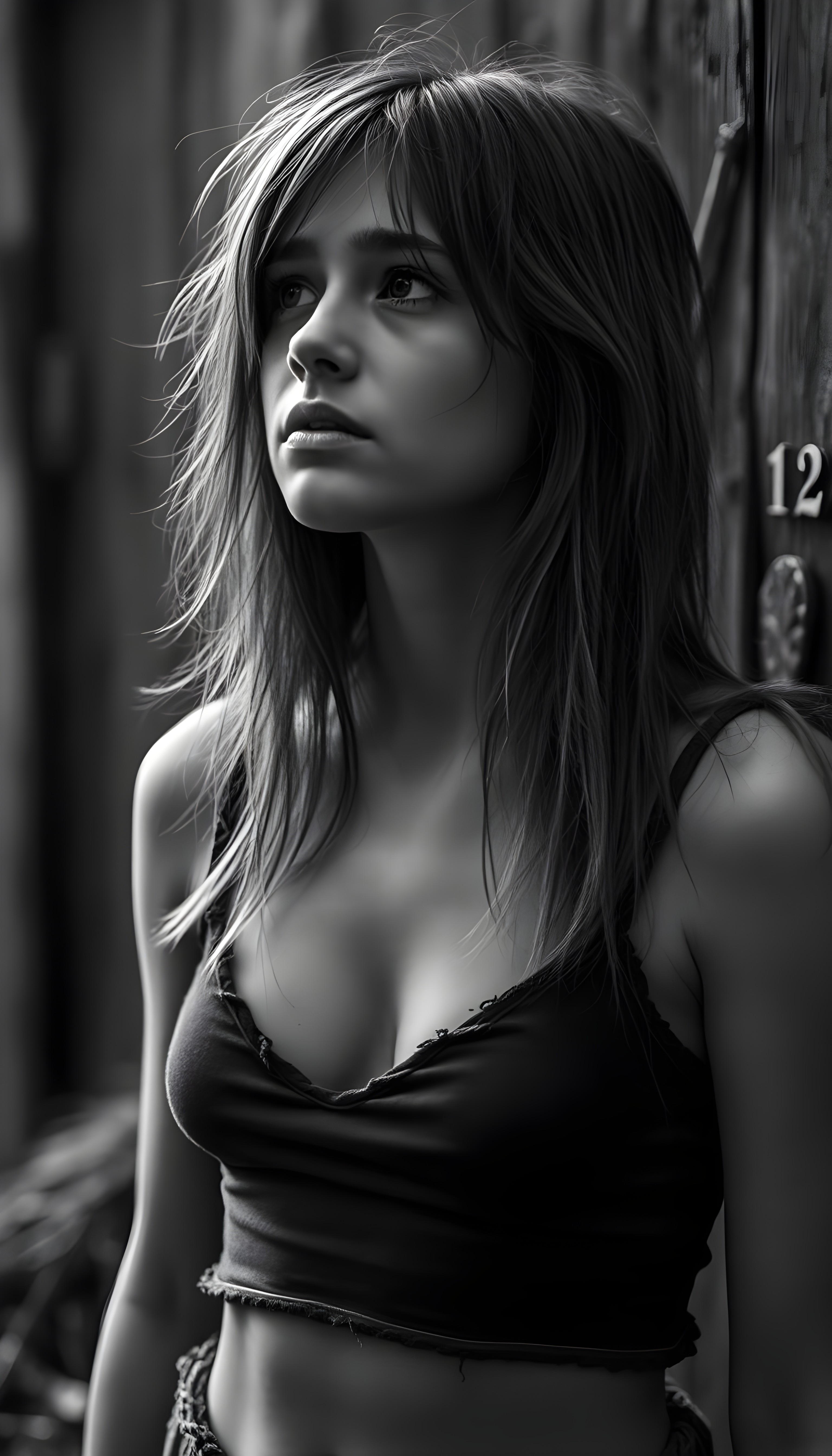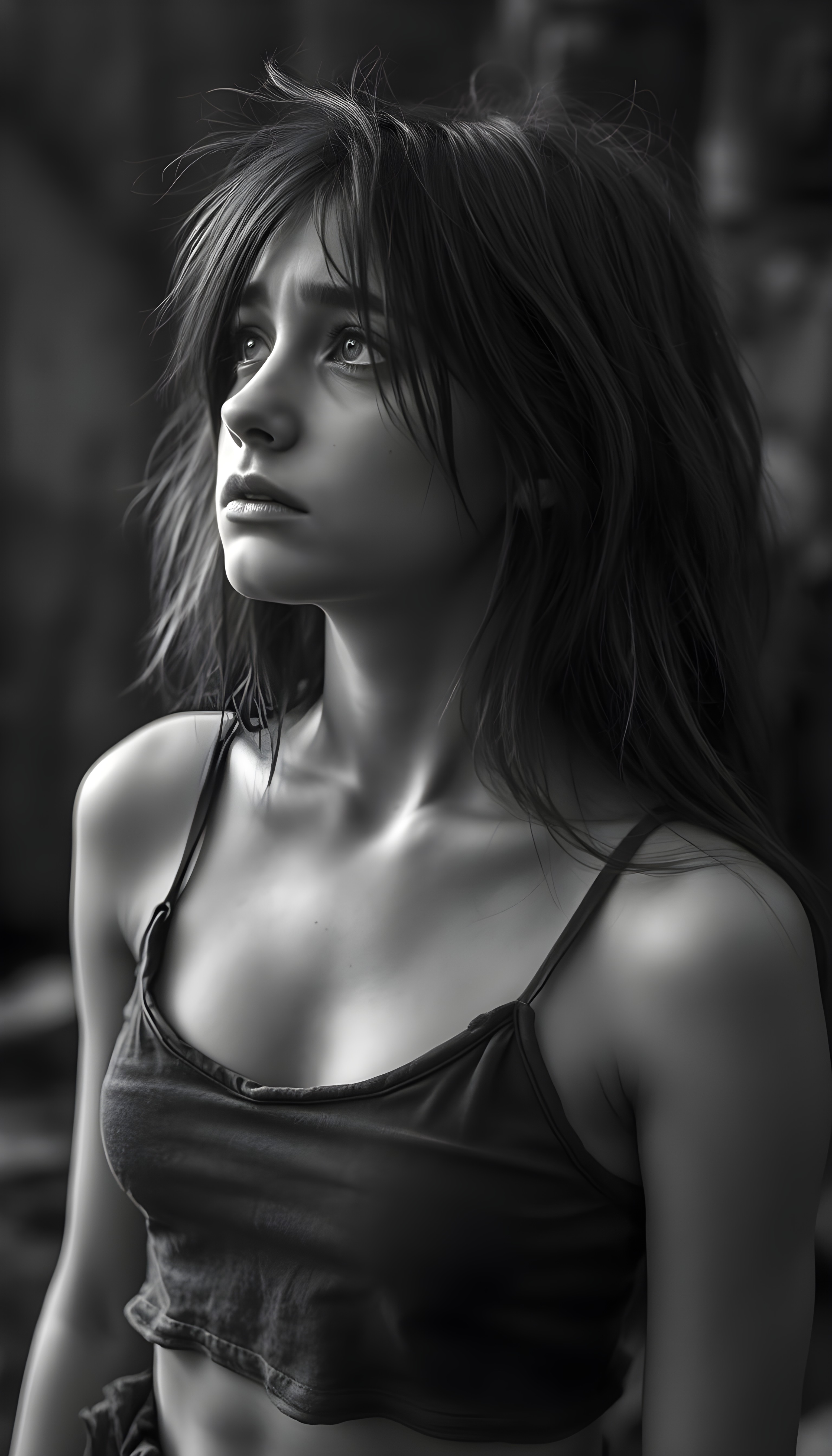 black and white detailed photo: a young teen girl. She is poor and scantily tattered dressed in a cropped tank top, deep v-neck, busty. ((She cries and thick tears roll down her cheeks)). She is alone. Her long straight slightly wavy hair is disheveled and dirty. She looks sadly up, side view.