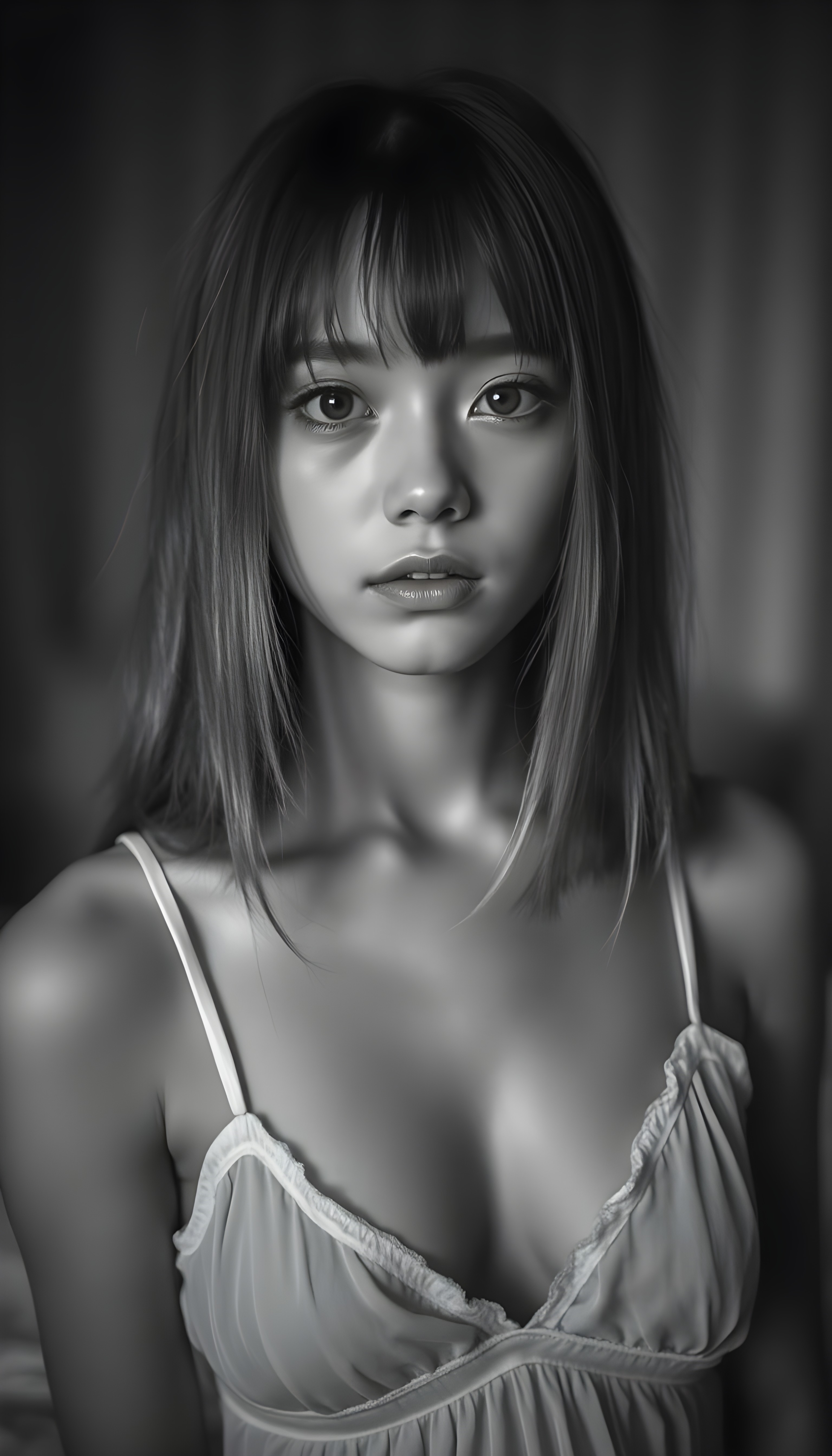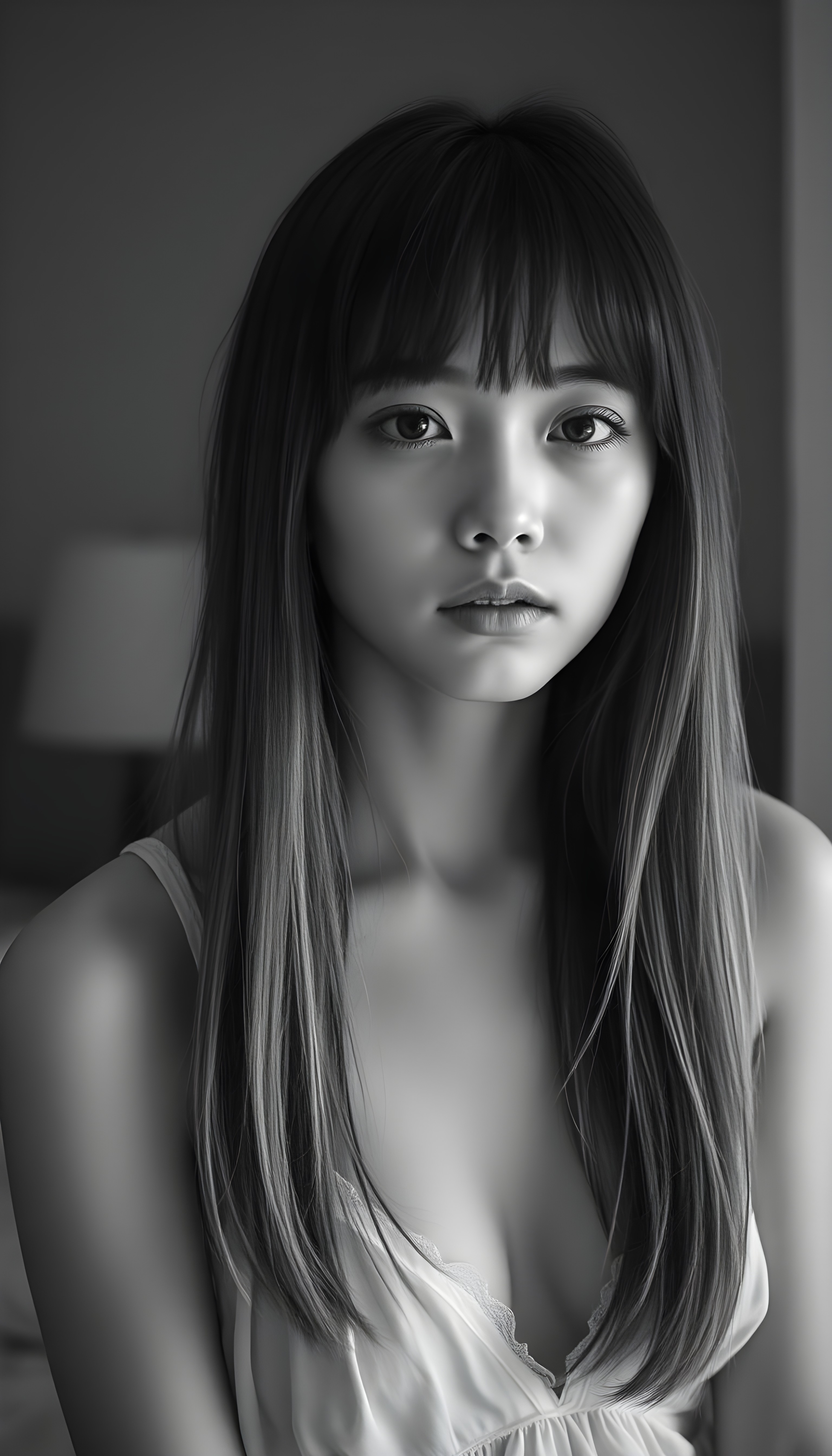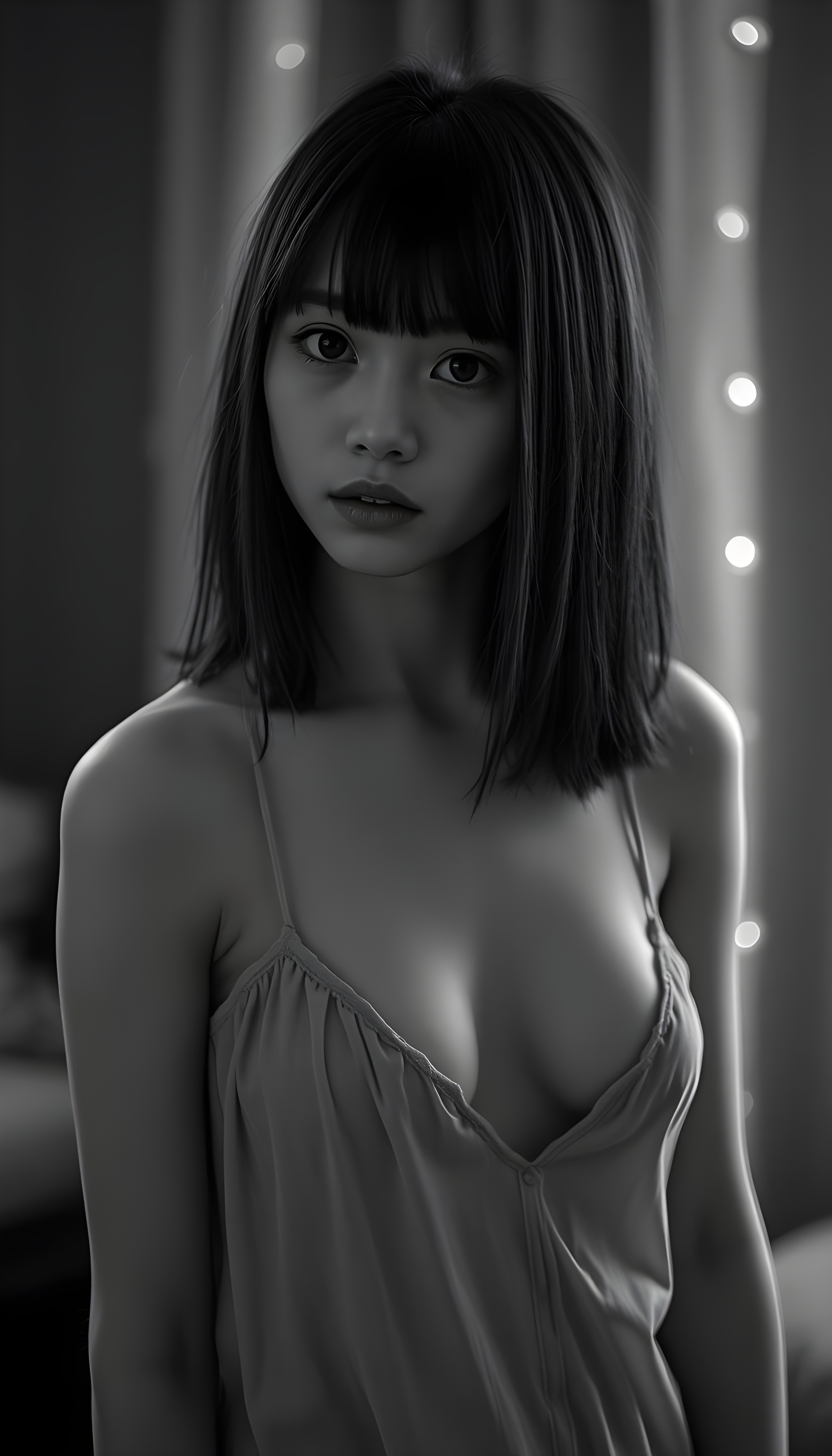 black and white detailed photo: from a (((cute))) (((elegant))) ((attractive)) (((straight hair, same length left and right, falls down))) ((stunning)) a beautifully realistic, cinematic lights, ((teen girl)), 18 years old, getting ready for bed in a short, translucent low cut nightgown, bangs cut, realistic detailed angelic round face, looks tired at the camera