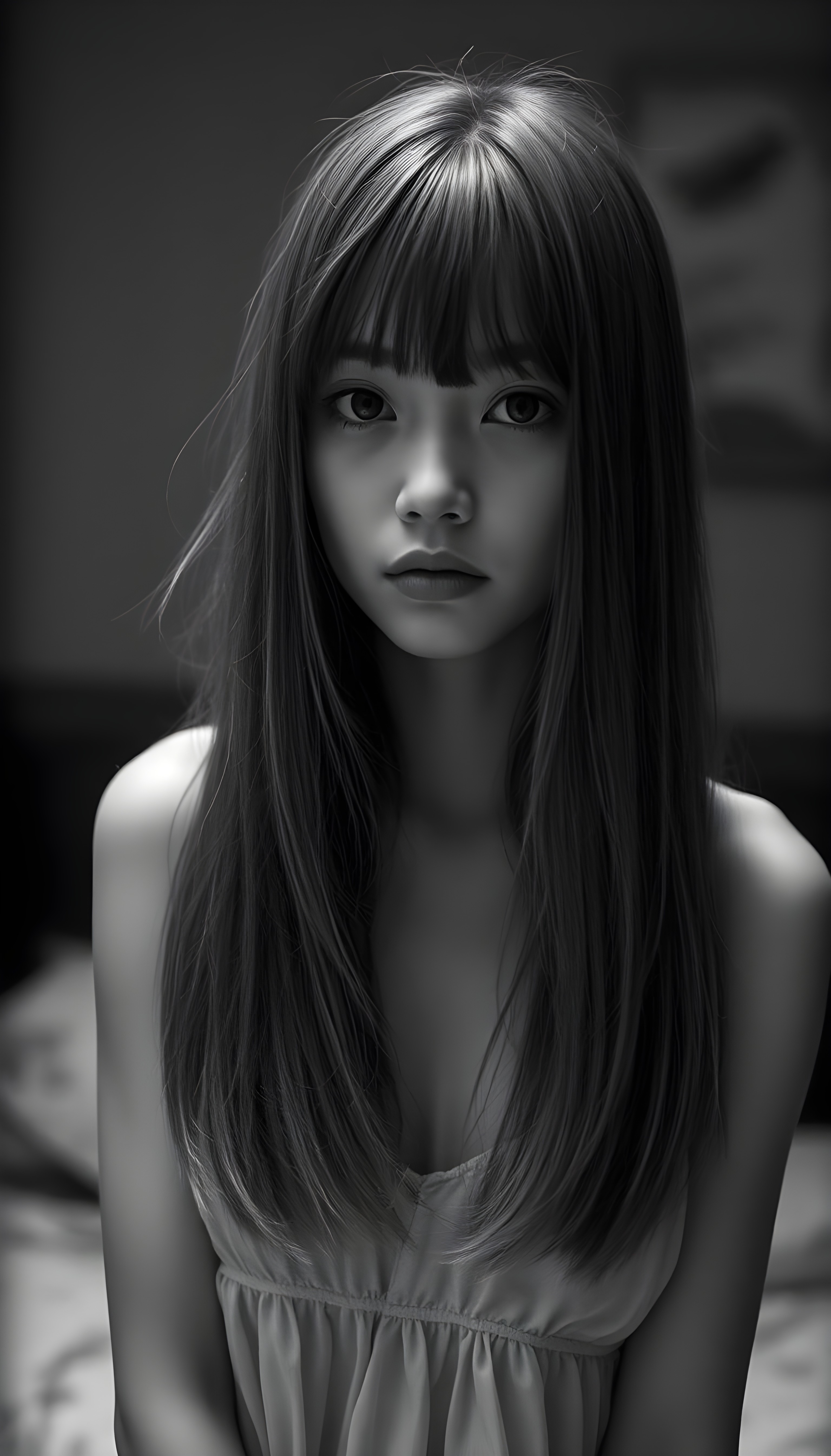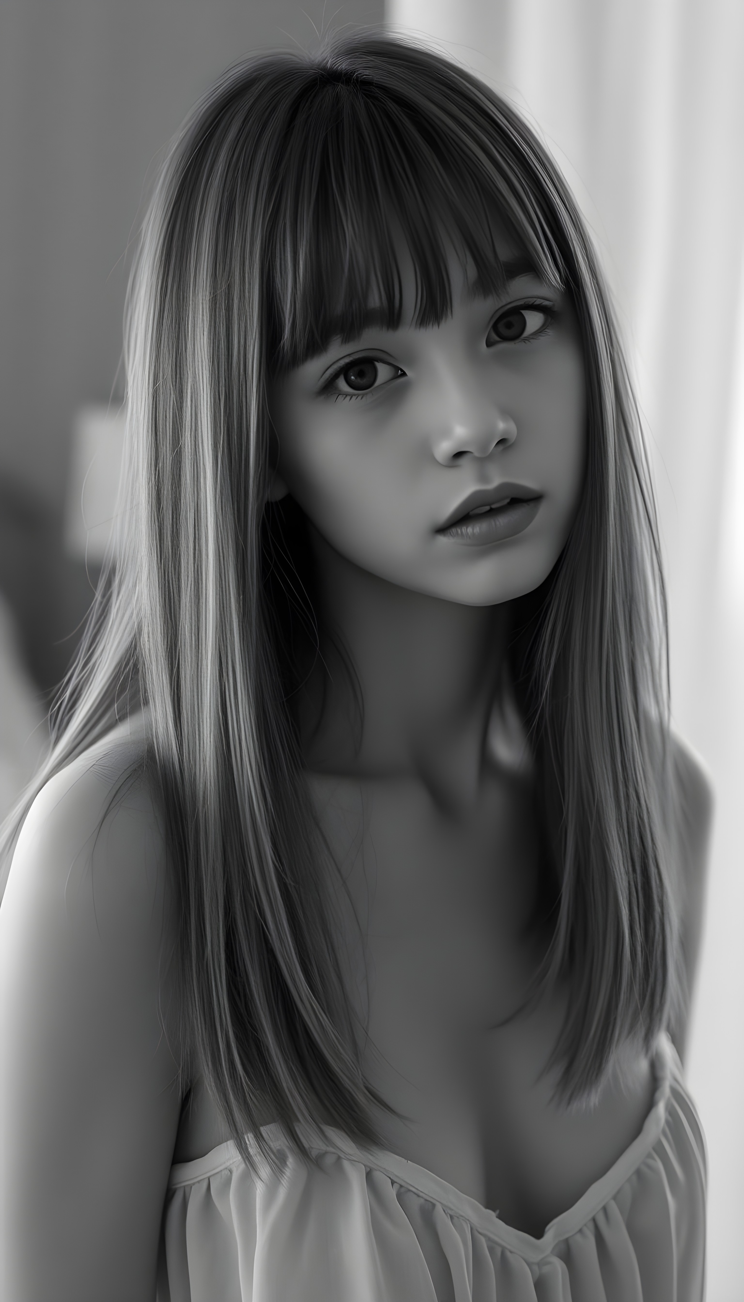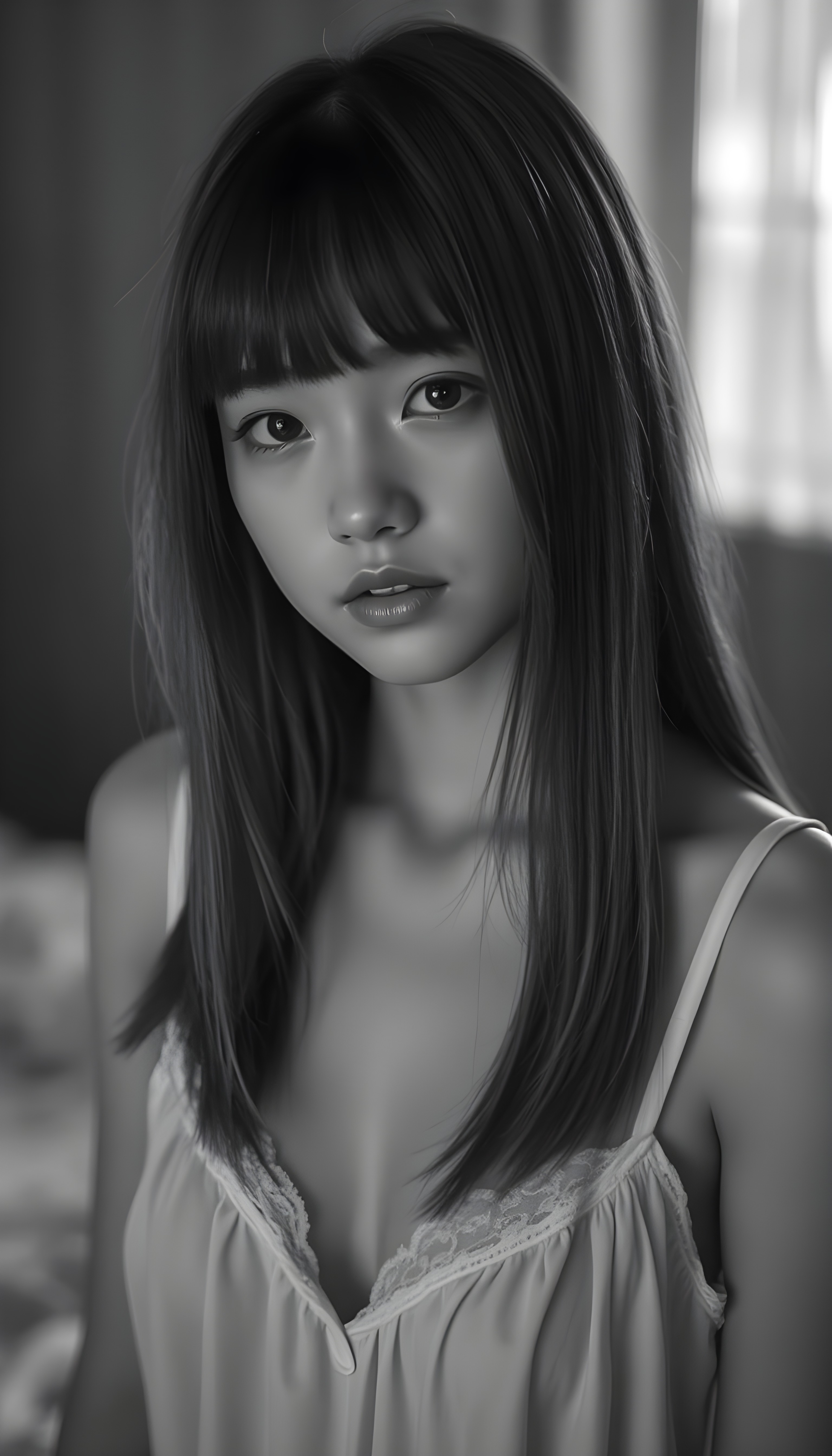 black and white detailed photo: from a (((cute))) (((elegant))) ((attractive)) (((straight hair, same length left and right, falls down))) ((stunning)) a beautifully realistic, cinematic lights, ((teen girl)), 18 years old, getting ready for bed in a short, translucent low cut nightgown, bangs cut, realistic detailed angelic round face, looks tired at the camera