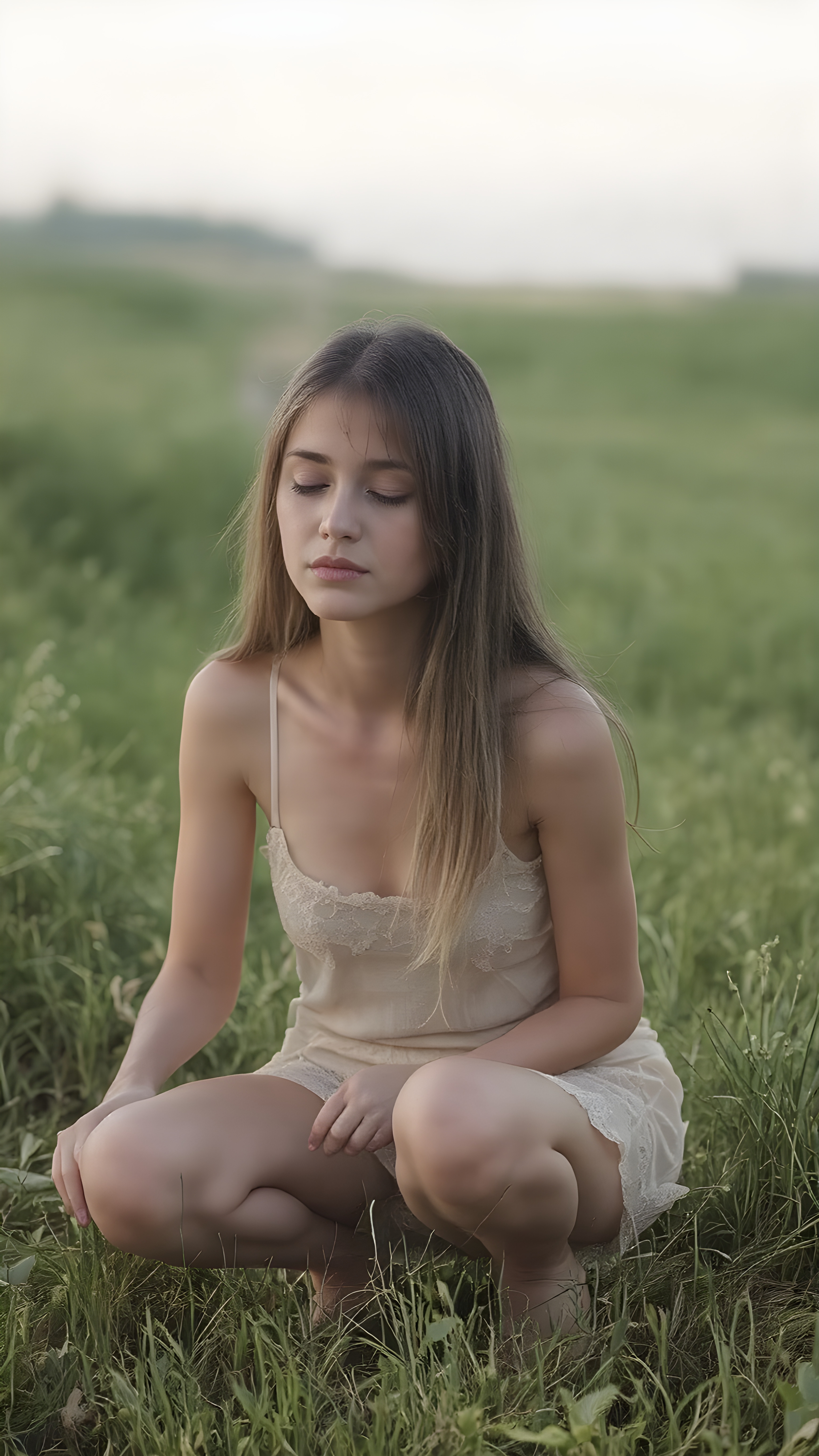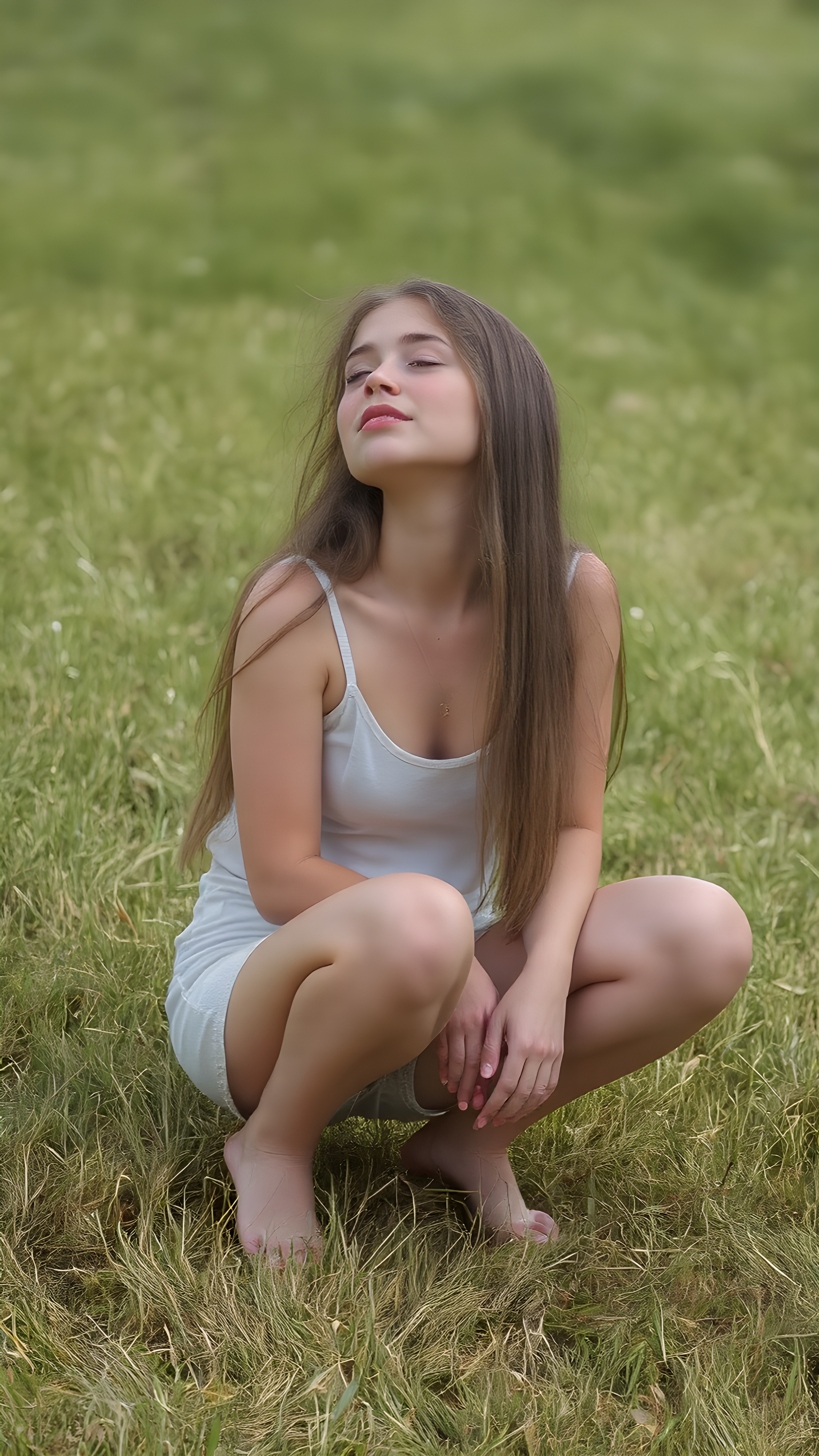 a fantastic pretty girl is squatting on a green meadow. She is wearing a short skirt and a tank top, closed eyes, looks up, long straight hair falls down back