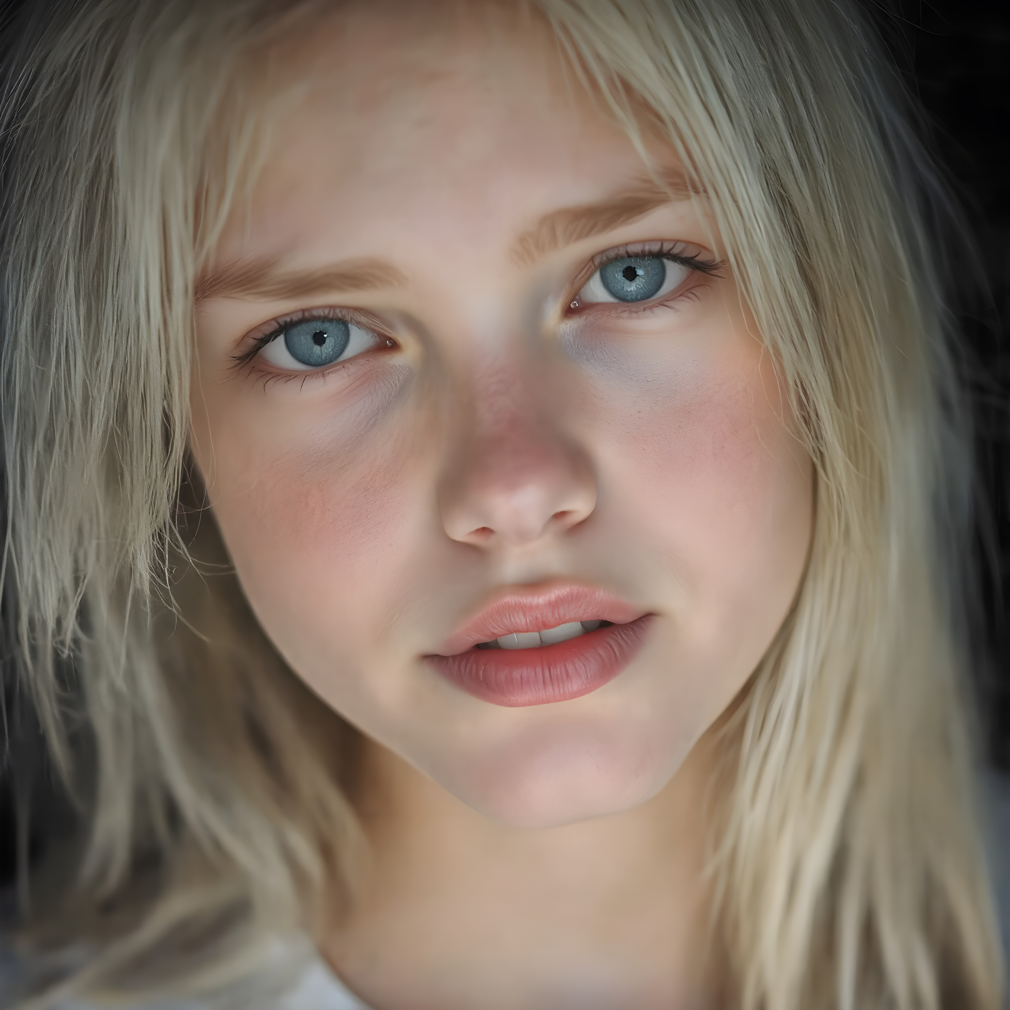 a beautifully super realistic and detailed close up photo, (((young cute teen girl))), with straight soft long white realistic hair, deep blue eyes, round face, which accentuates her perfect collarbones, and a seductive smile that captures the viewer’s attention. Her flawless silver skin is visible in full detail, as is her slightly parted lips and piercing gaze, which draws the viewer in for an intimate close-up. Her mouth is slightly open, white teeth, she is wearing a white short t-shirt, all against a black backdrop